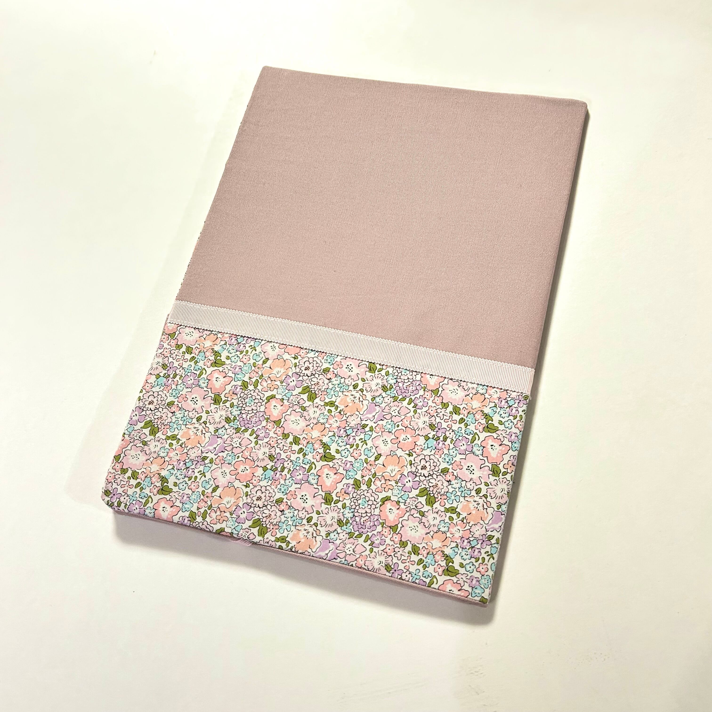 ピンクとパープル・ブルーの花柄のリバティ生地を使用した素敵な紙ばさみです。ピンクのグログランテープにグログランリボンをおつけした上品なお品です。開閉はお子様でも使いやすいゴム仕様です。