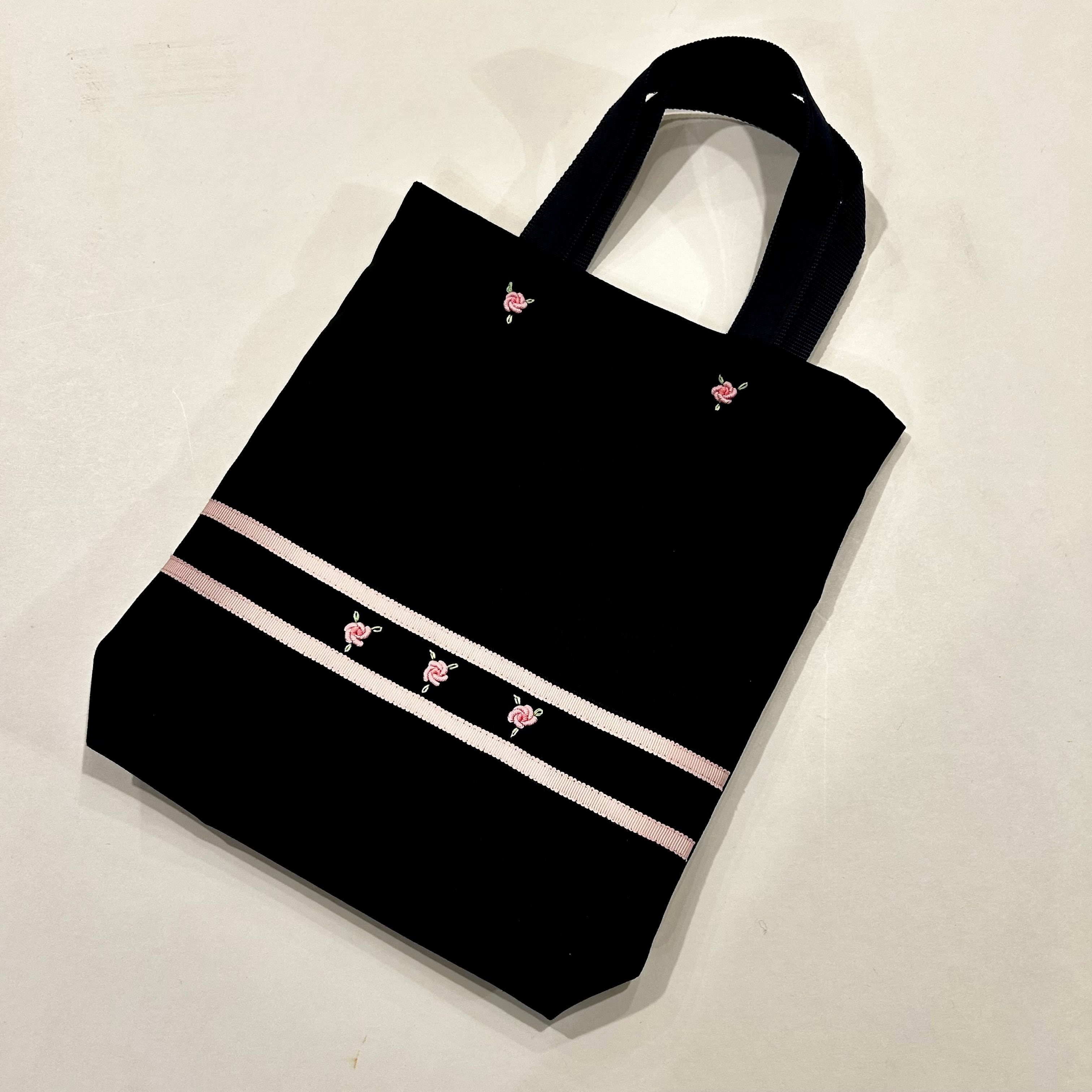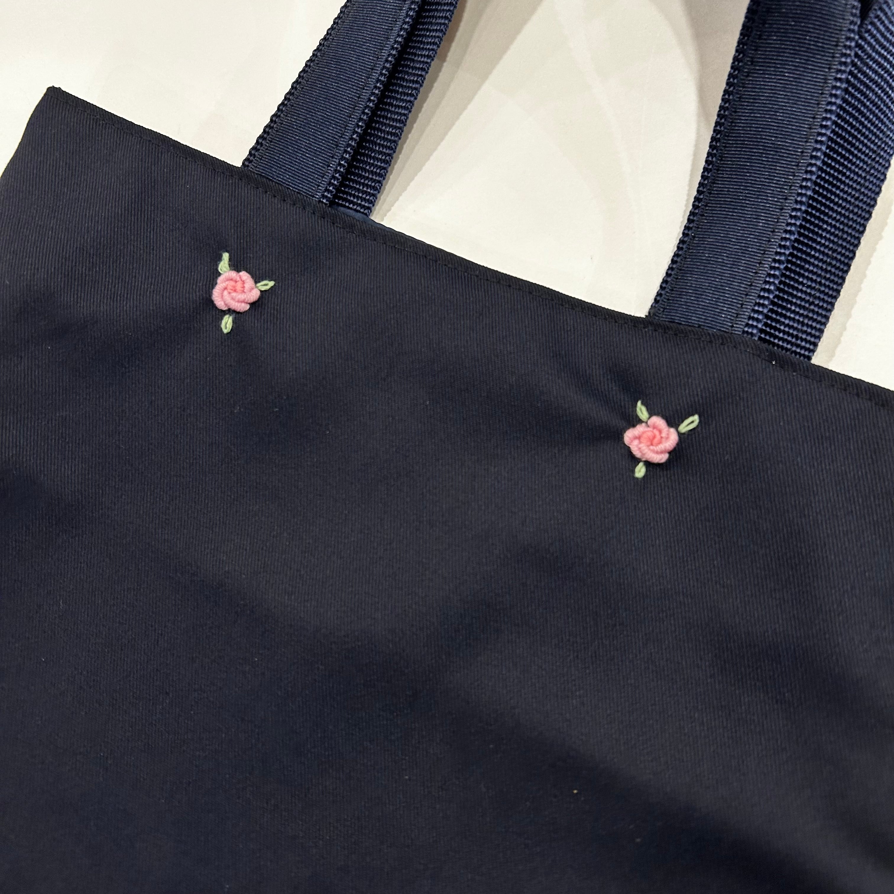 持ち手部分にもピンクのバリオンローズ刺繍をおつけしました。
