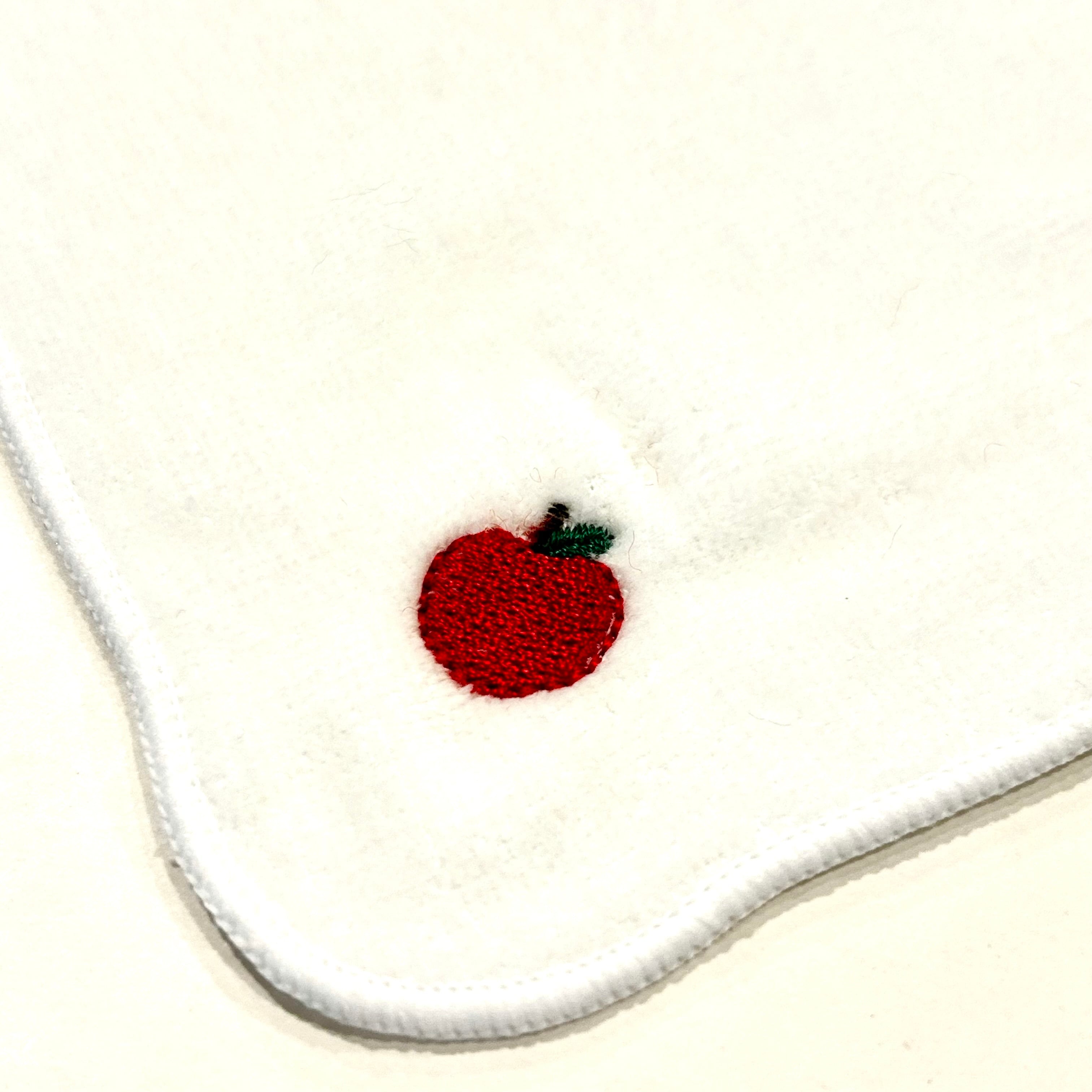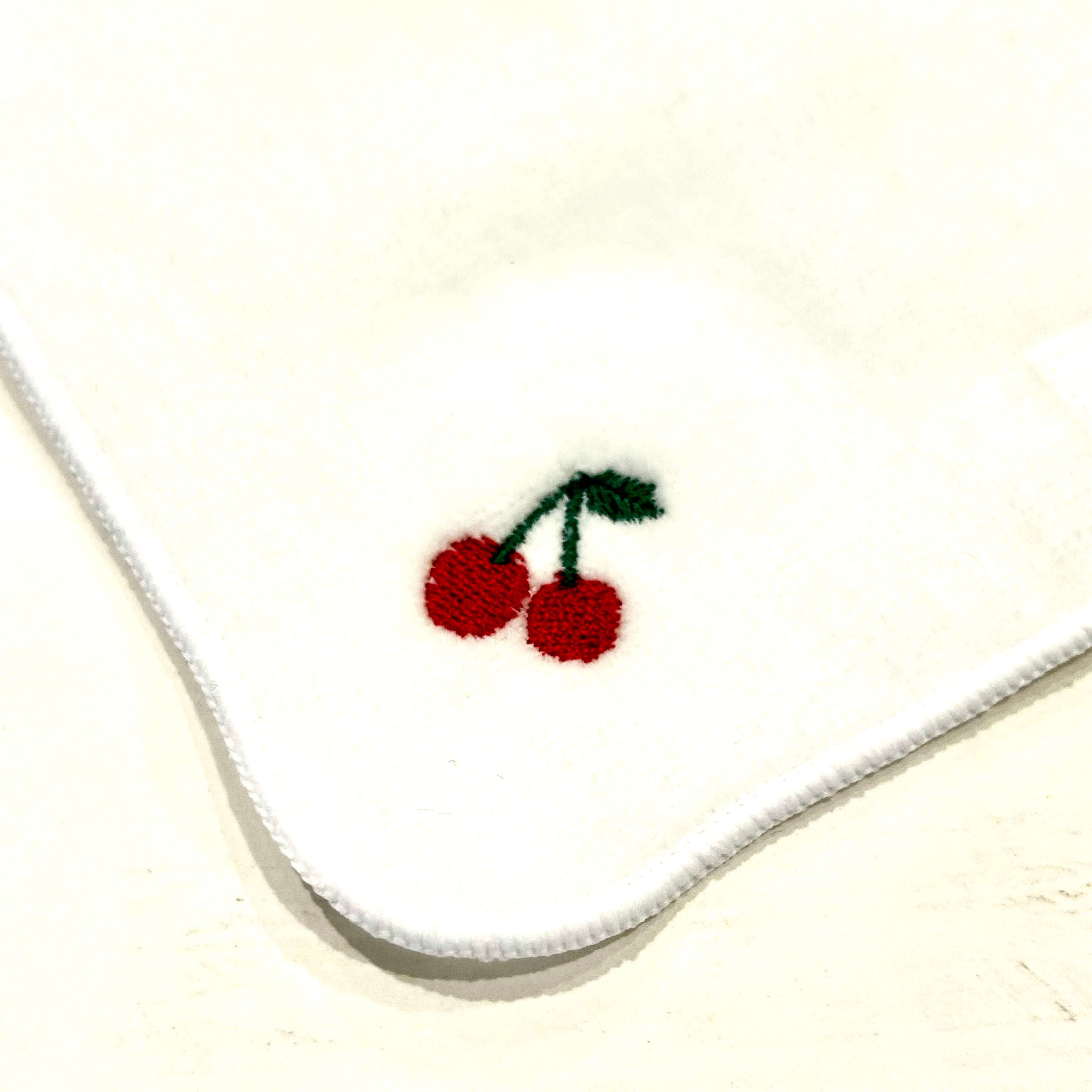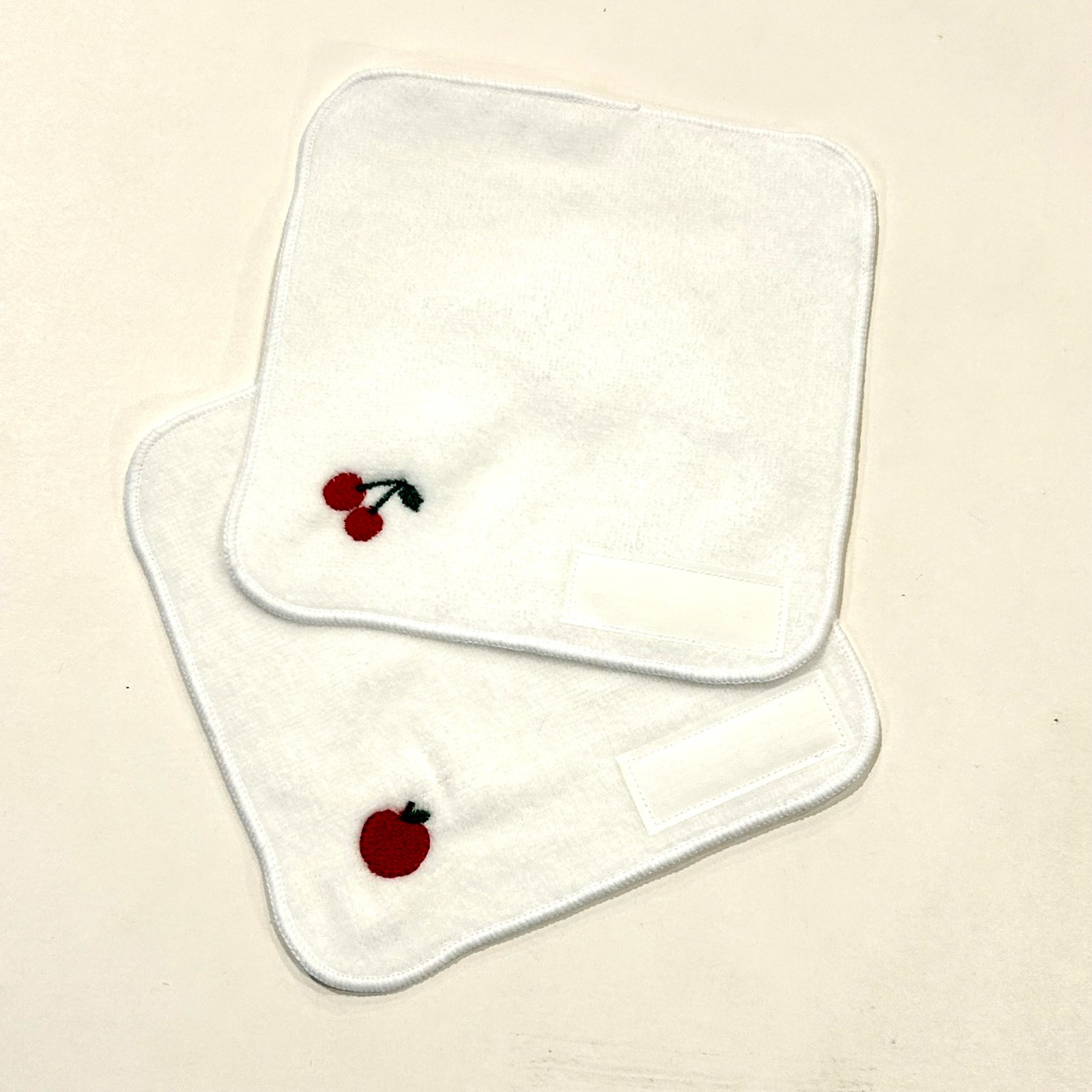 りんごとサクランボの刺繍をおつけした可愛いタオルハンカチ2枚セットです。小さなお子様が大好きなフルーツシリーズです。お名前シールもついています。