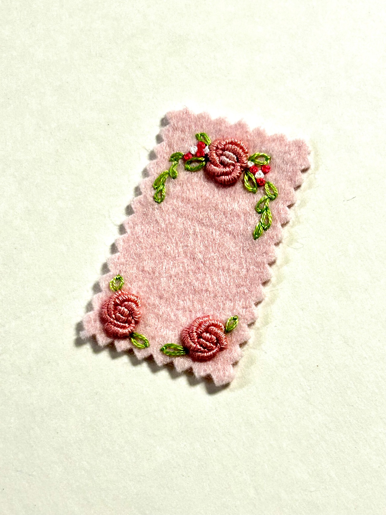 ピンクのフエルト地にピンクのバリオンローズ刺繍をおつけしました。
