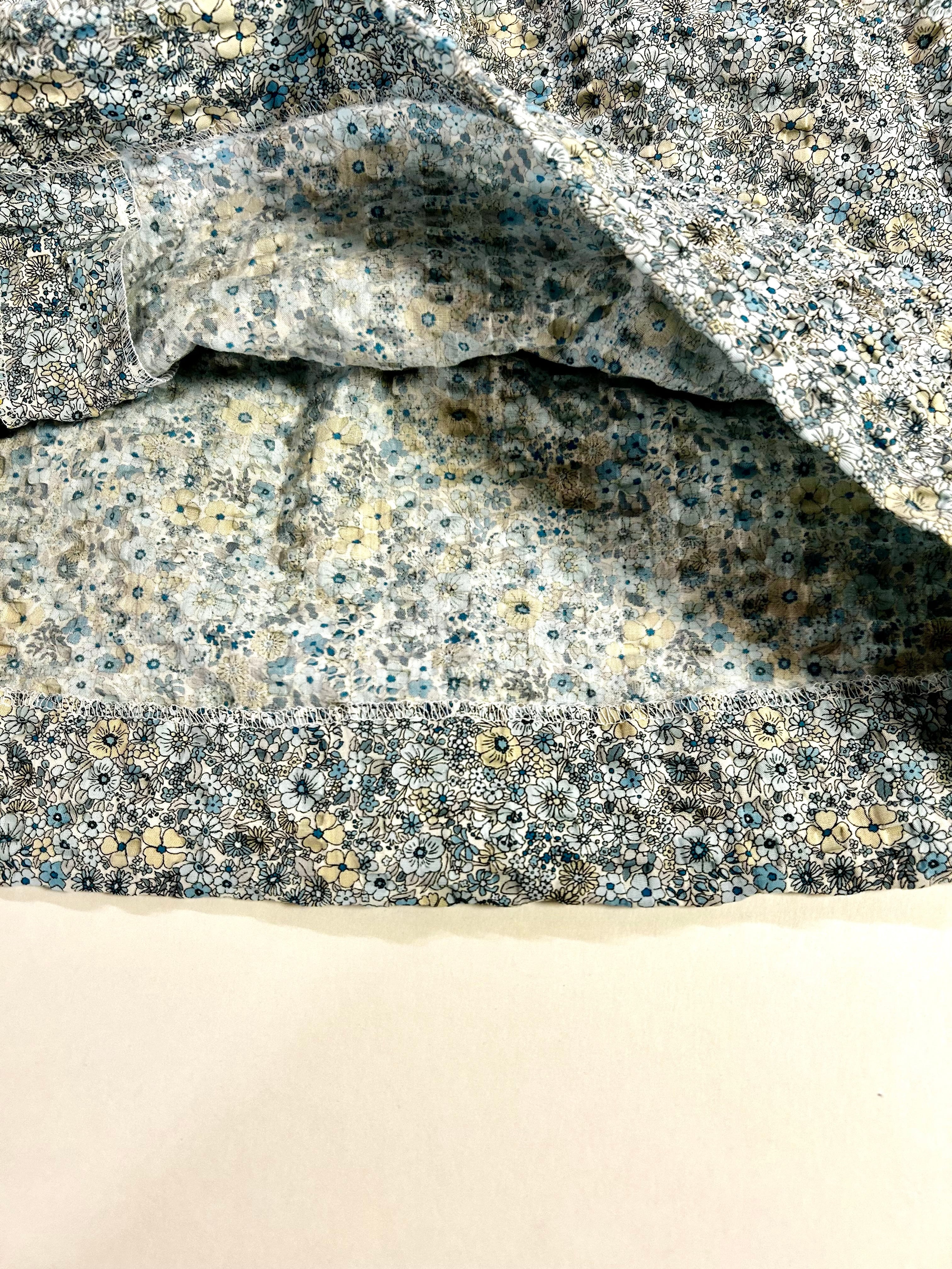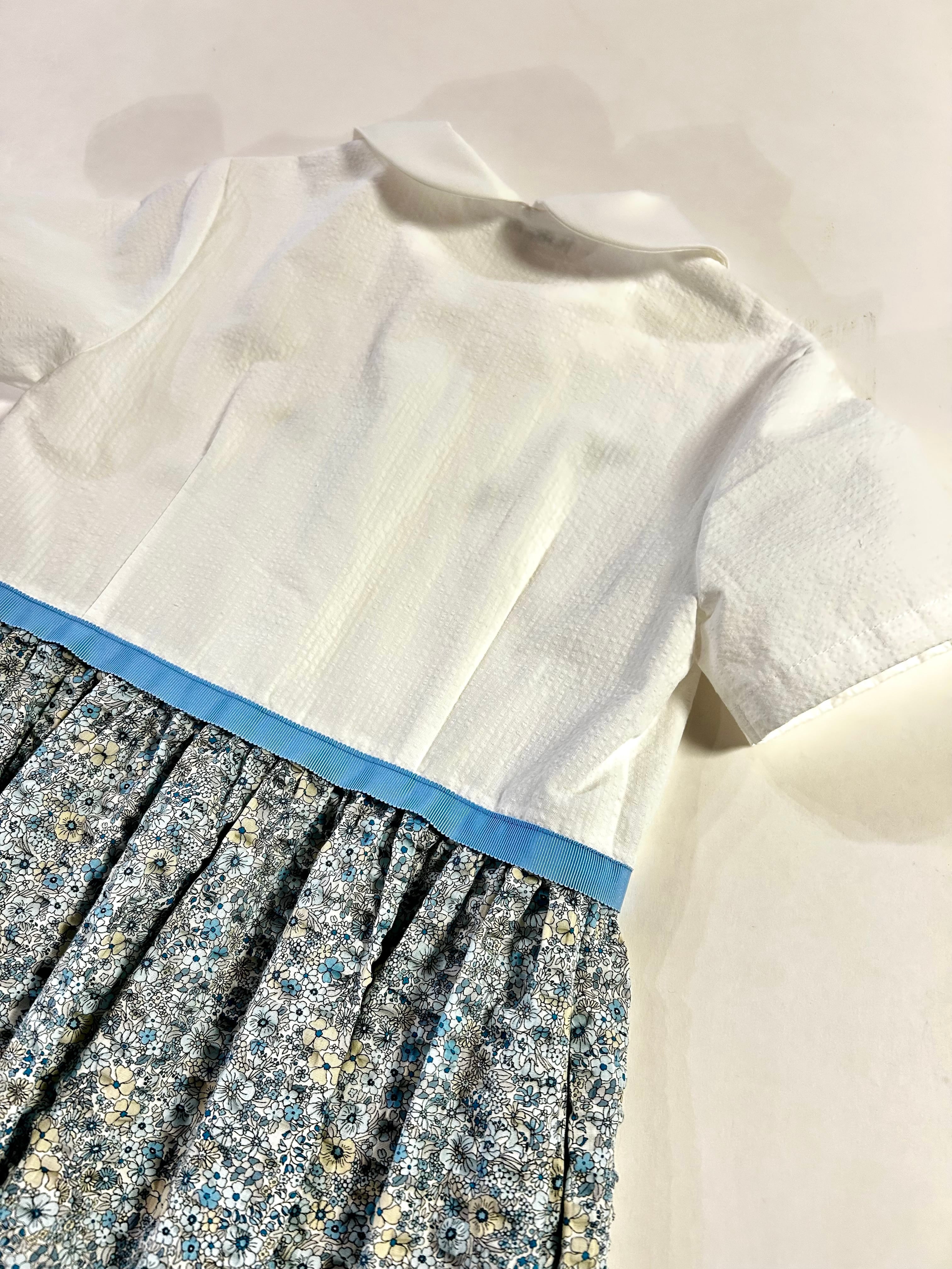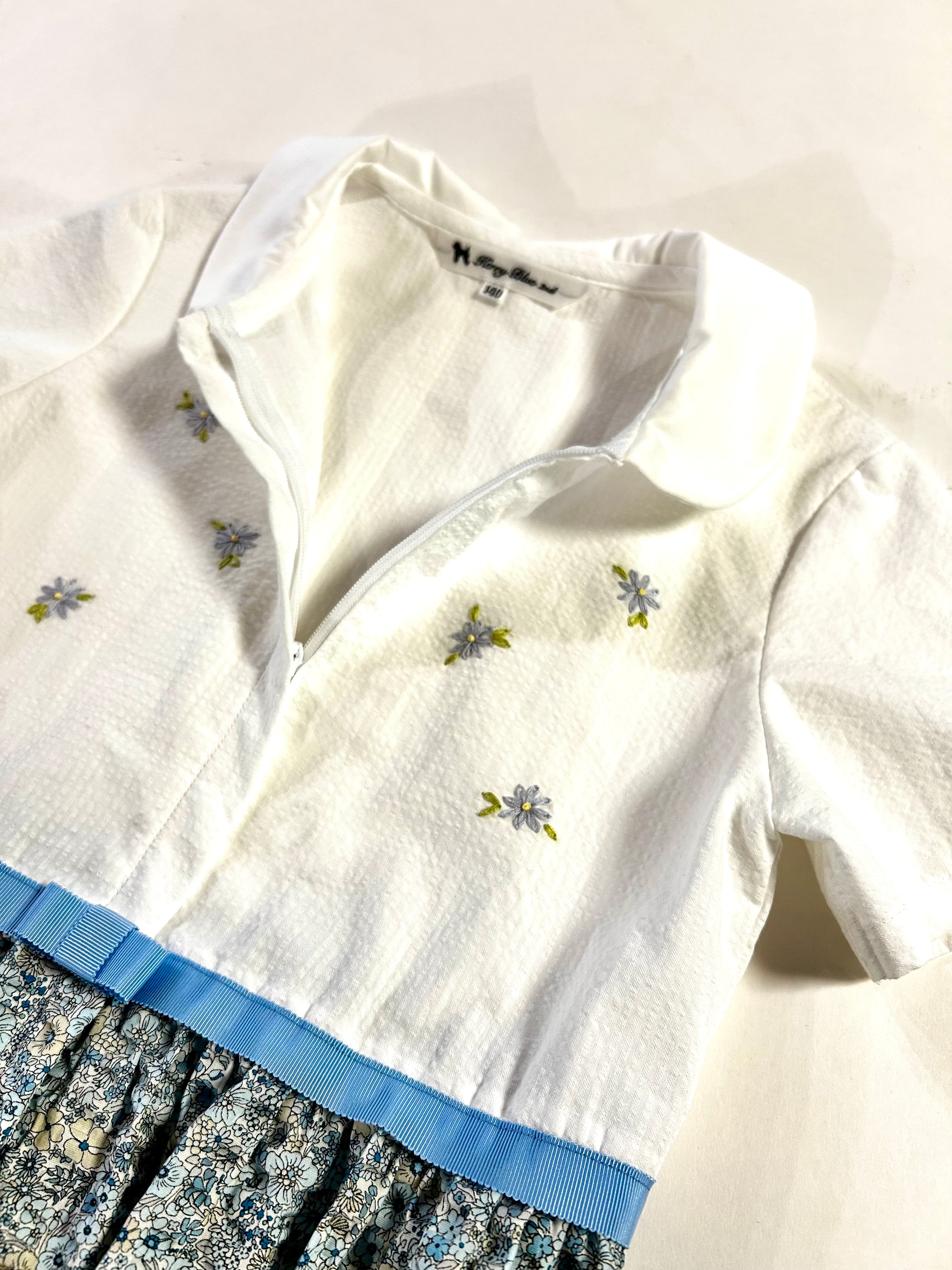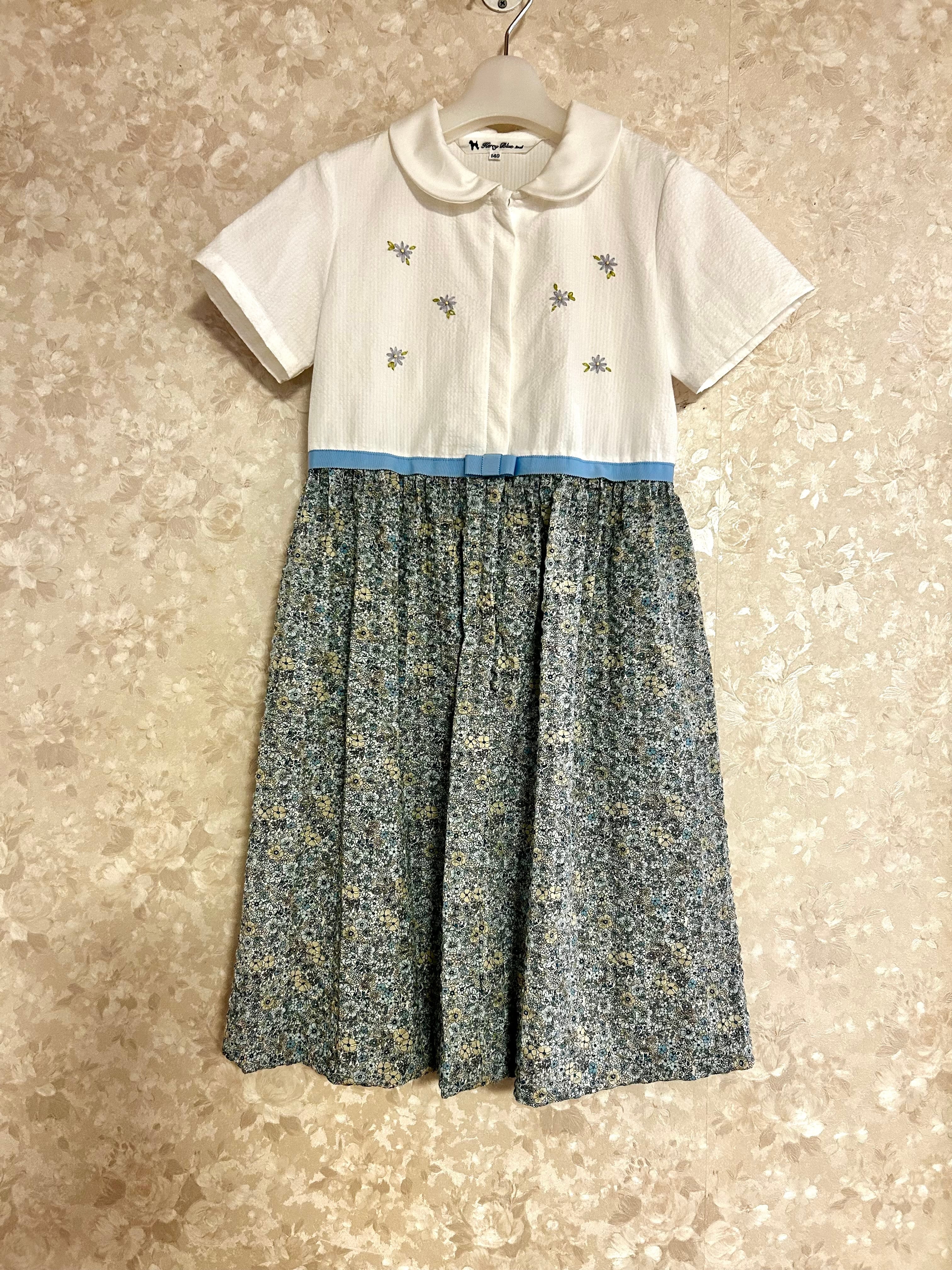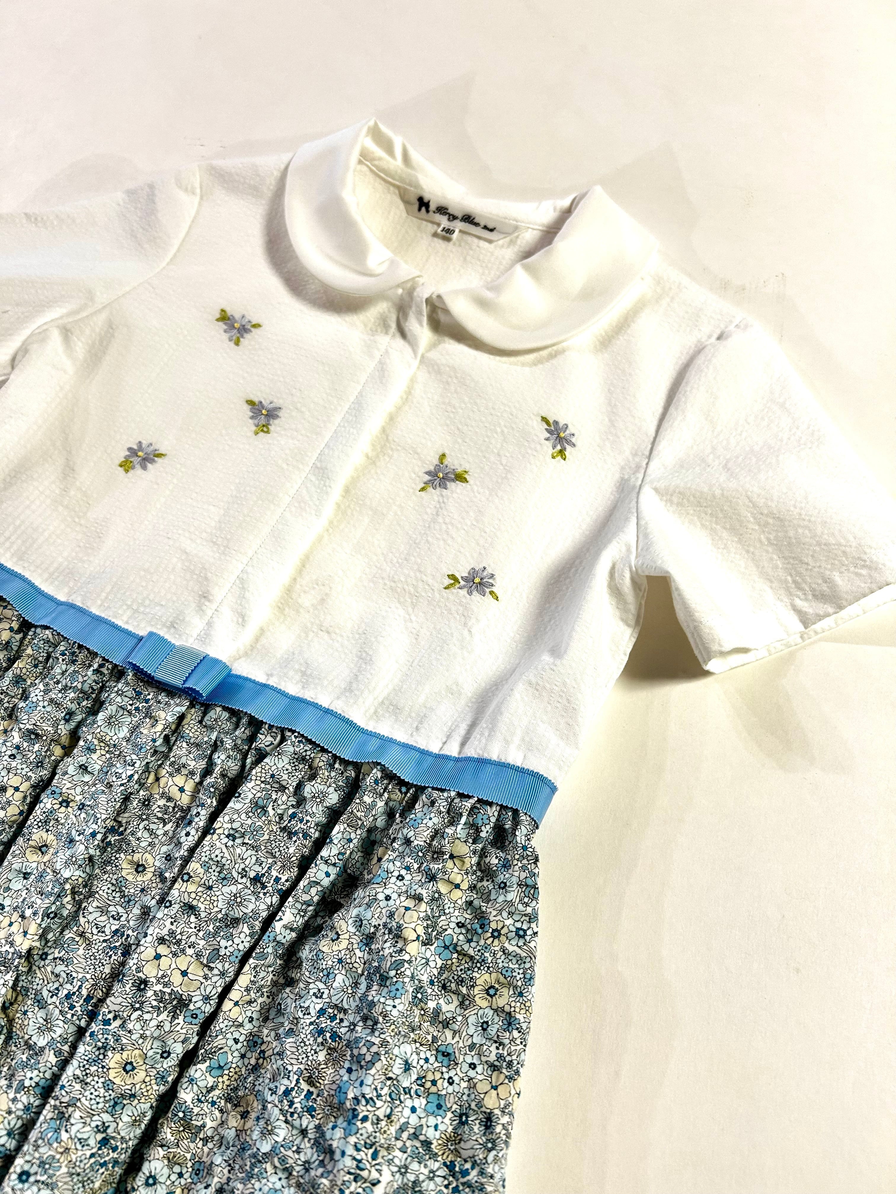スカート部分は白地にブルーとベージュの小花柄が可愛いサッカー地を使用していますのでノーアイロンでお召し頂けます。春・夏お召し頂ける素材感です。制服のない学校の通学用として、普段使いの通塾用として多用途にお使いいただけます。お着替えが必要なお稽古にも人気のワンピースです。(日本製)