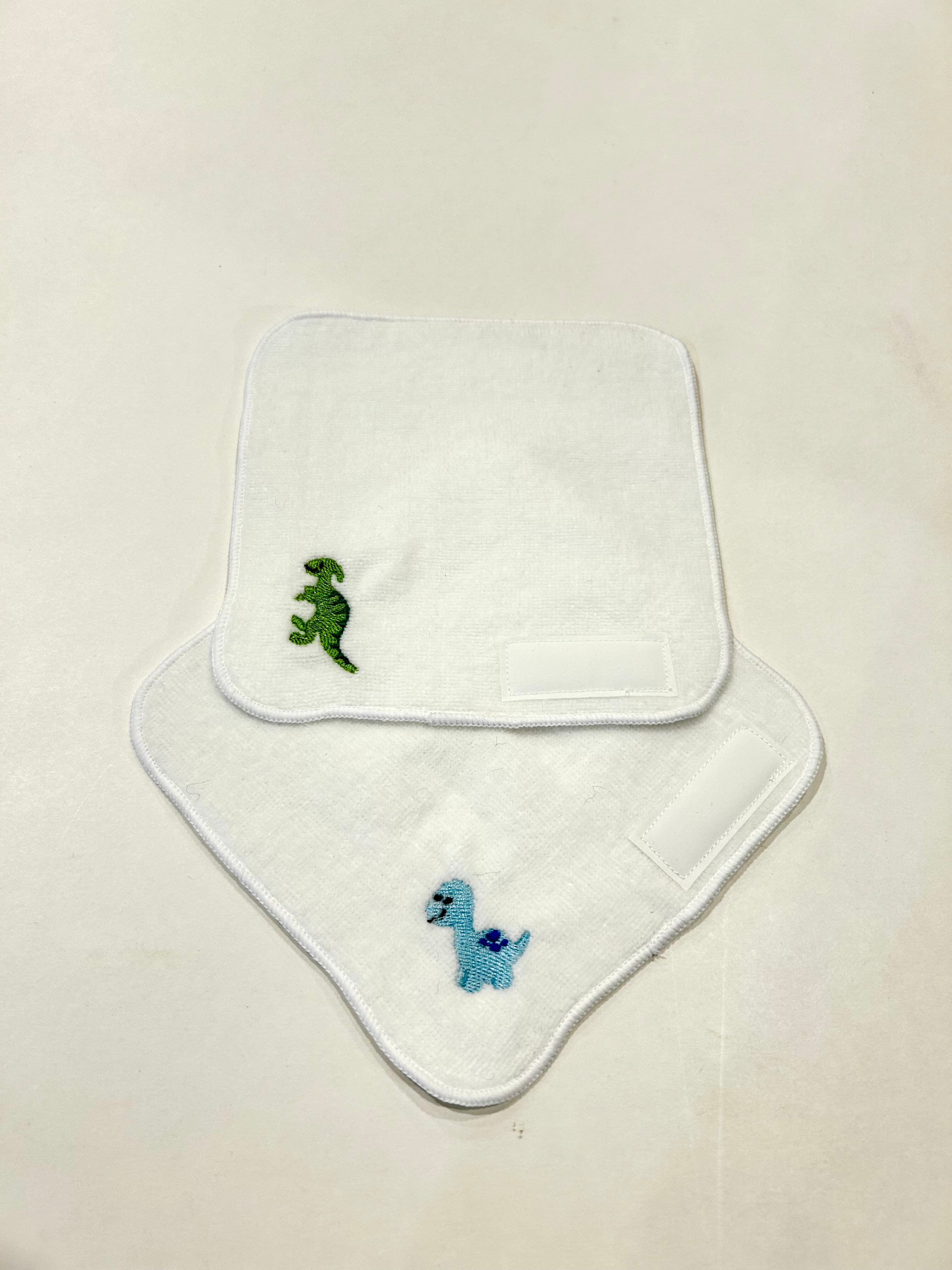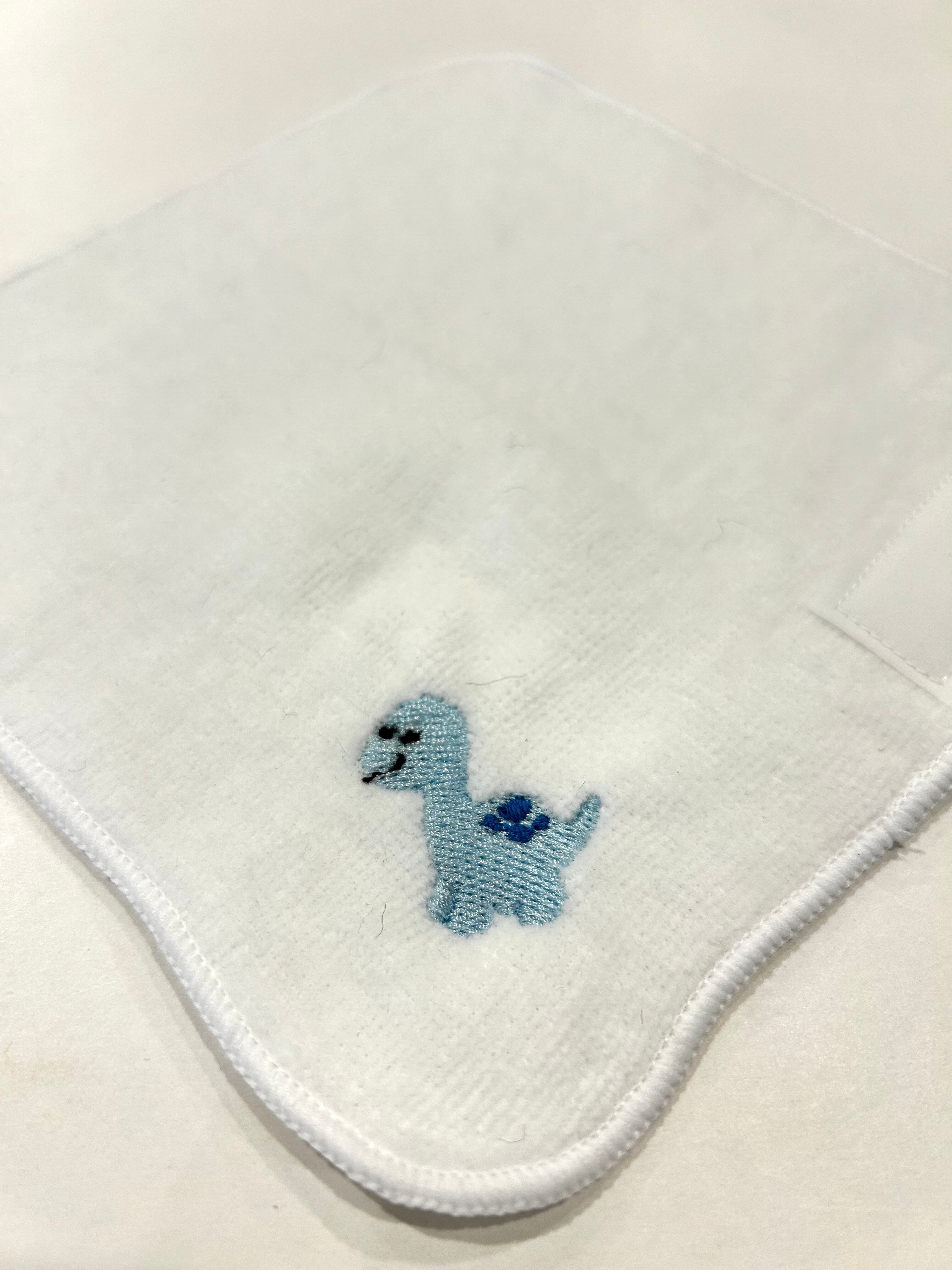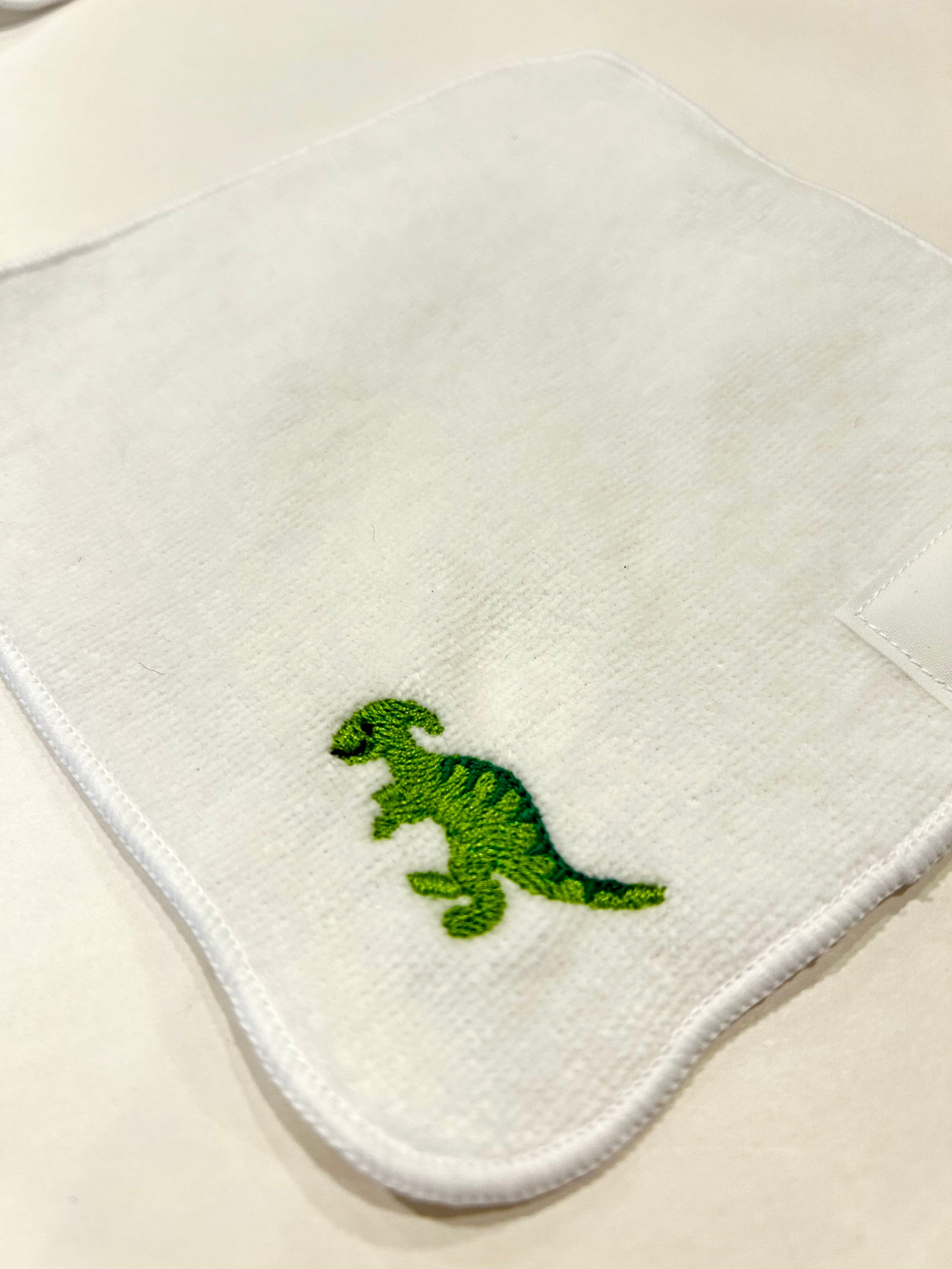 男の子が大好き恐竜の刺繍をおつけした可愛いタオルハンカチ2枚セットです。恐竜大好きな女の子にもお薦めです。お名前シールもついています。