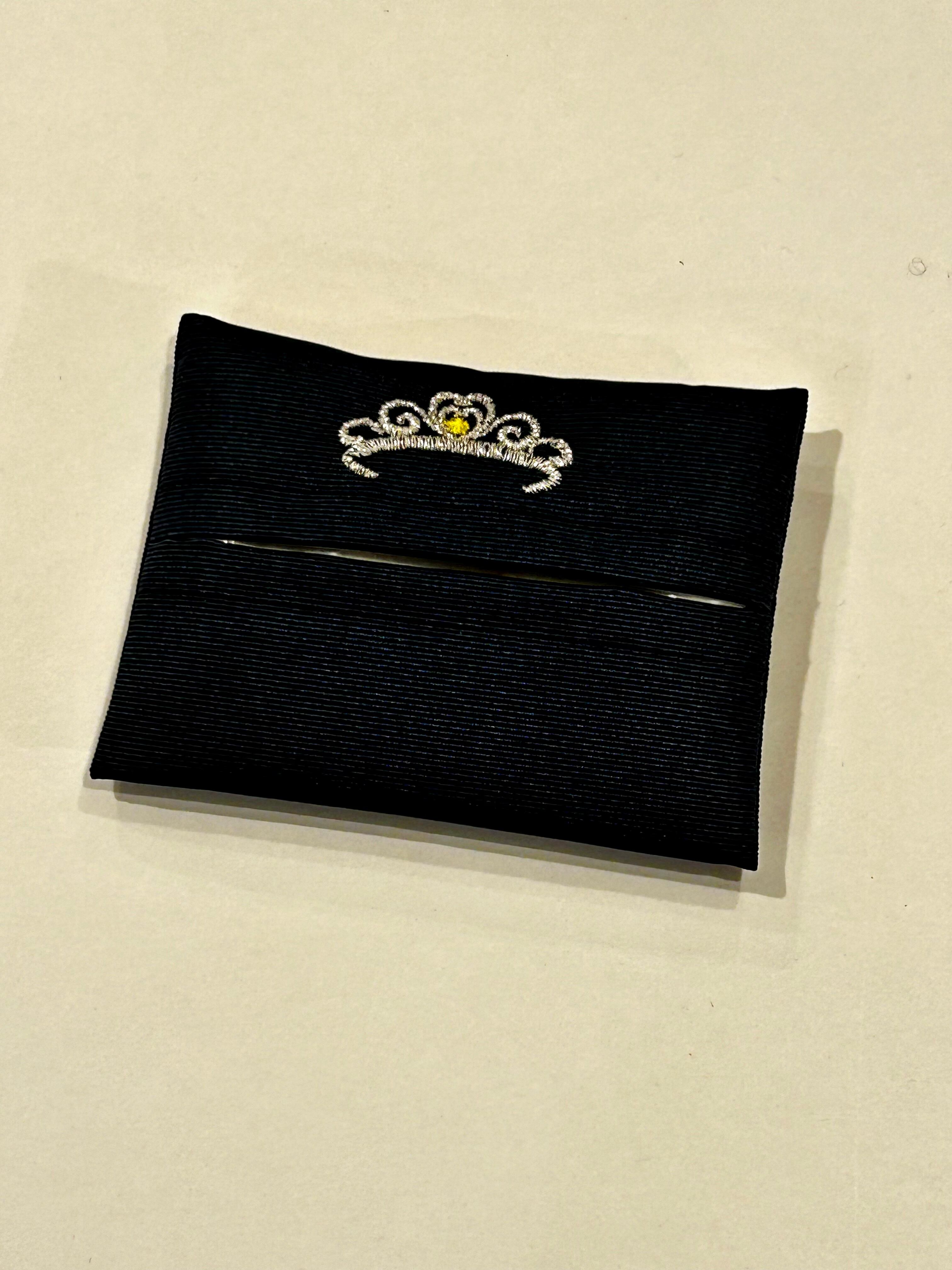 紺のグログラン地にシルバーのティアラの刺繍と音符のワッペンが可愛いミニミニティッシュケースです。