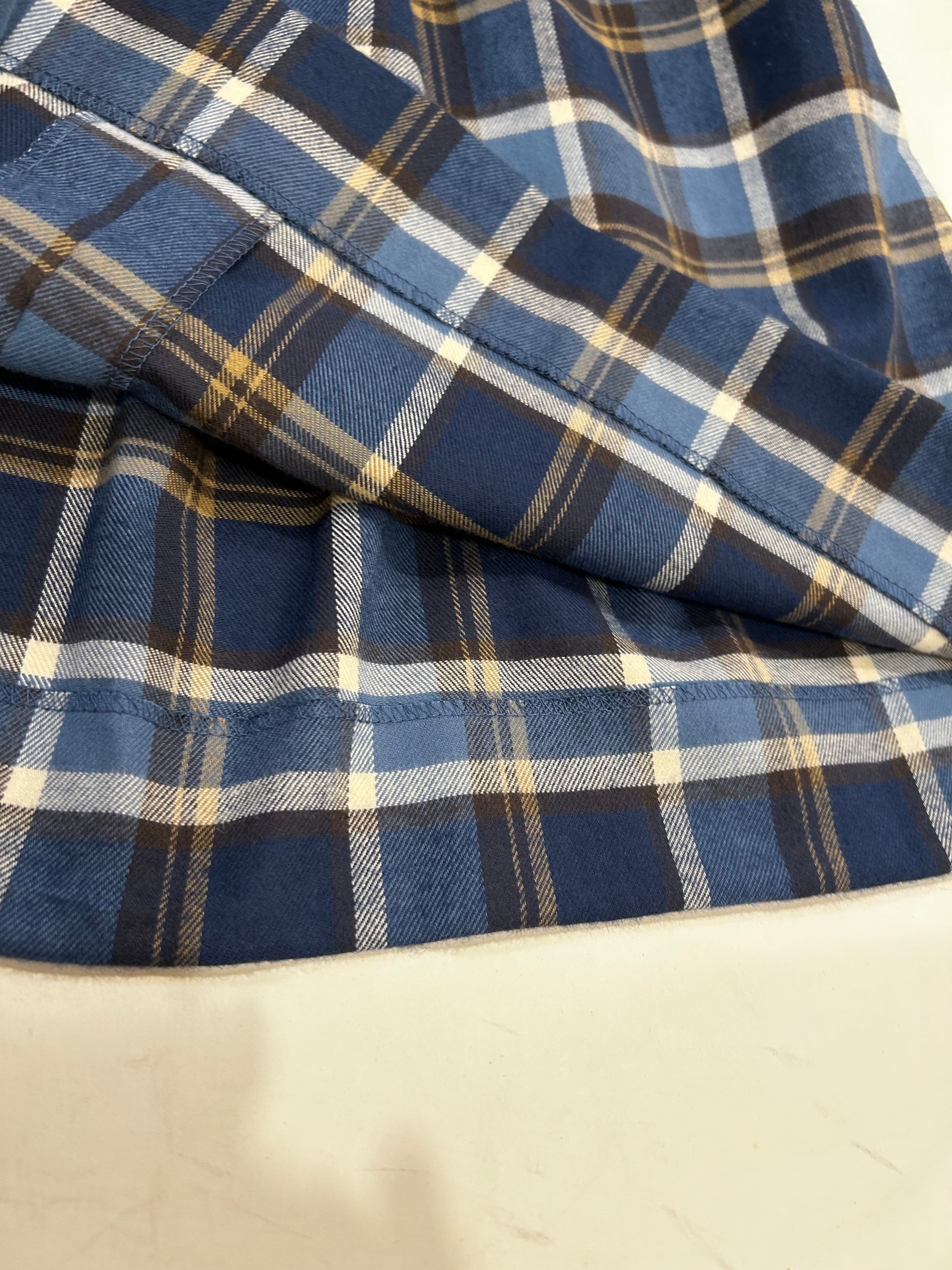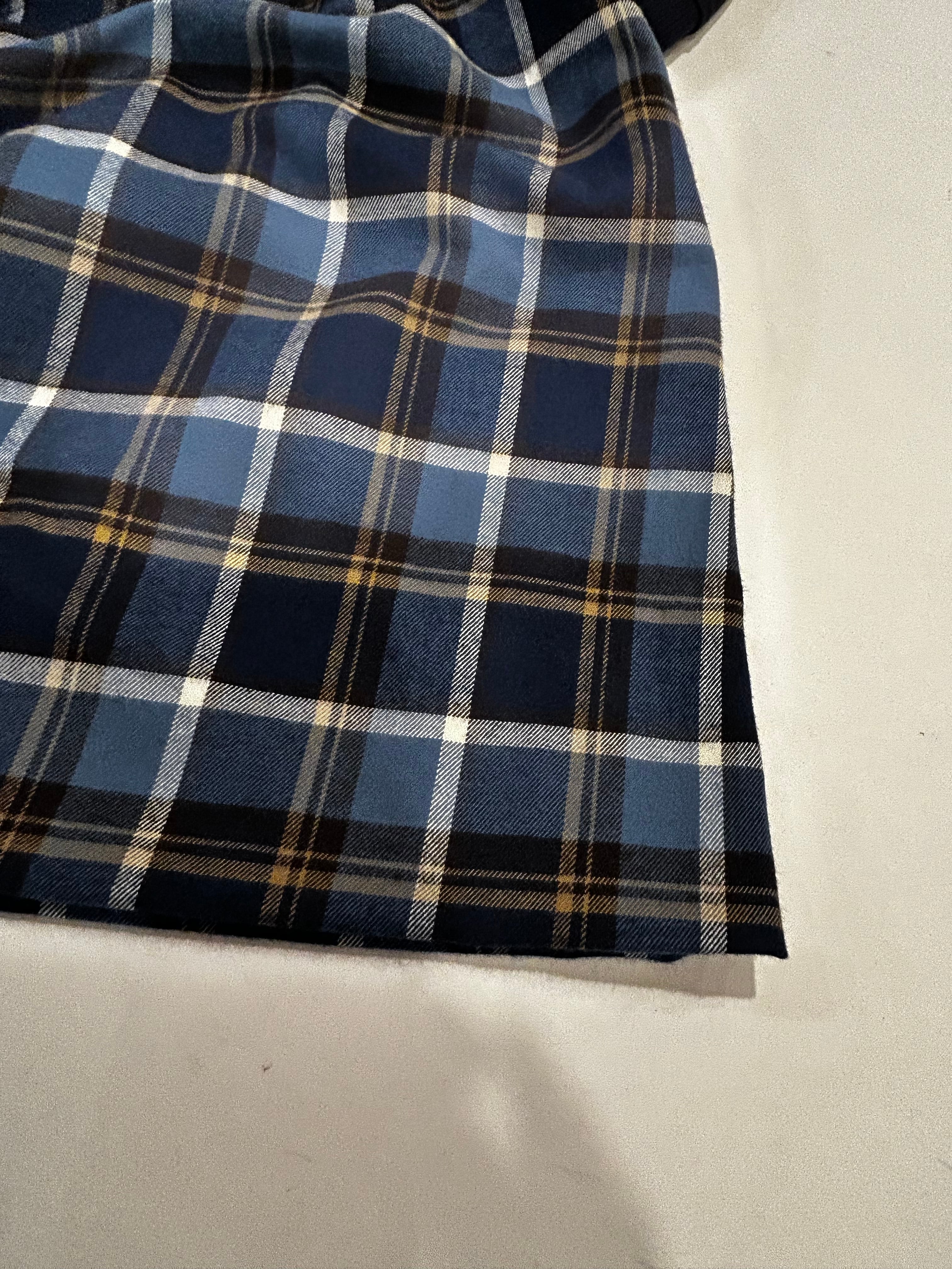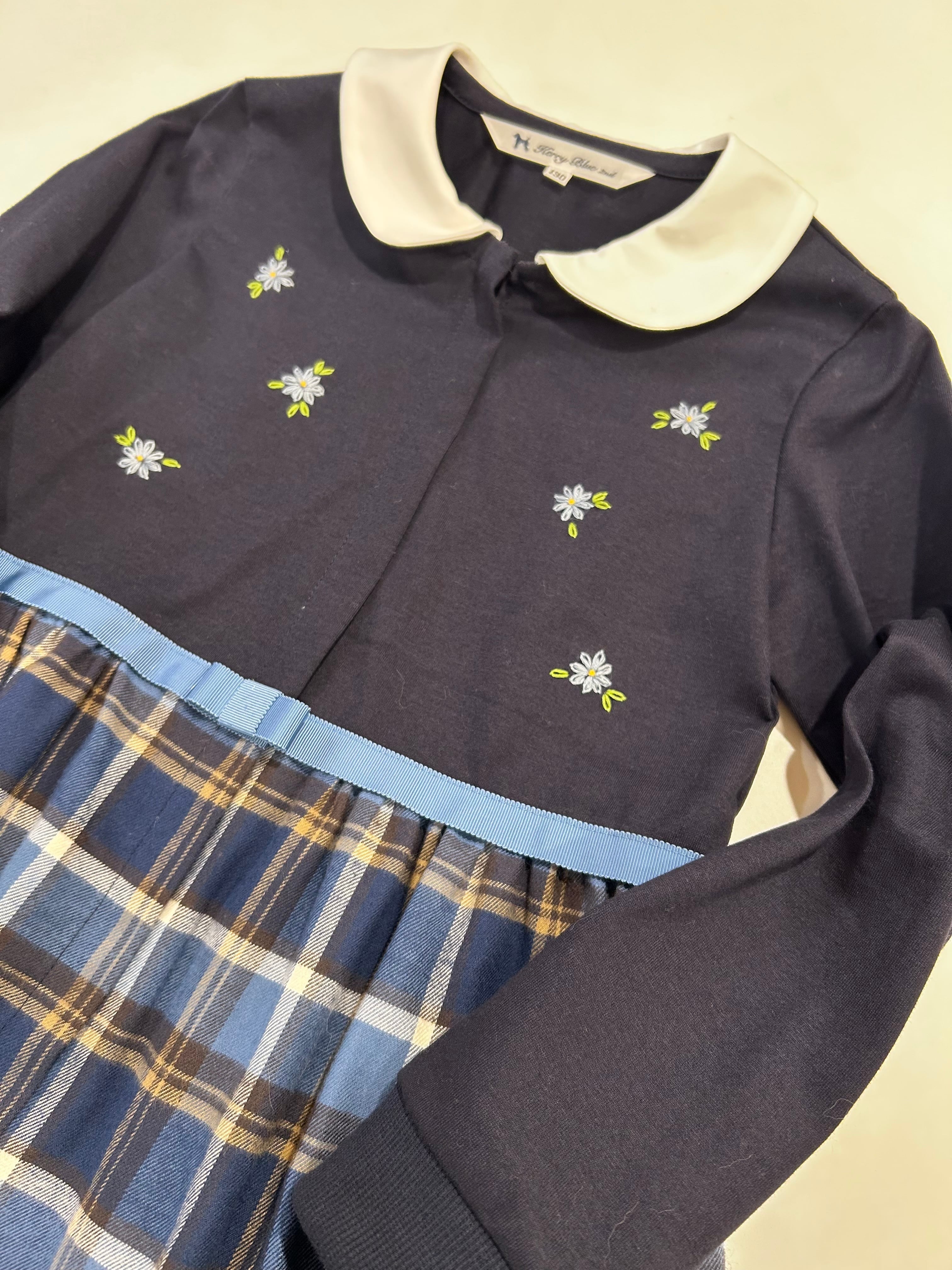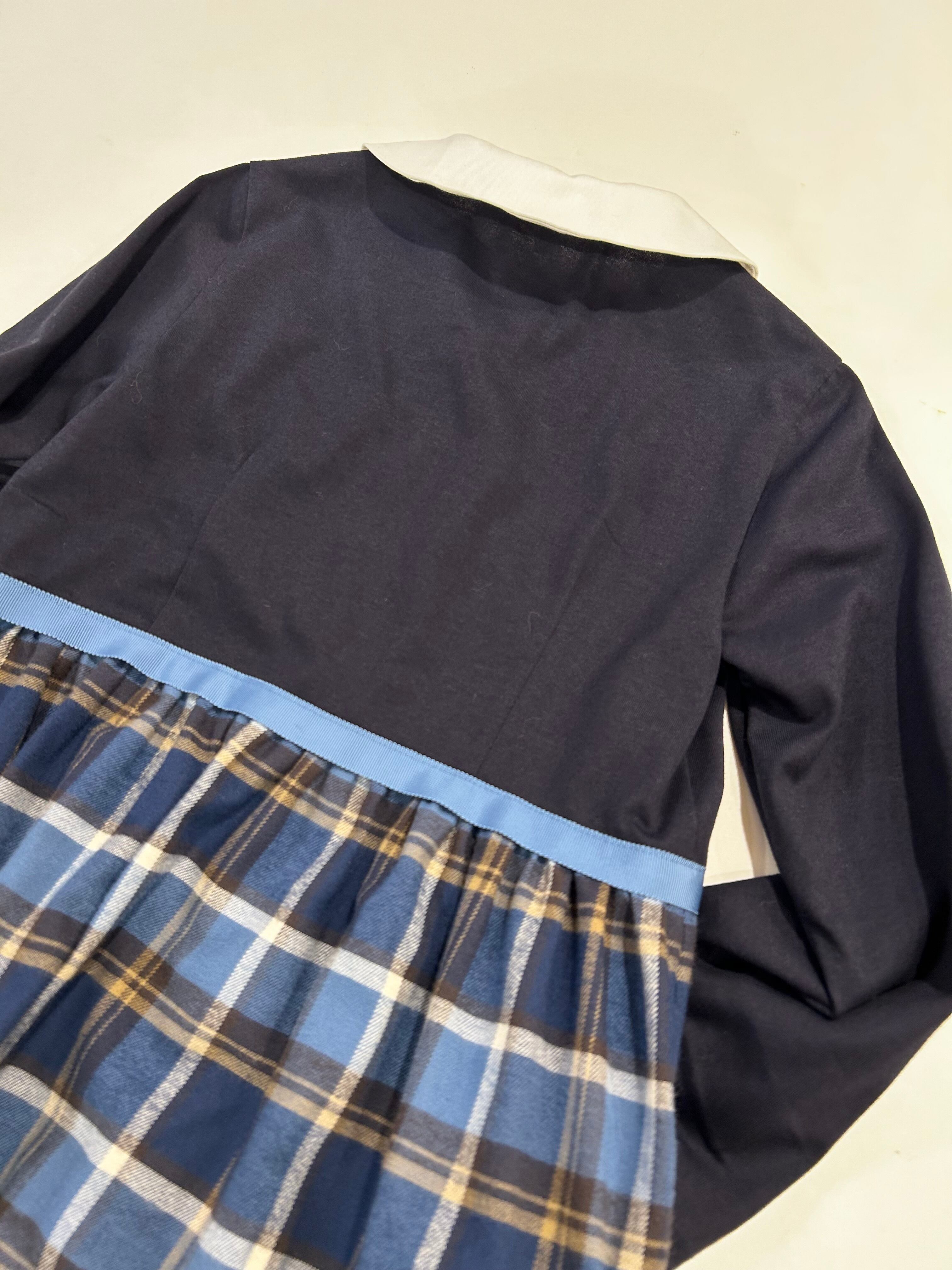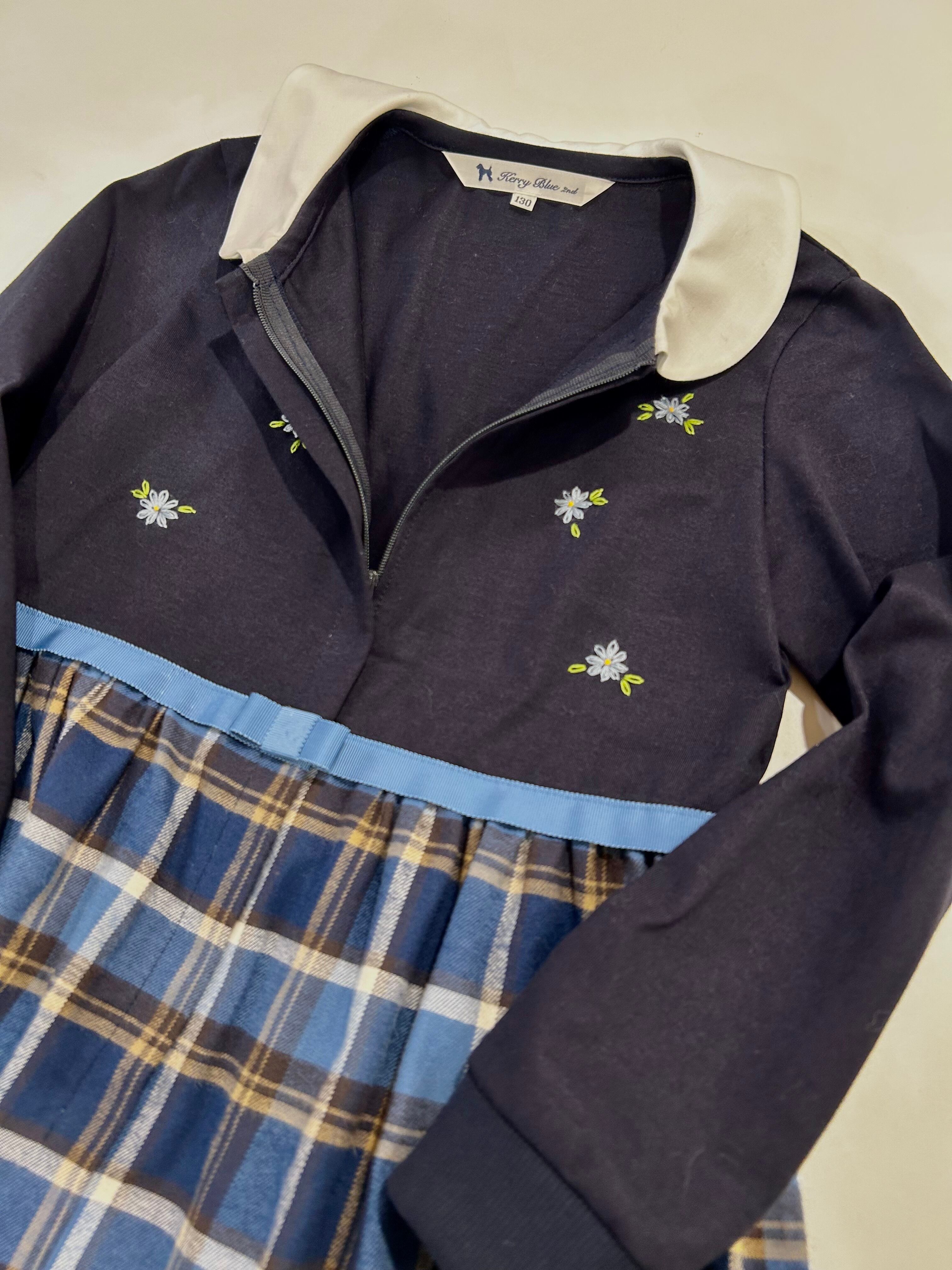 スカート部分は紺・ブルーの肌ざわり良いやや厚手のマドラスチェックの生地を使用しています。秋・冬とお召し頂ける素材感です。制服のない学校の通学用として、普段使いの通塾用として多用途にお使いいただけるワンピースです。