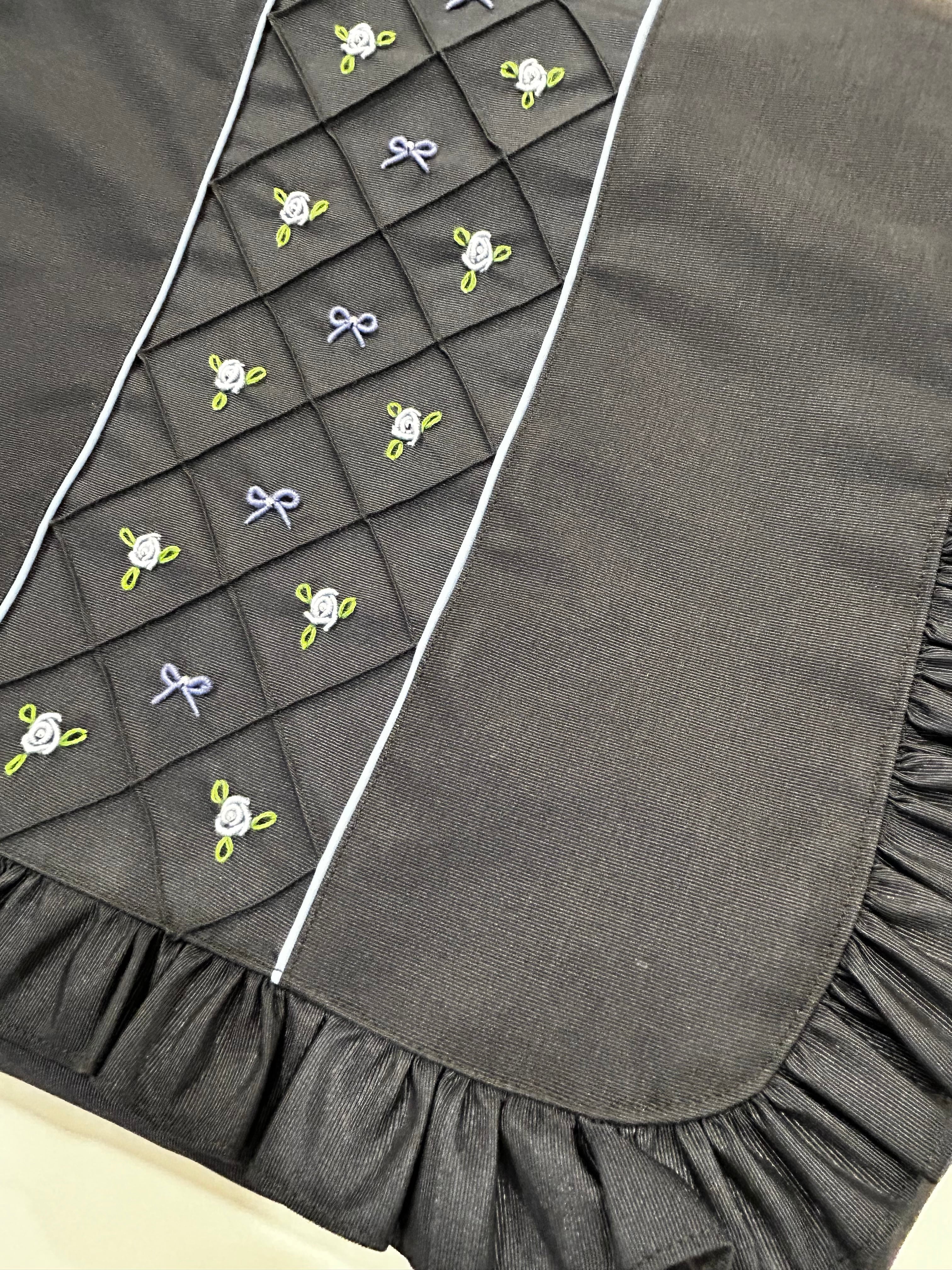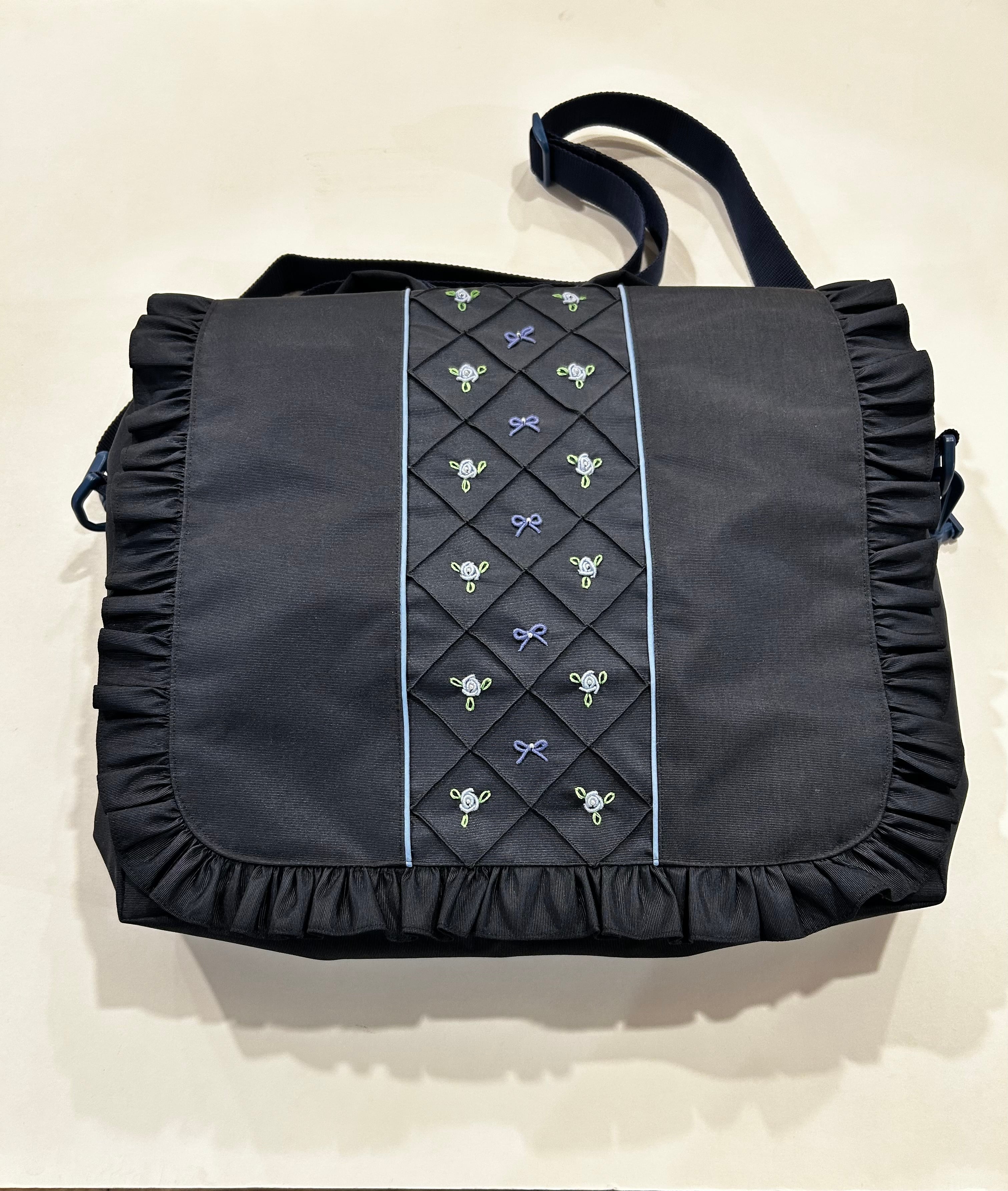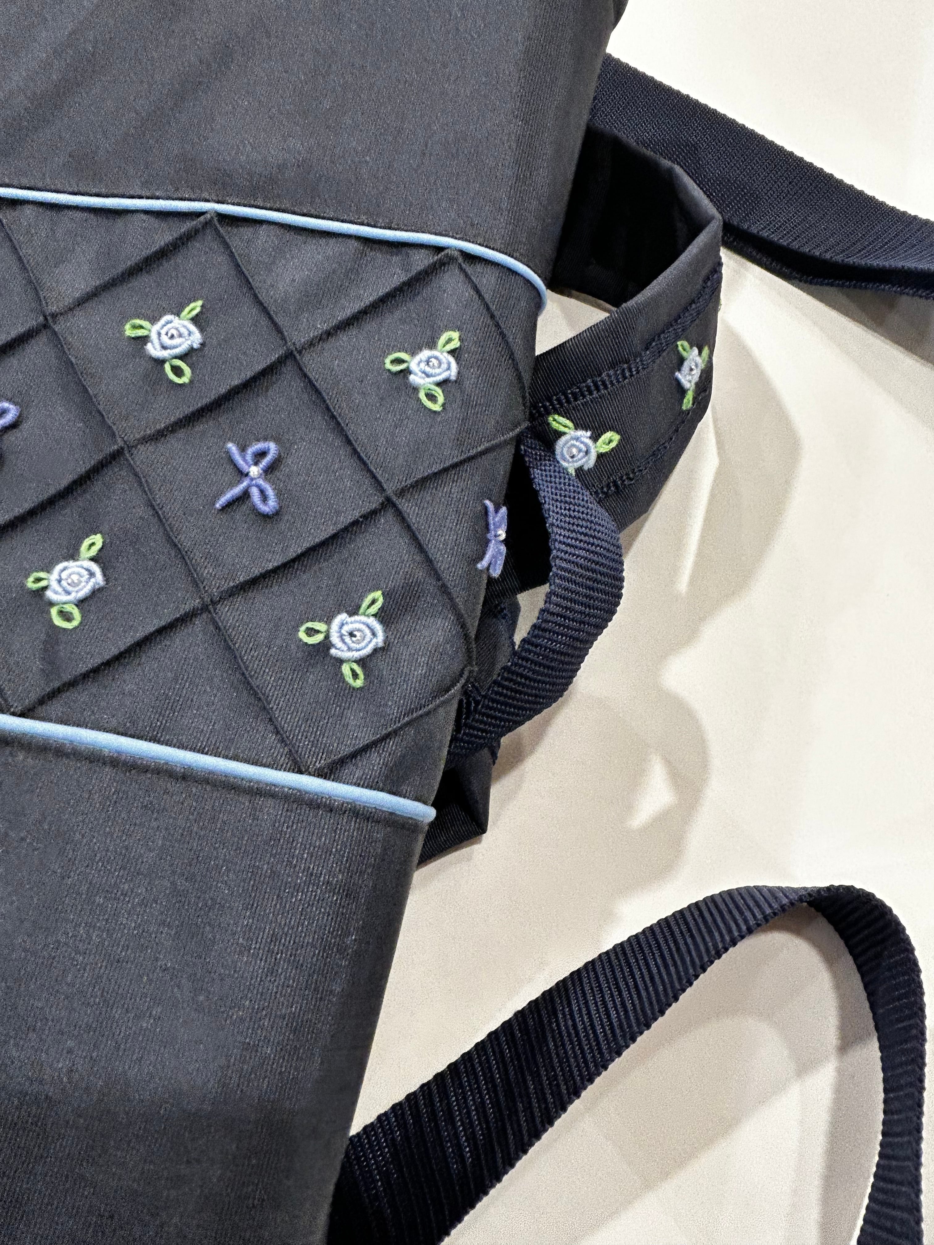 ダイヤ柄にピンタックを施しブルーのバリオンローズの手刺繍とリボン手刺繍が可愛いバックです。ブルーのパイピングをおつけした手の込んだお品です。ランドセルのショルダー部分にもブルーのバリオンローズ刺繍をおつけしました。薔薇とリボンの中心におつけした小さなパールもポイントです。フリル幅3cmのデザインです。