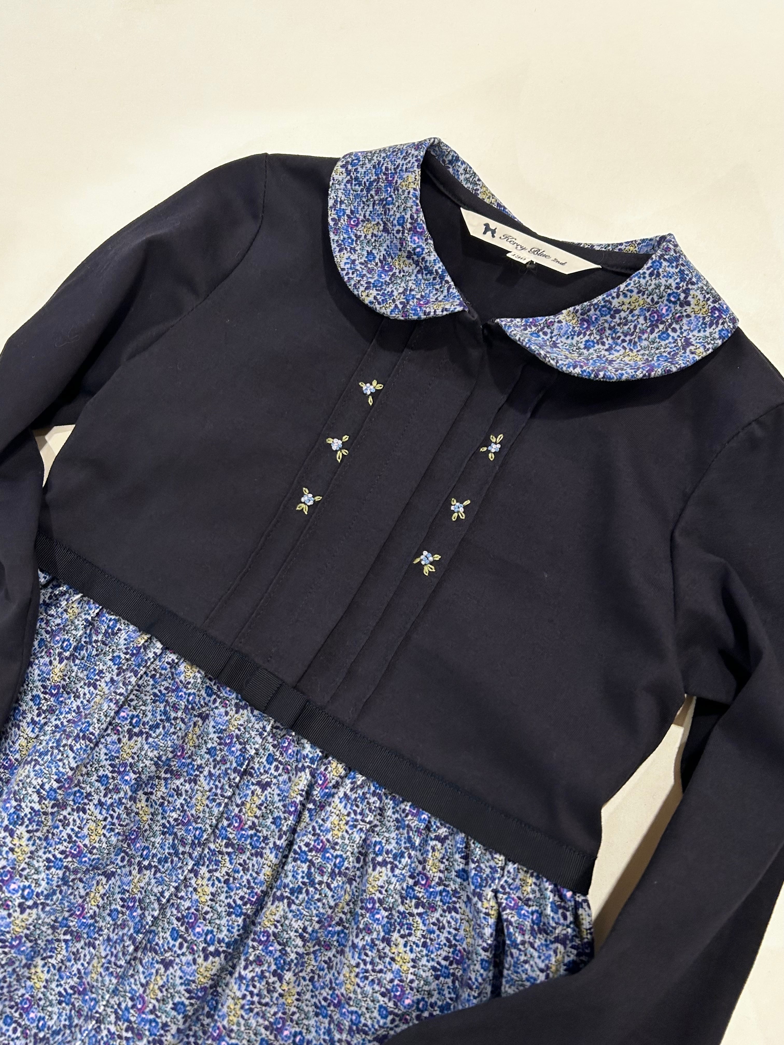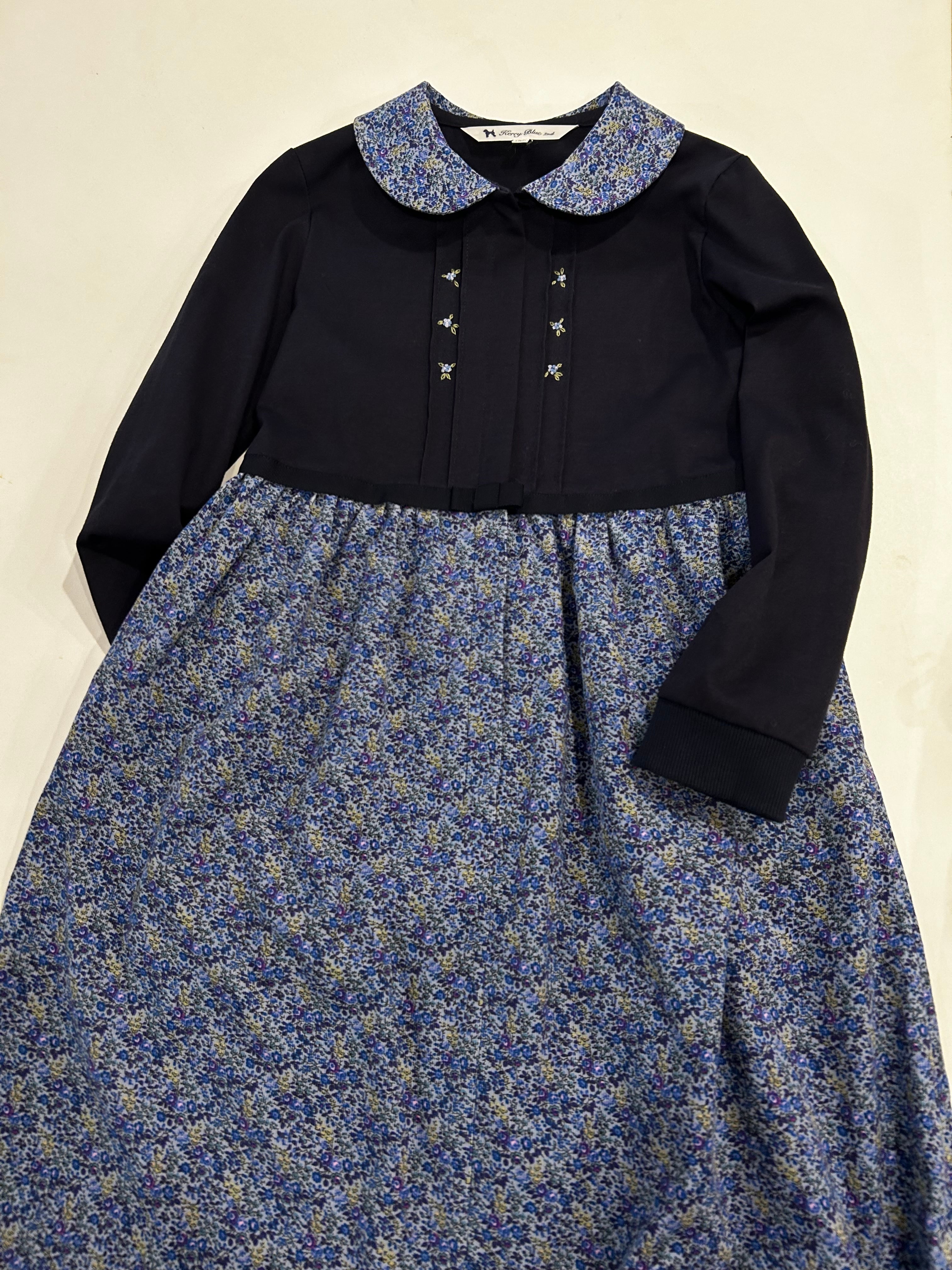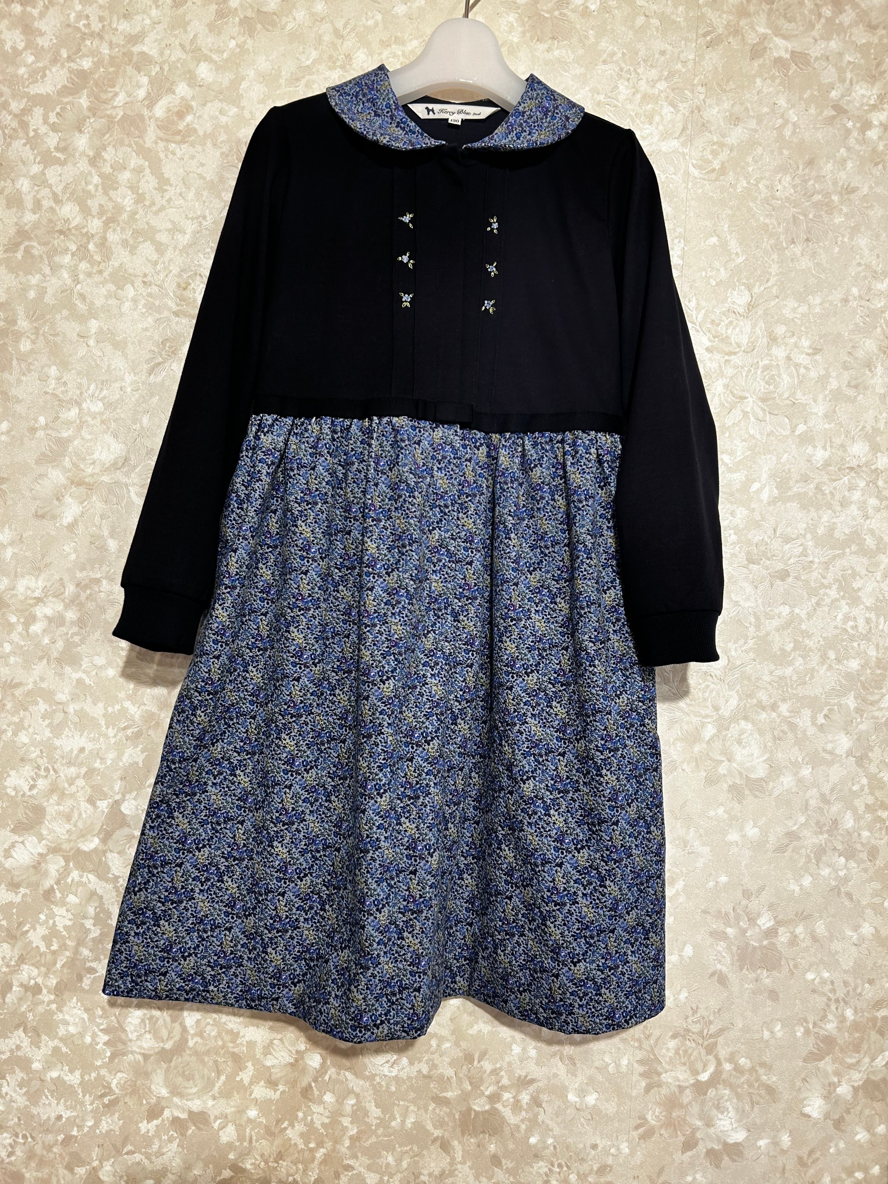 スカート部分はブルー地に紺・紫・の小花柄が可愛い肌触り良い細畝コーデュロイの生地を使用しています。所々に入ったピンクの小花が可愛いです。秋・冬とお召し頂ける素材感です。制服のない学校の通学用として、普段使いの通塾用として多用途にお使いいただけるワンピースです。