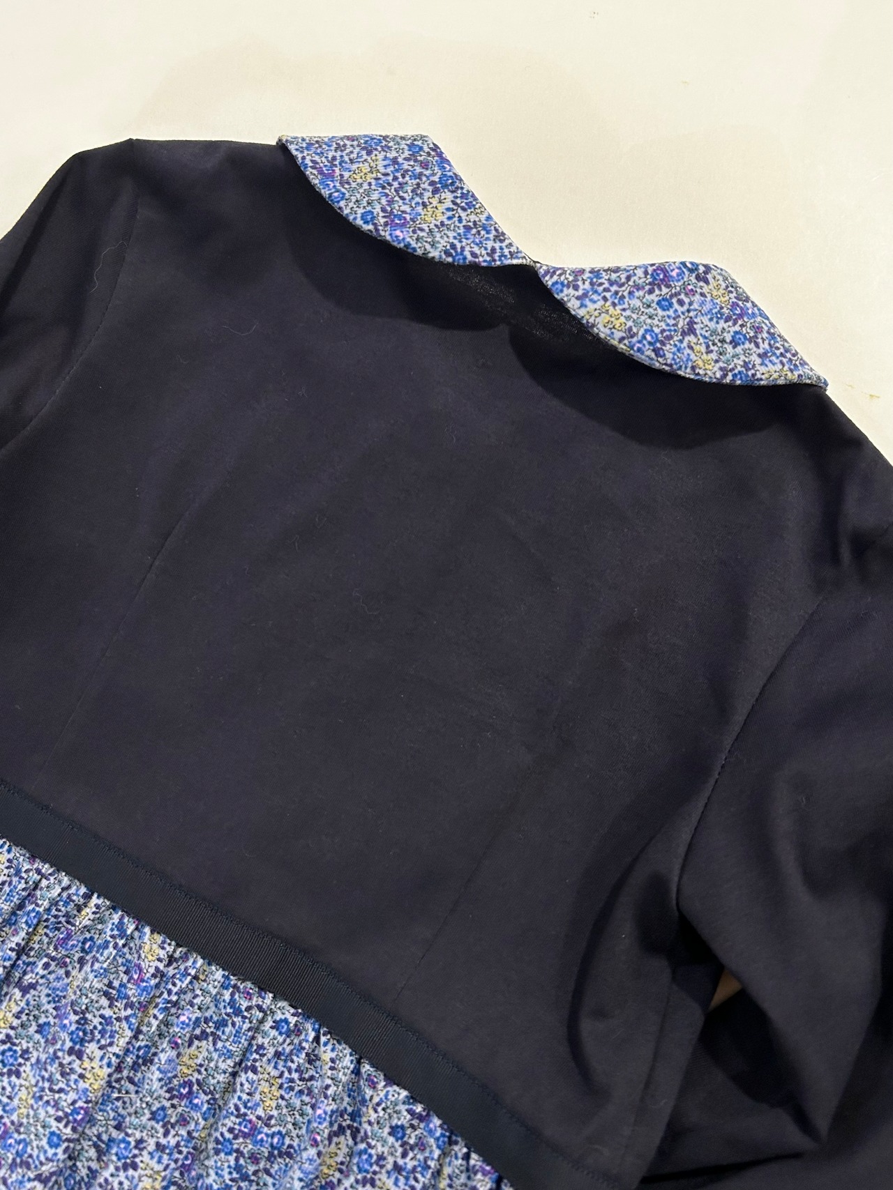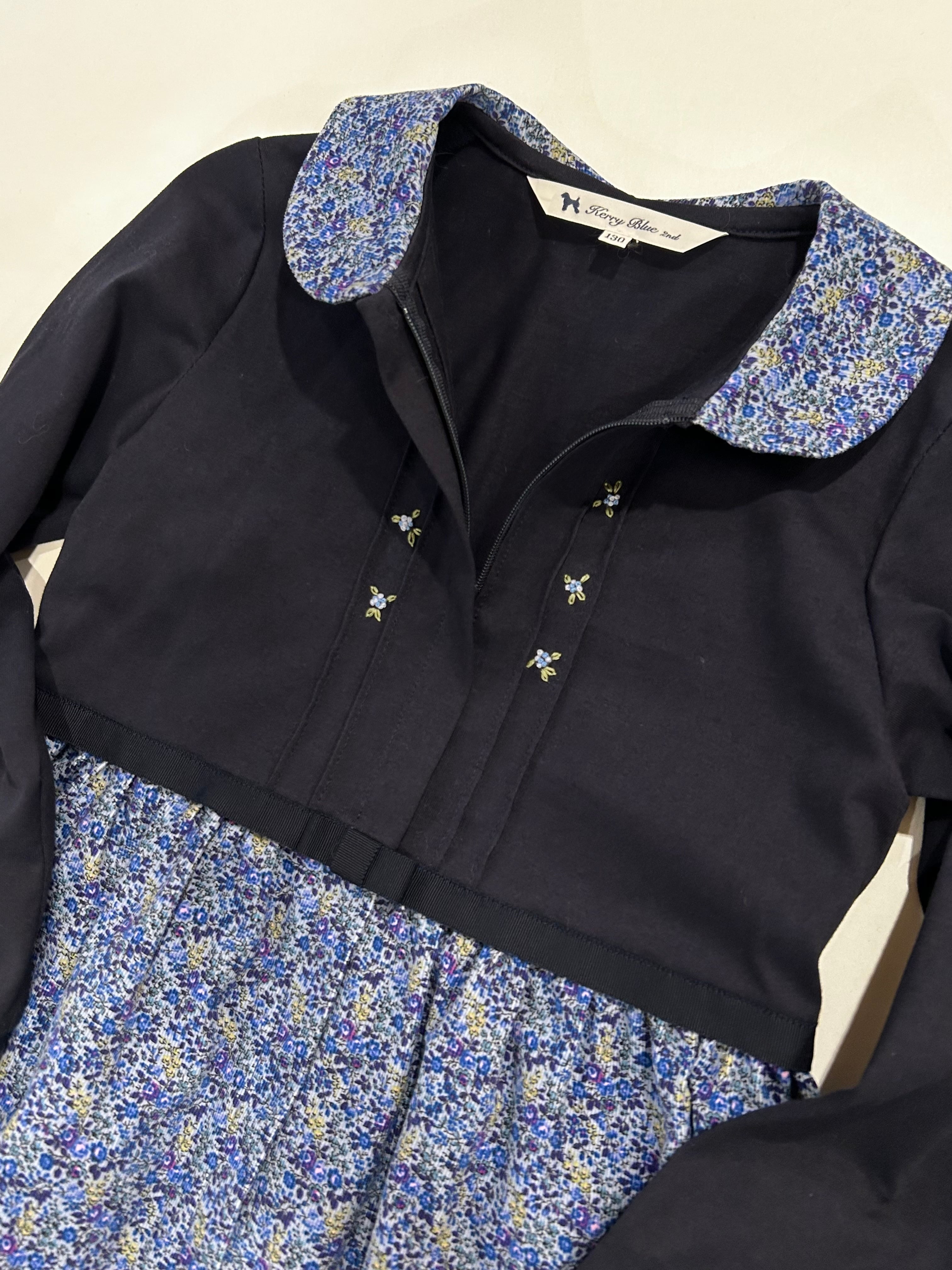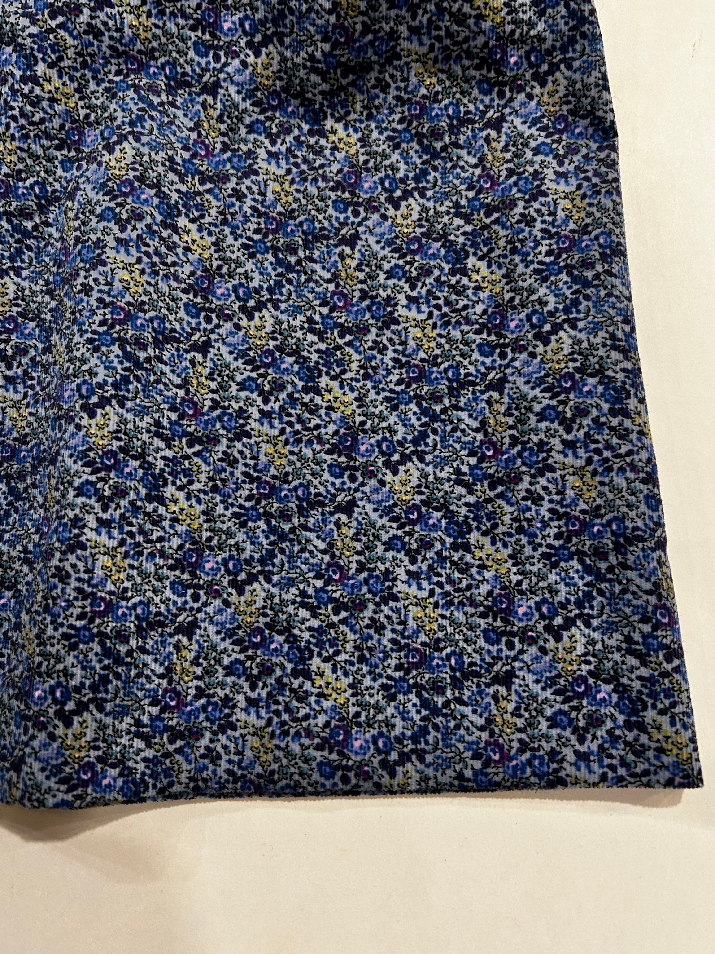 スカート部分はブルー地に紺・紫・の小花柄が可愛い肌触り良い細畝コーデュロイの生地を使用しています。所々に入ったピンクの小花が可愛いです。秋・冬とお召し頂ける素材感です。制服のない学校の通学用として、普段使いの通塾用として多用途にお使いいただけるワンピースです。