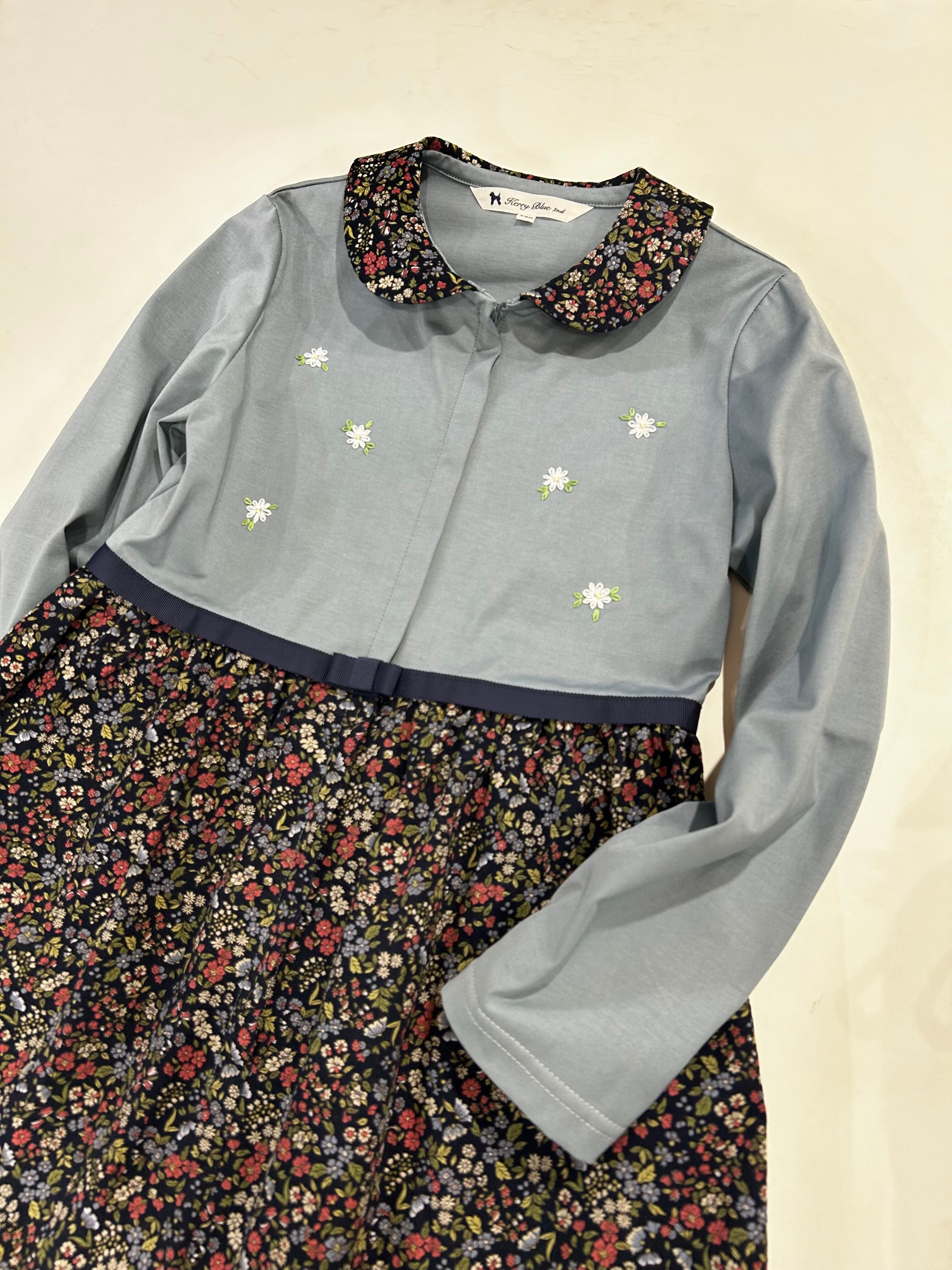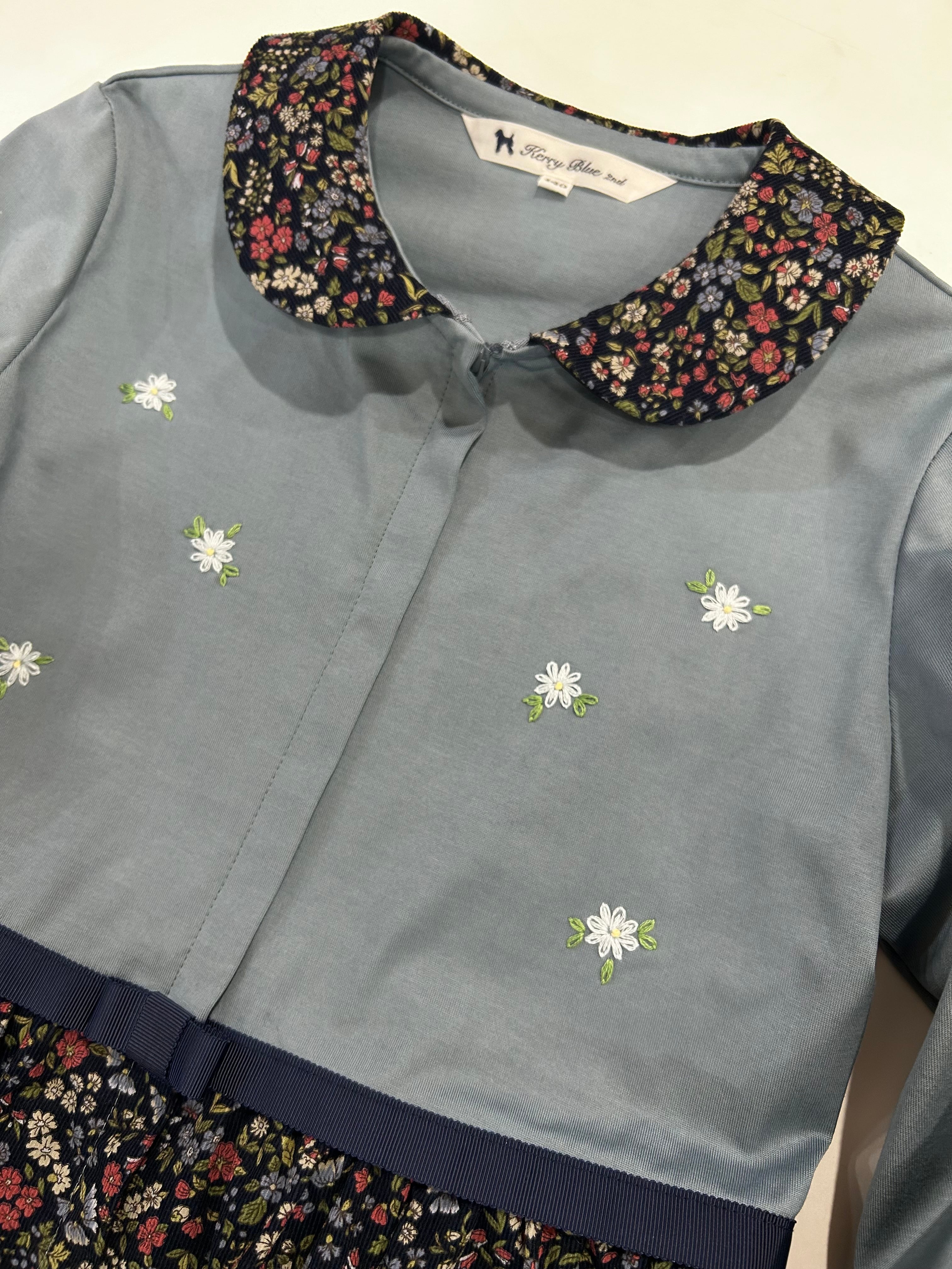 襟とスカート部分はピンク系の細畝コーデュロイの生地を使用しています。肌触りも良く紺ベースに濃ピンクの小花とブルーの小花がシックなお品で秋・冬とお召し頂ける素材感です。