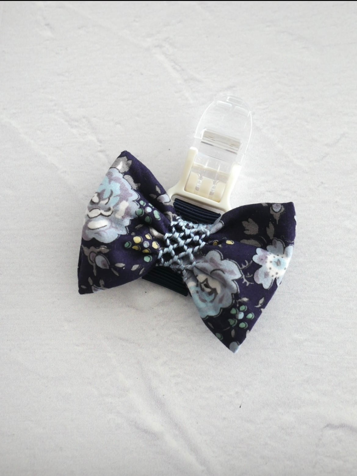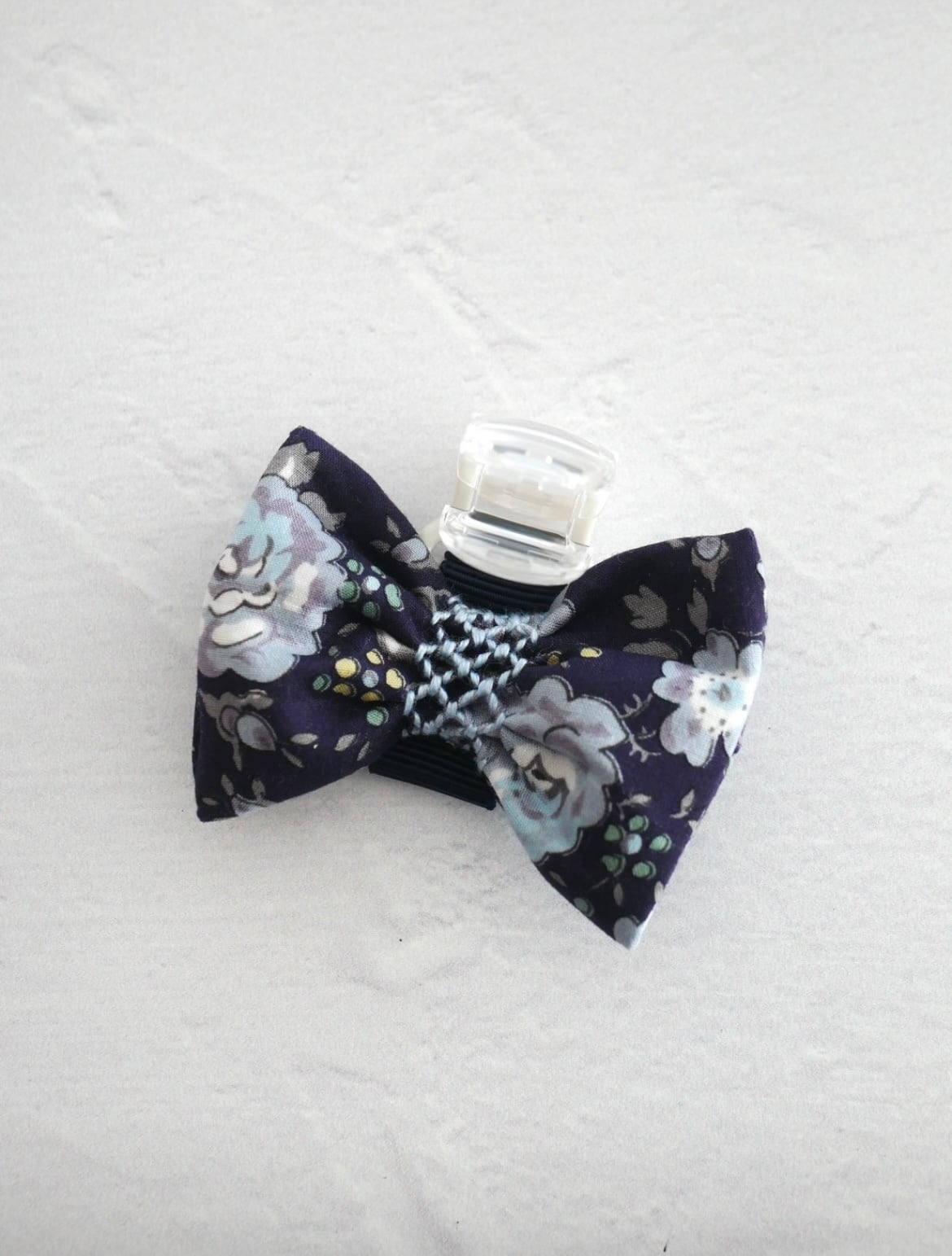 紺地にグレーの花柄のリバティの生地を使用しています。中心にはシルバーのスモッキング刺繍を施した素敵な名札クリップです。立教女学院小学校の方に人気のお品です。オリジナルでお作りしています。