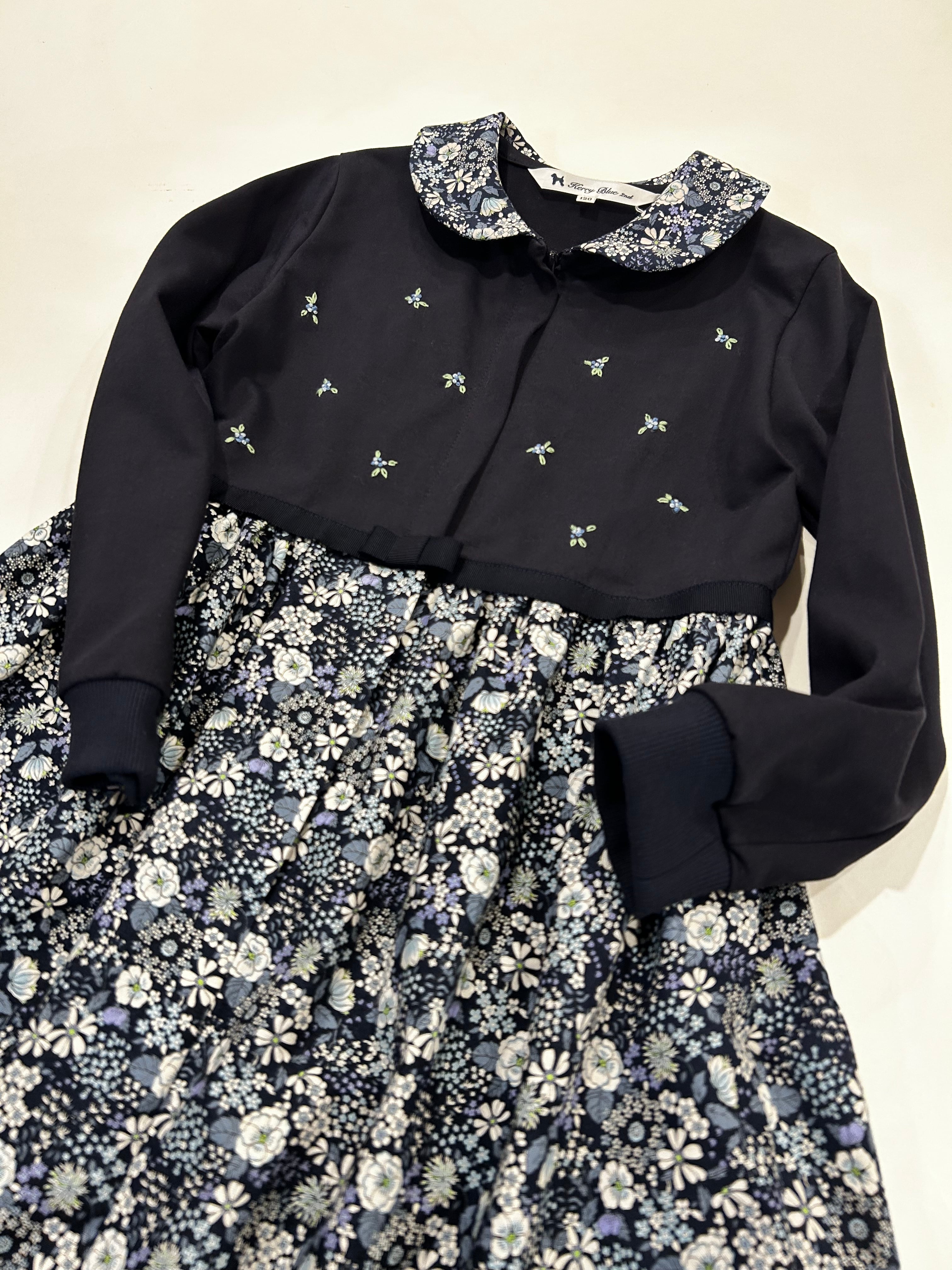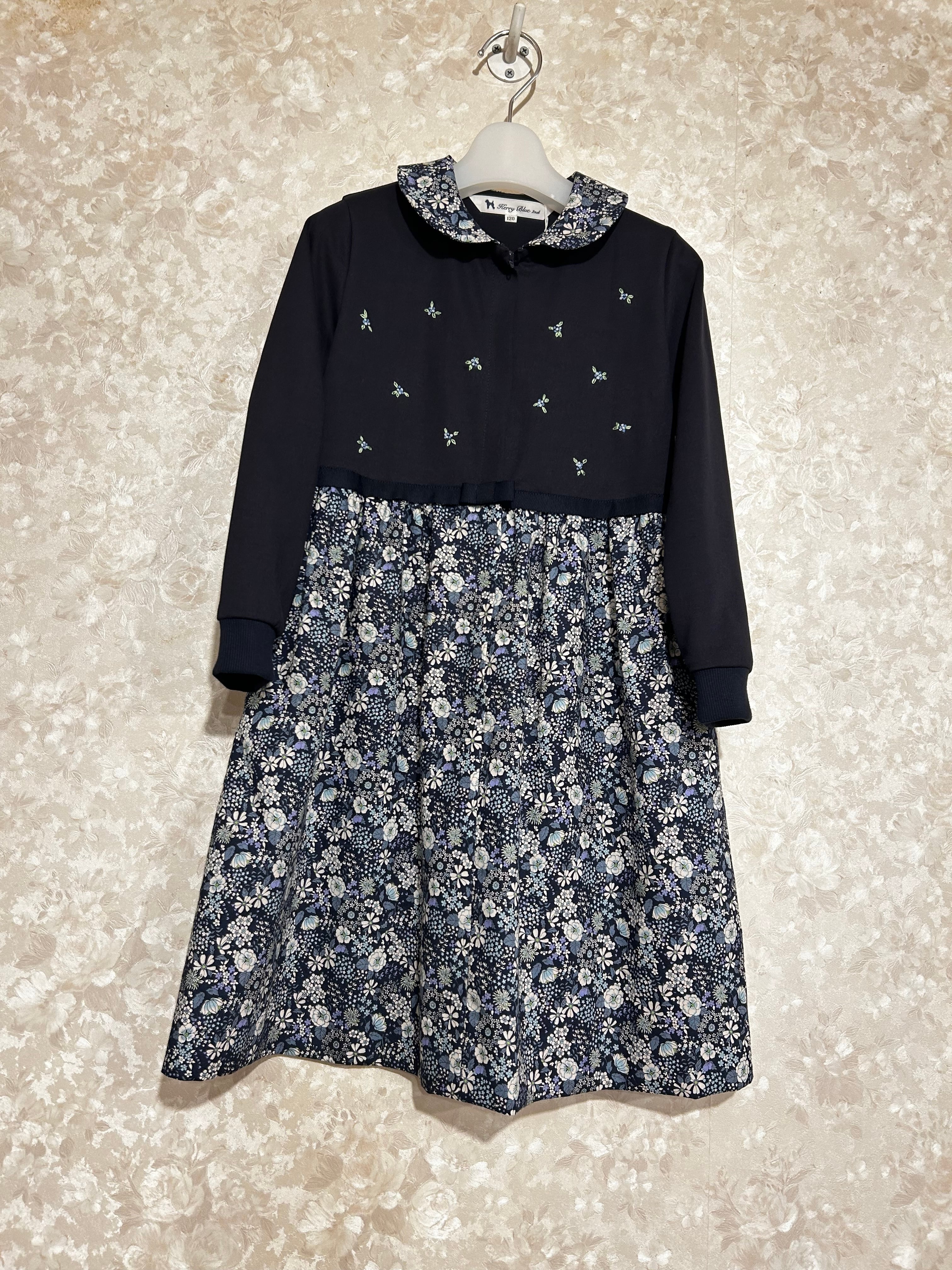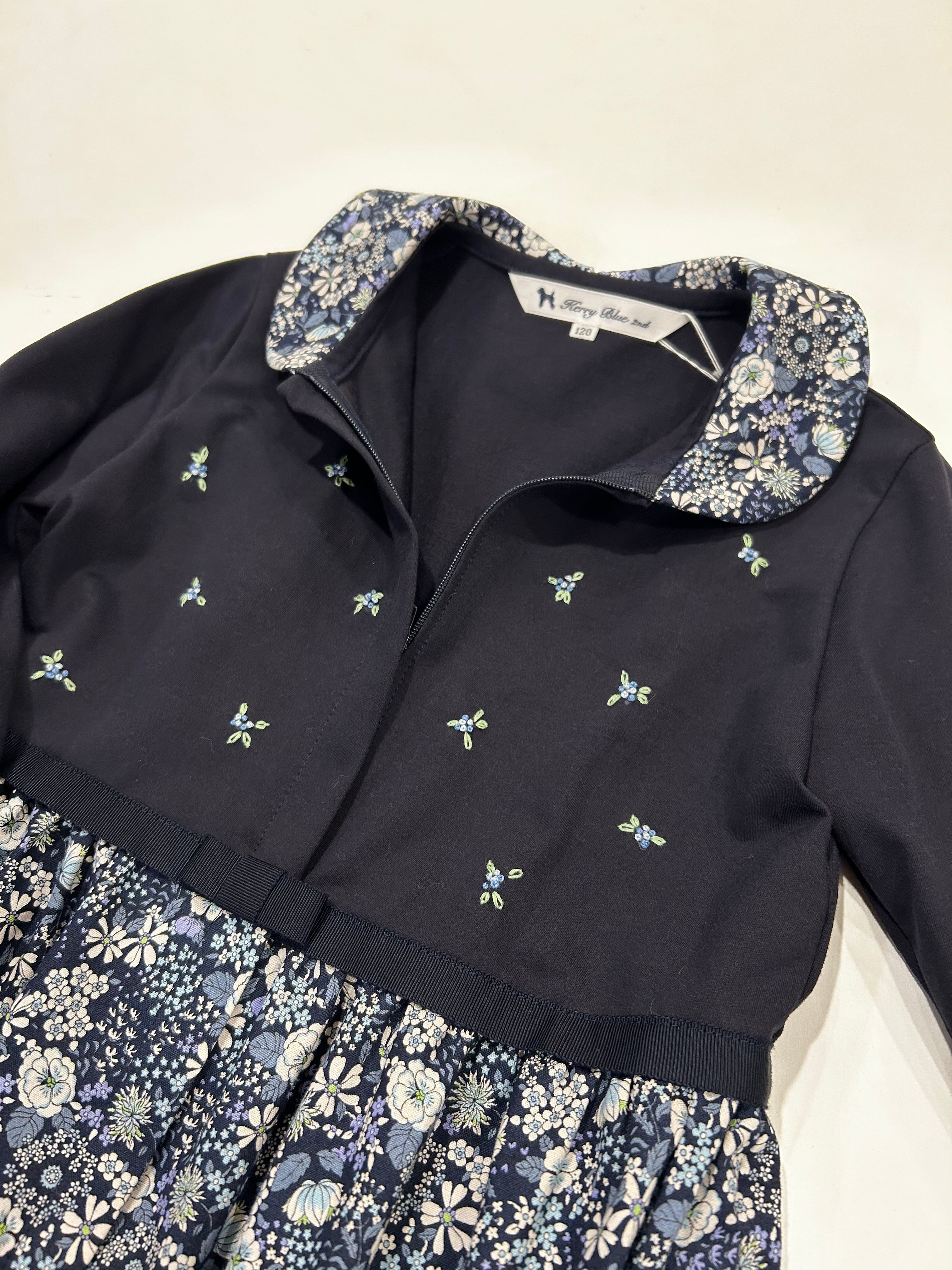 襟とスカート部分は紺地に白・ブルーの花柄の生地を使用しています。上品な花柄で大変人気のある花柄生地です。真夏を除いた3シーズンお召し頂ける素材感です。