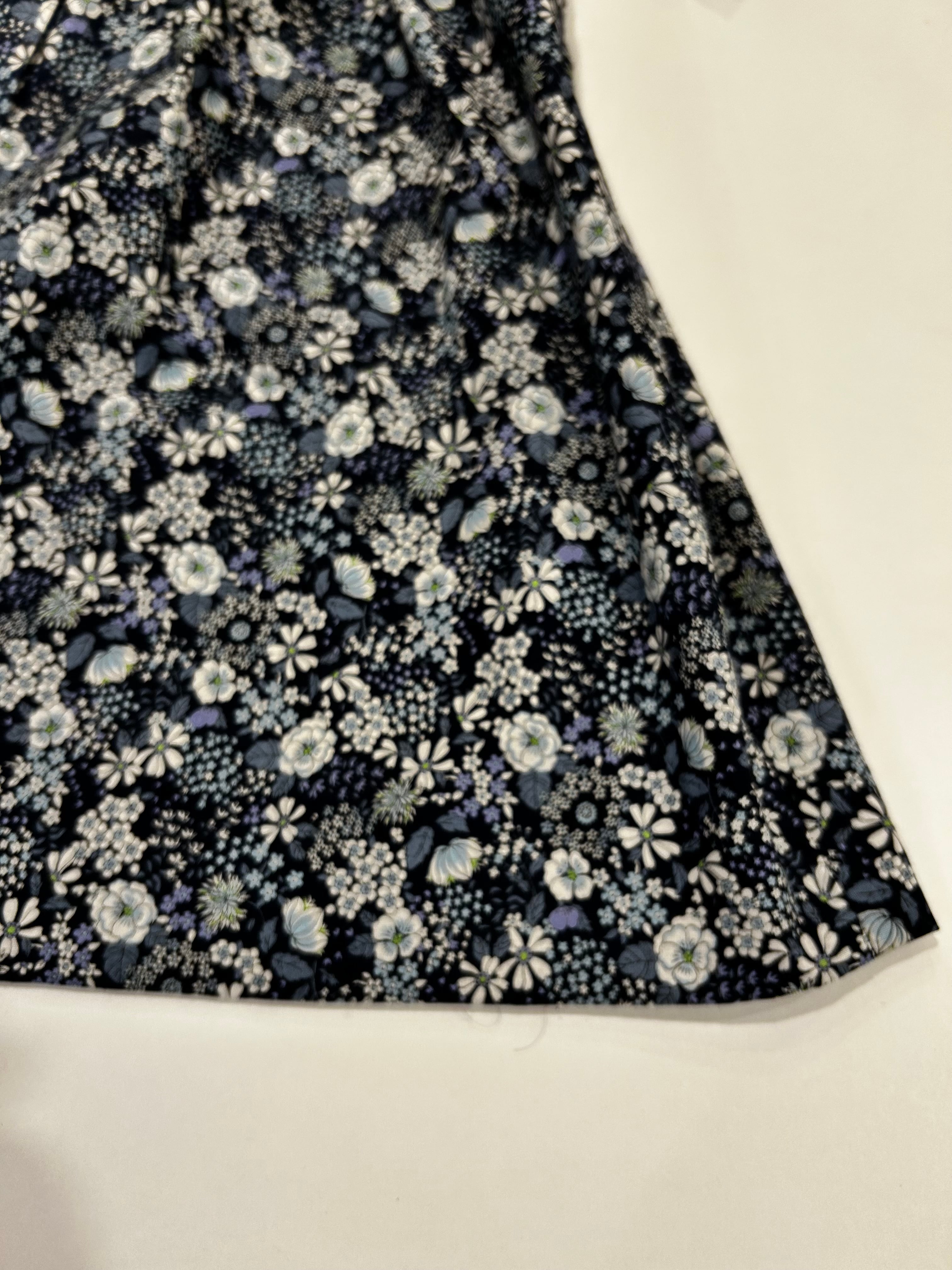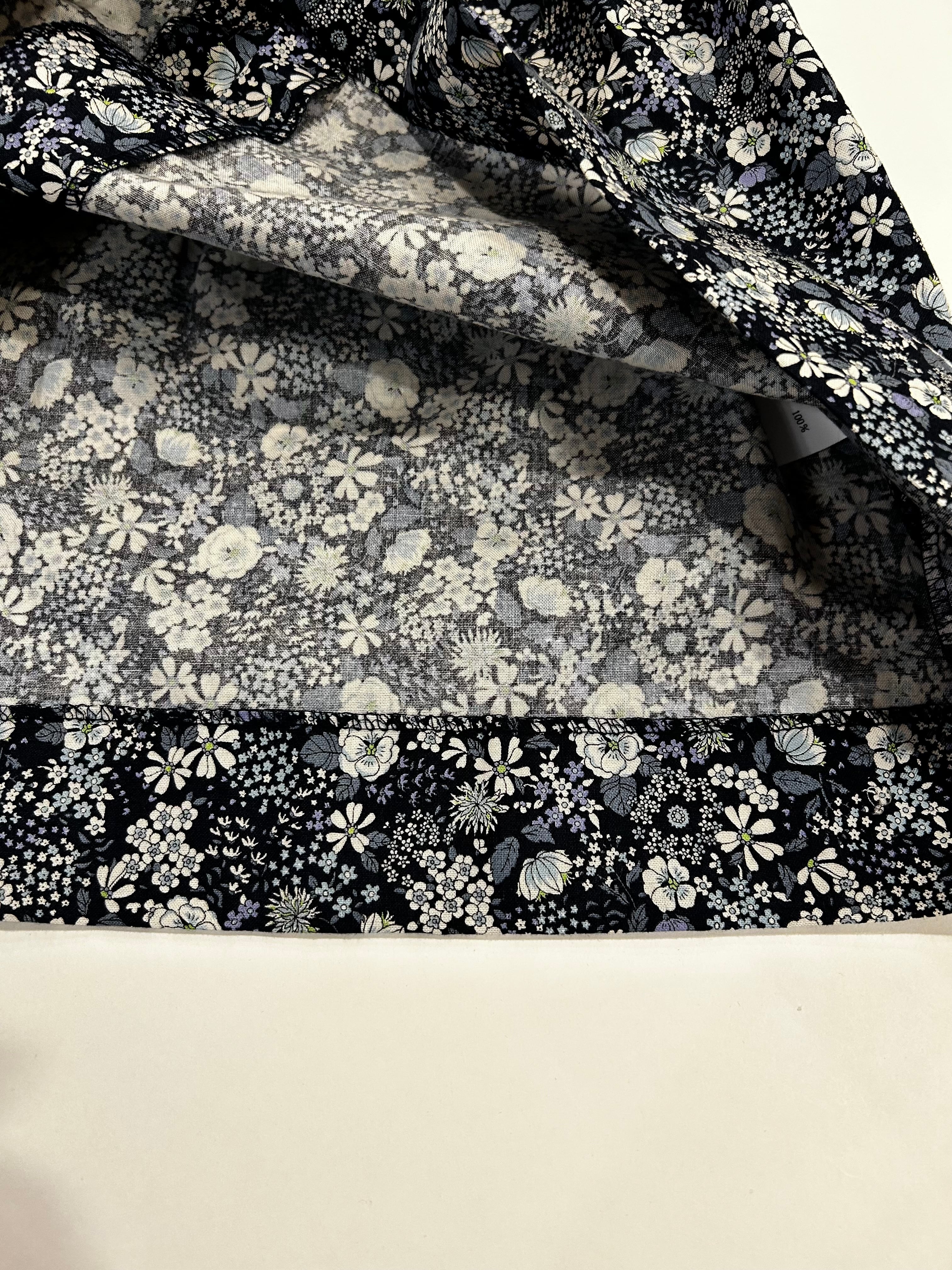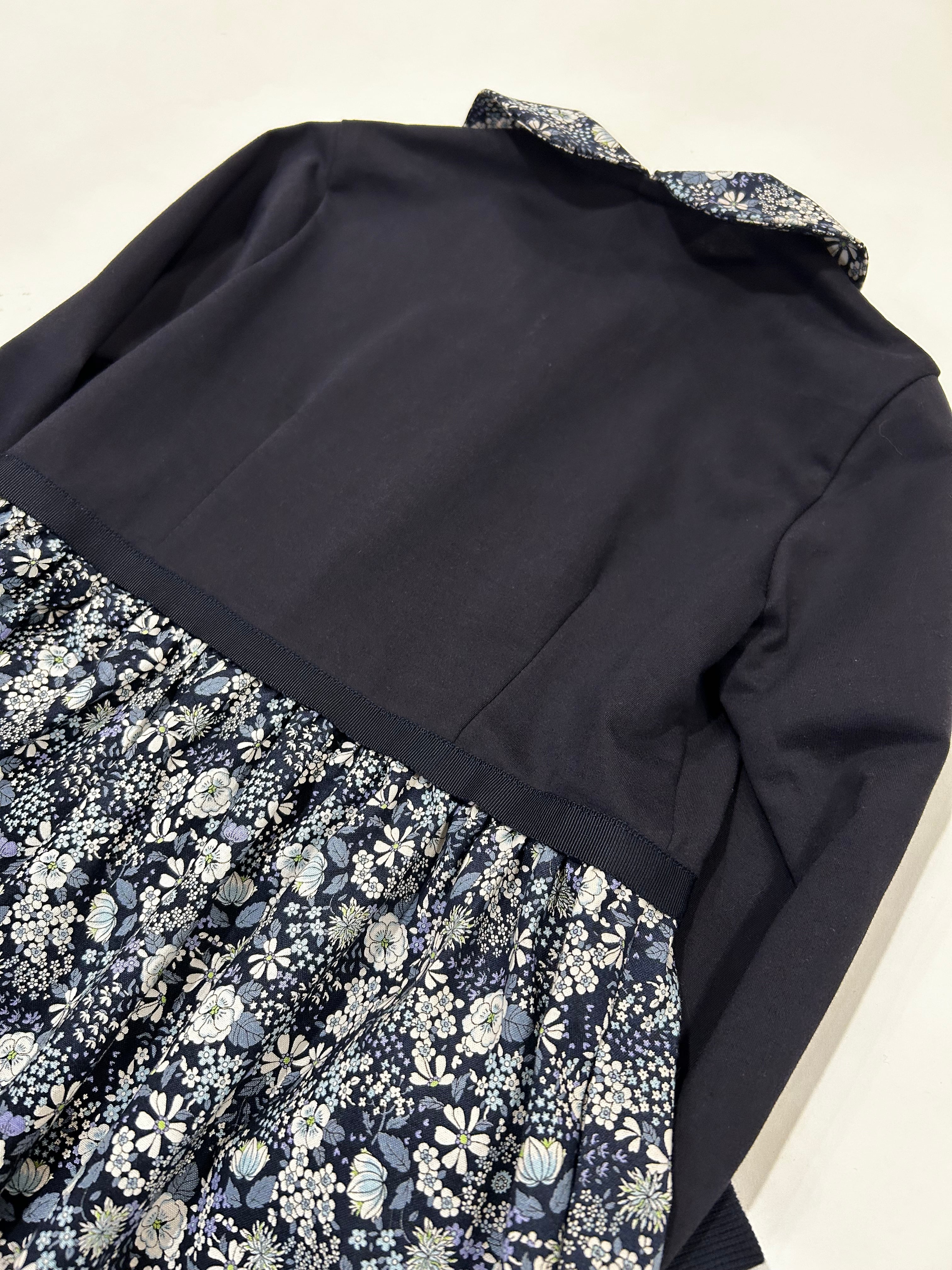 襟とスカート部分は紺地に白・ブルーの花柄の生地を使用しています。上品な花柄で大変人気のある花柄生地です。真夏を除いた3シーズンお召し頂ける素材感です。