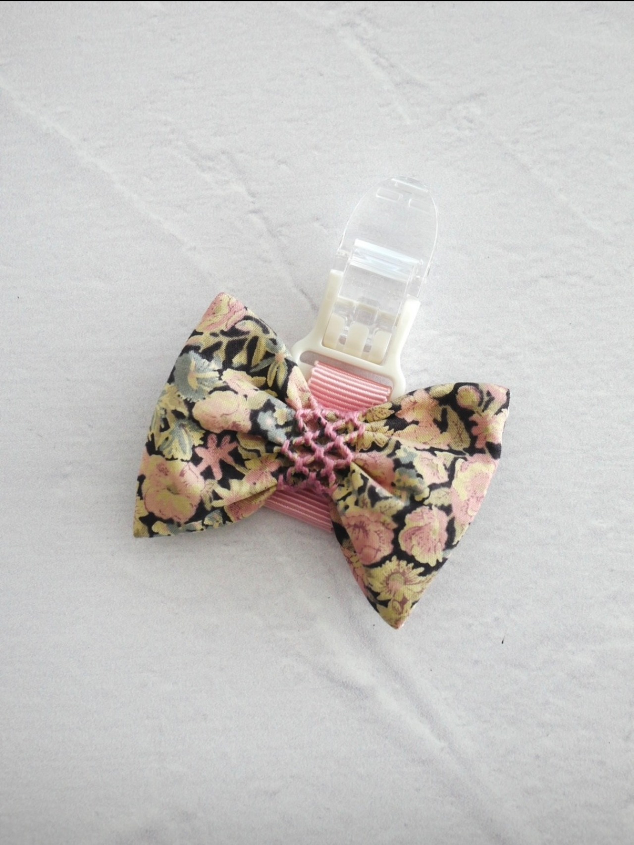 紺地にピンクのお花柄の少し落ち着いた雰囲気のリバティプリントの生地を使用しています。中心にはピンクのスモッキング刺繍を施した素敵な名札クリップです。立教女学院小学校の方に人気のお品です。オリジナルでお作りしています。