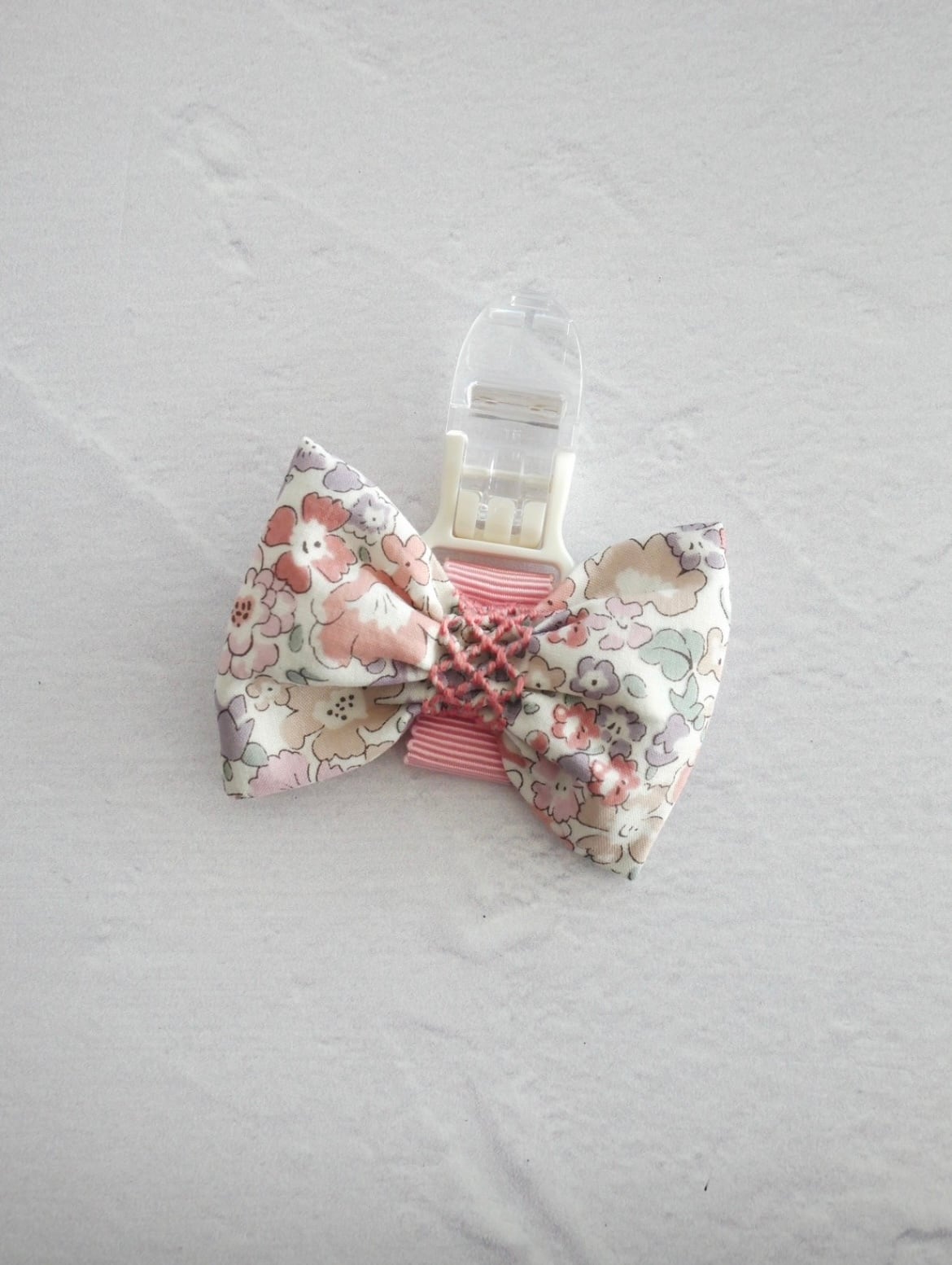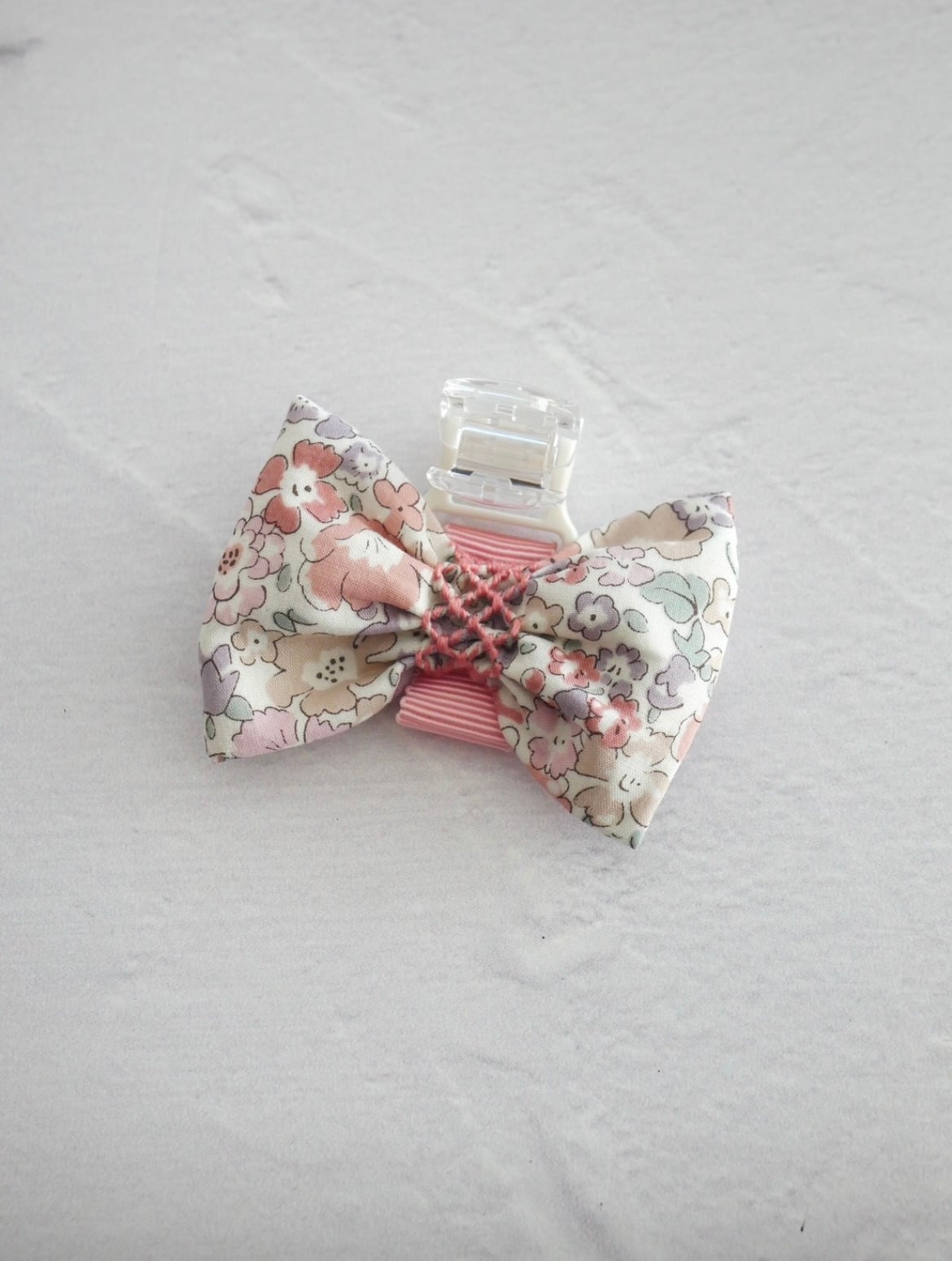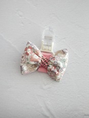 白地に少し落ち着いたピンク・パープルなどのお花柄のリバティプリントの生地を使用しています。中心にはピンクのスモッキング刺繍を施した素敵な名札クリップです。立教女学院小学校の方に人気のお品です。オリジナルでお作りしています。