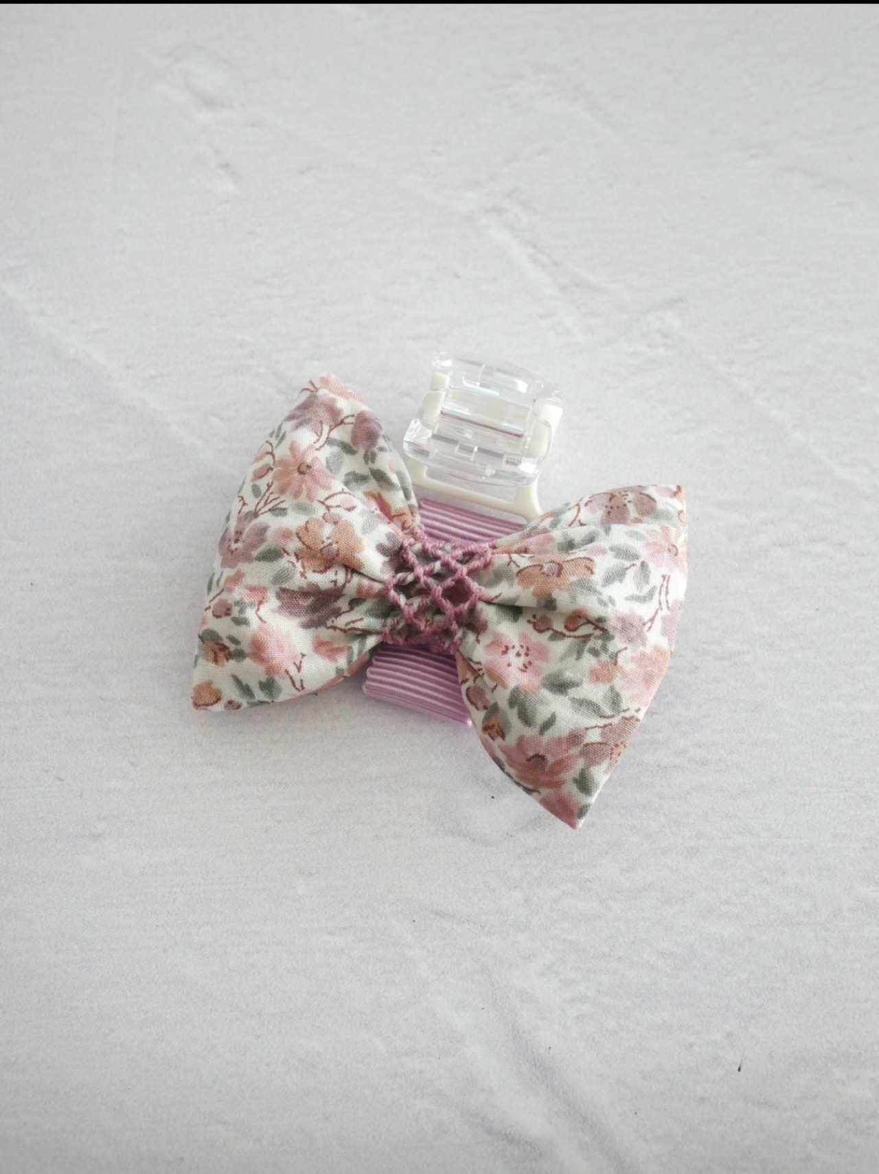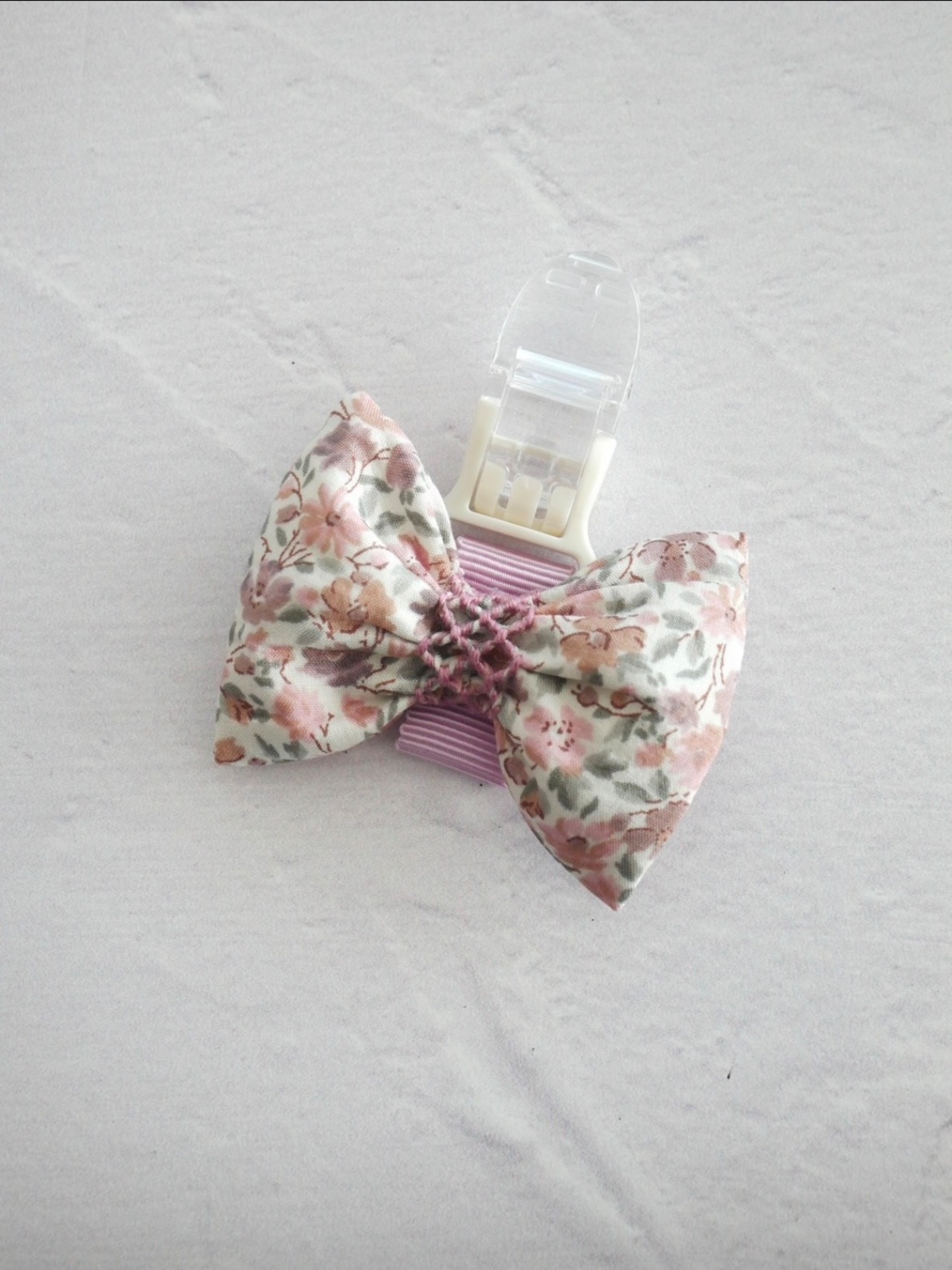 白地に少し落ち着いたピンクパープルのお花柄のリバティプリントの生地を使用しています。中心にはパープルのスモッキング刺繍を施した素敵な名札クリップです。立教女学院小学校の方に人気のお品です。オリジナルでお作りしています。