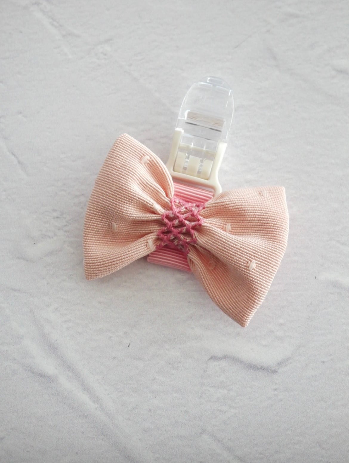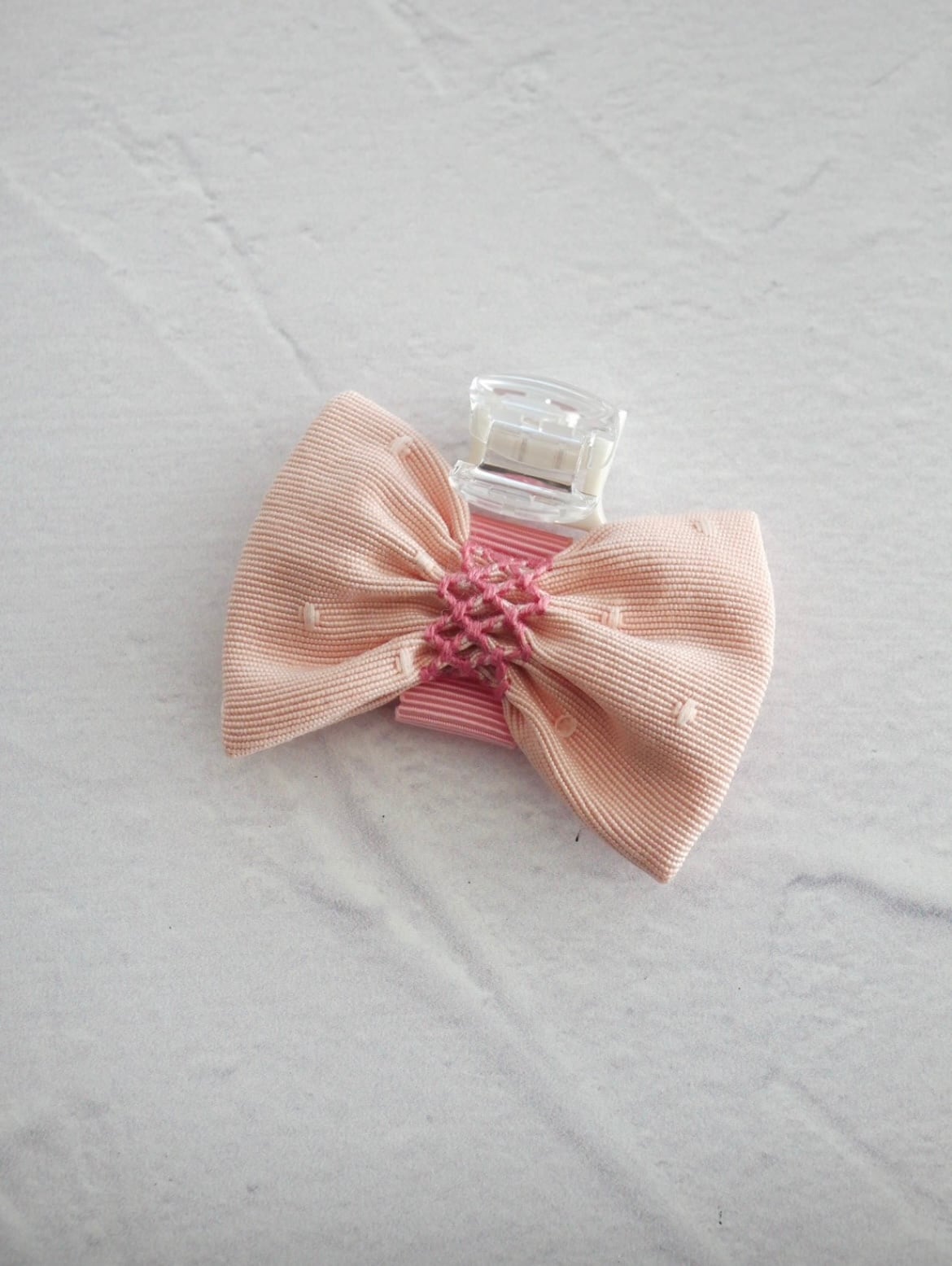 ピンクのドットミニヨンの生地にピンクのスモッキング刺繍を施した名札クリップです。立教女学院小学校の方に人気のお品です。オリジナルでお作りしています。