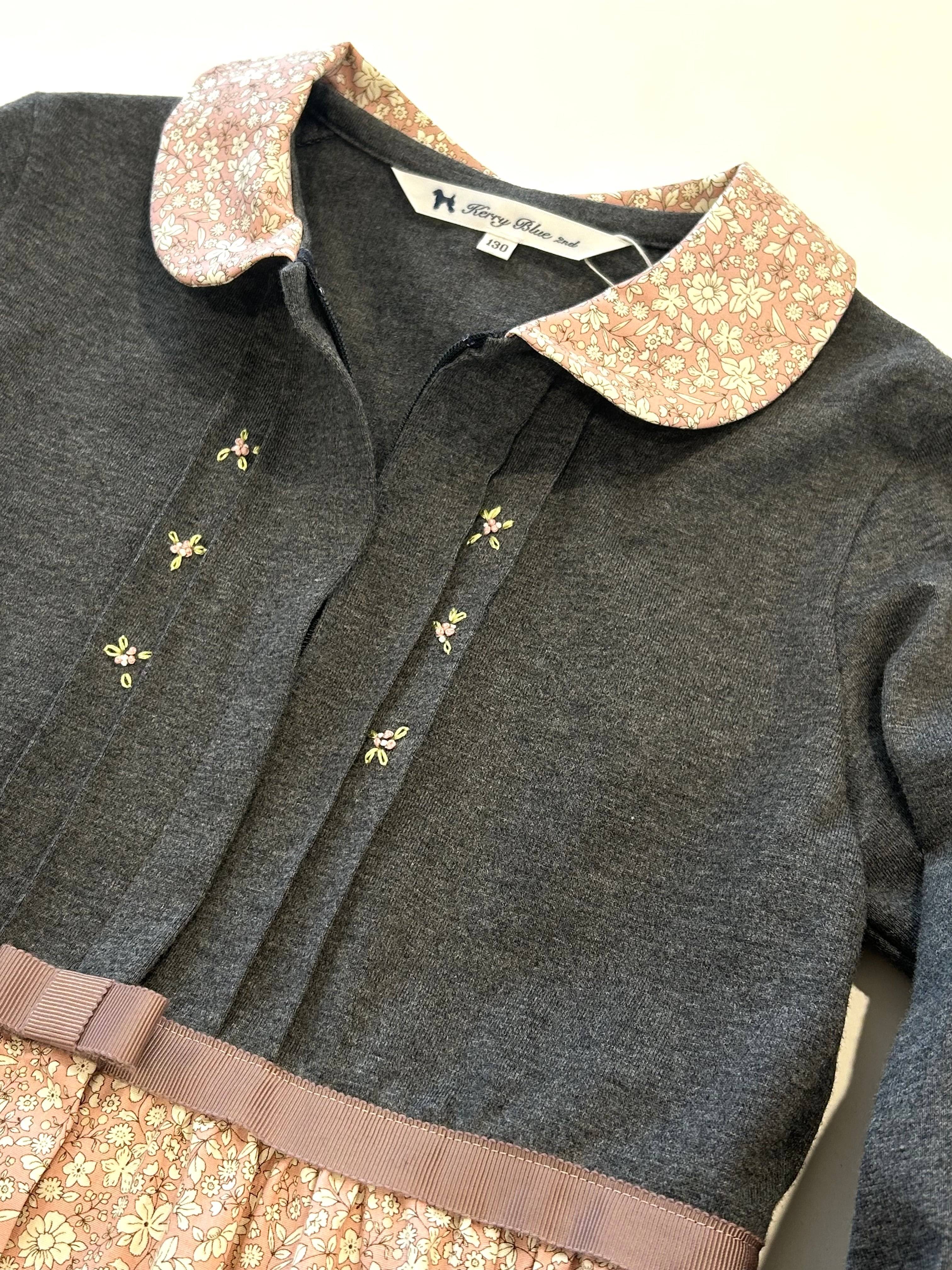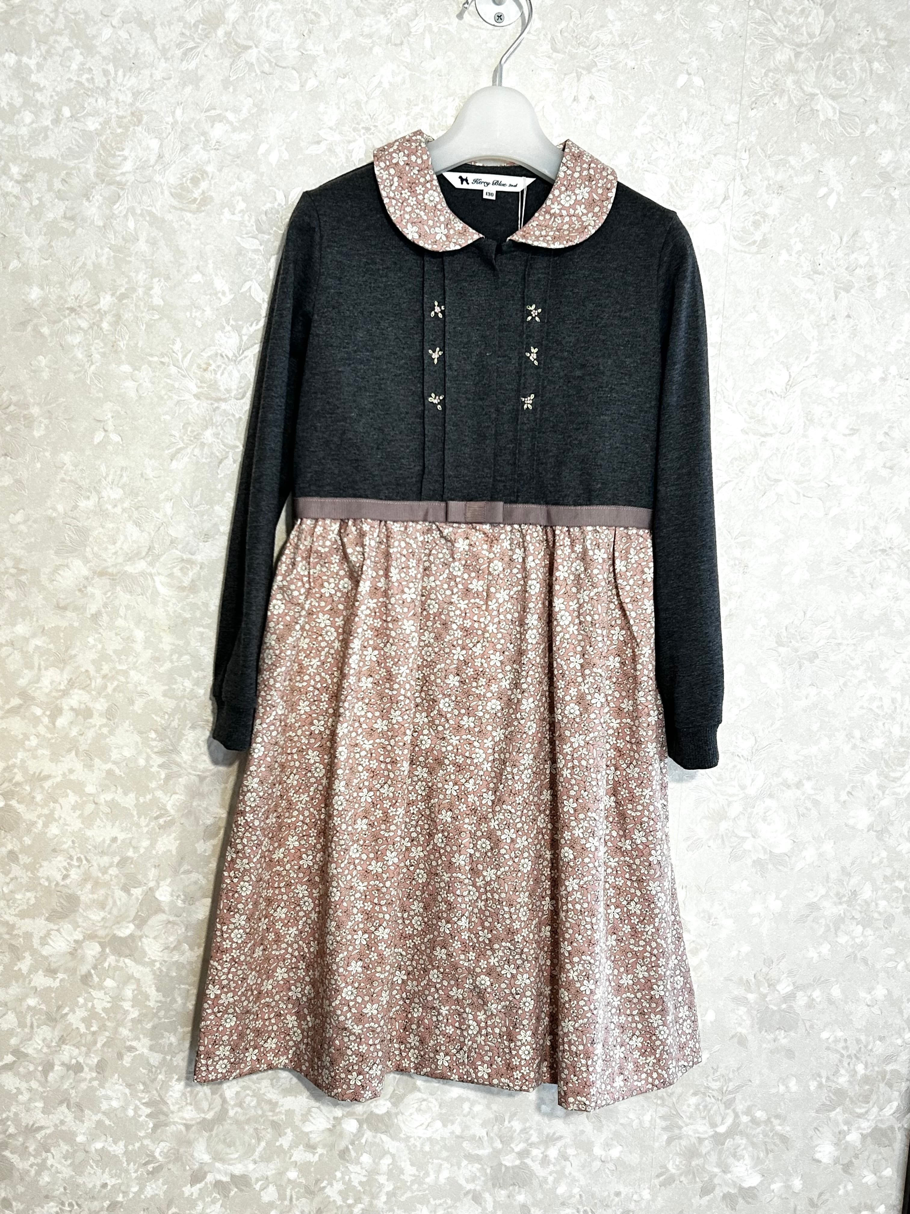 スカート部分はピンク地に白いお花柄が可愛いプリント生地を使用しています。透け感なく比較的しっかりとした生地ですので夏を除いた3シーズンお召し頂ける素材感です。制服のない学校の通学用として、普段使いの通塾用として多用途にお使いいただけるワンピースです。