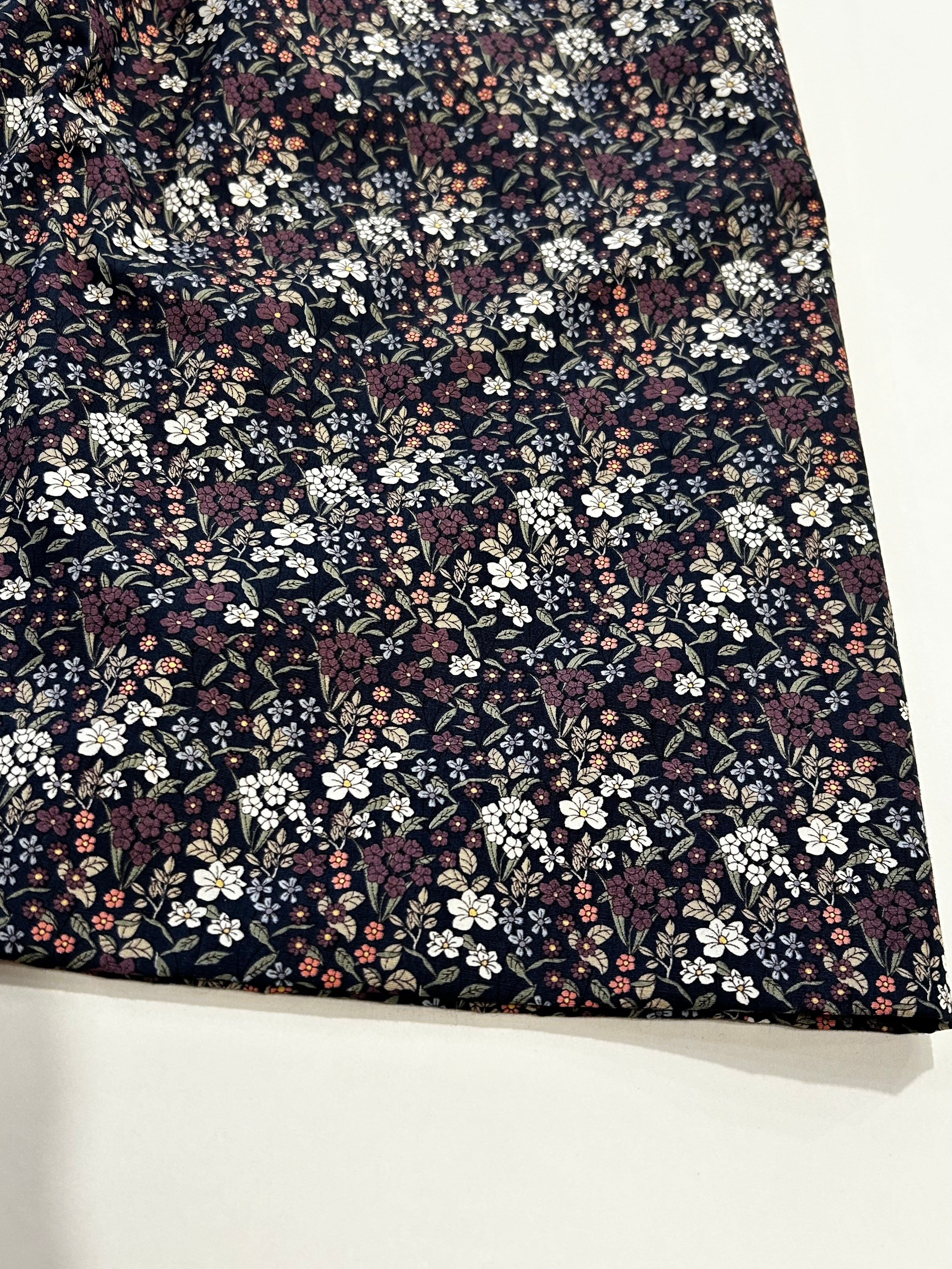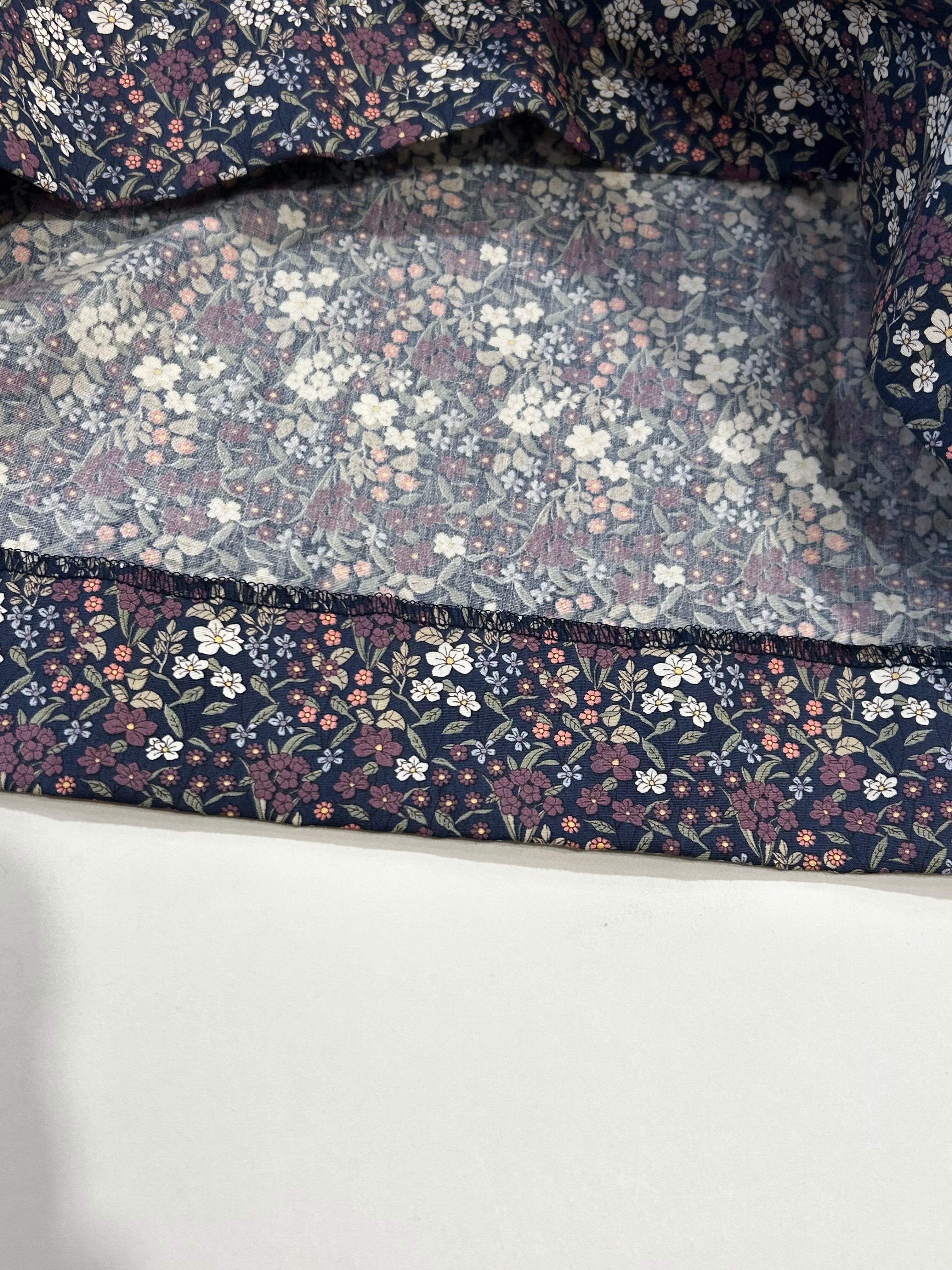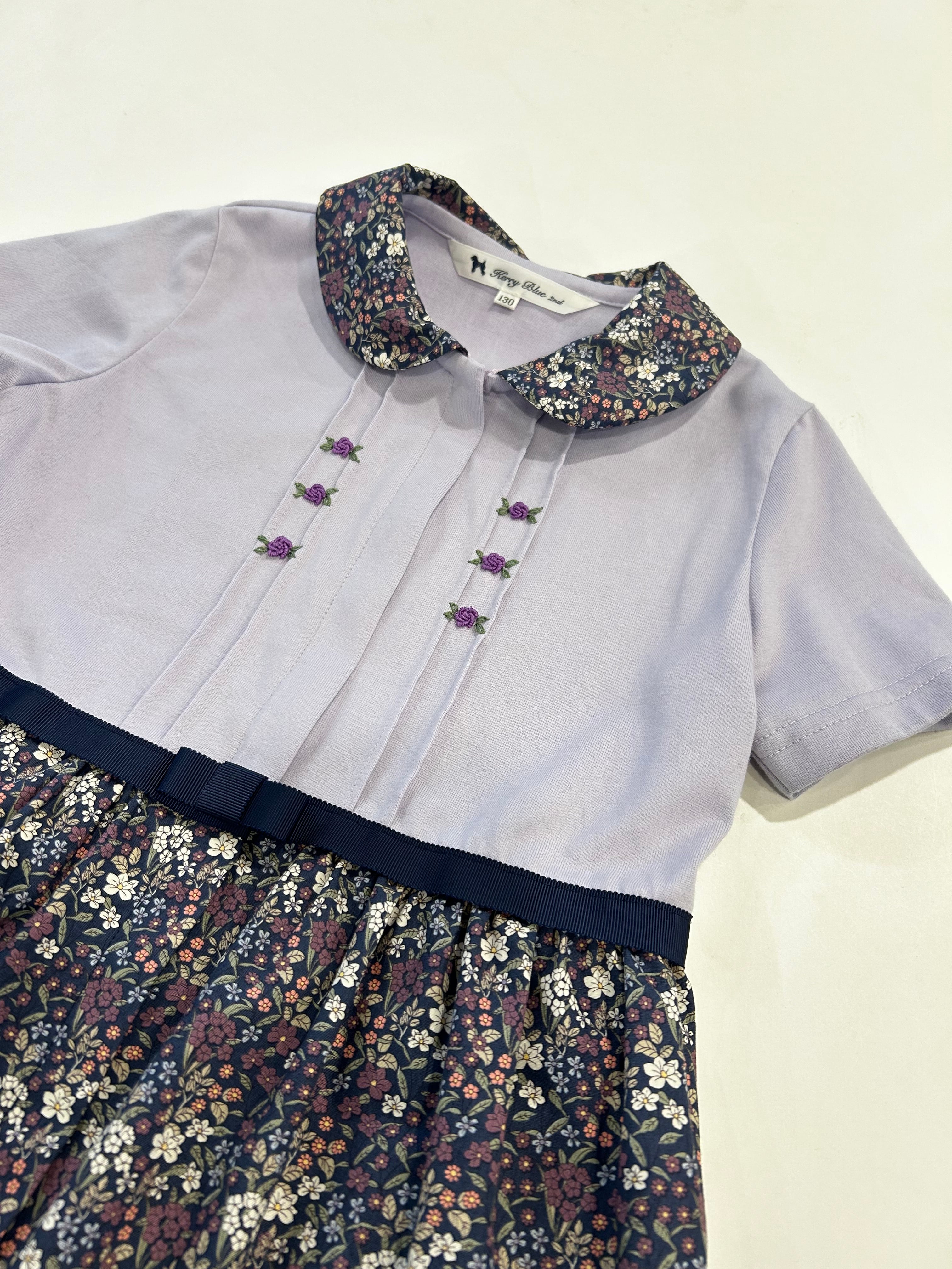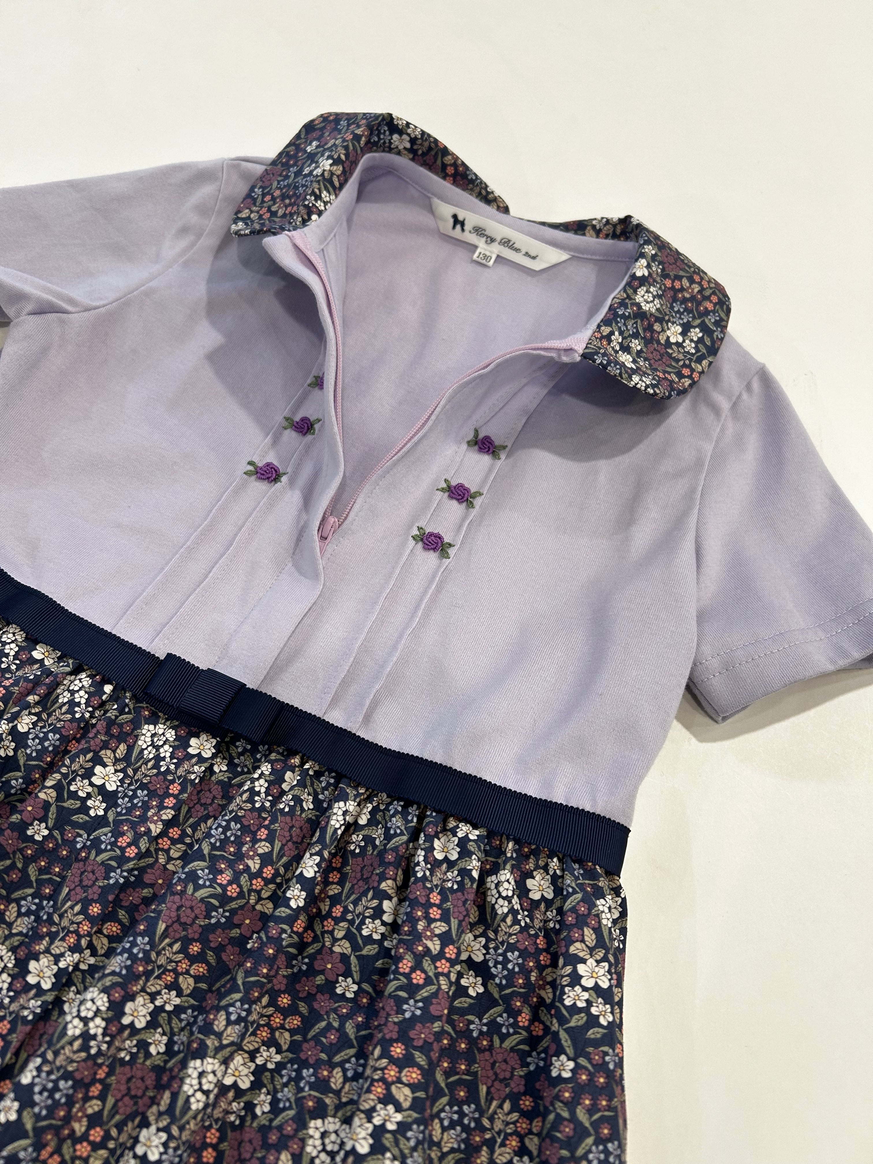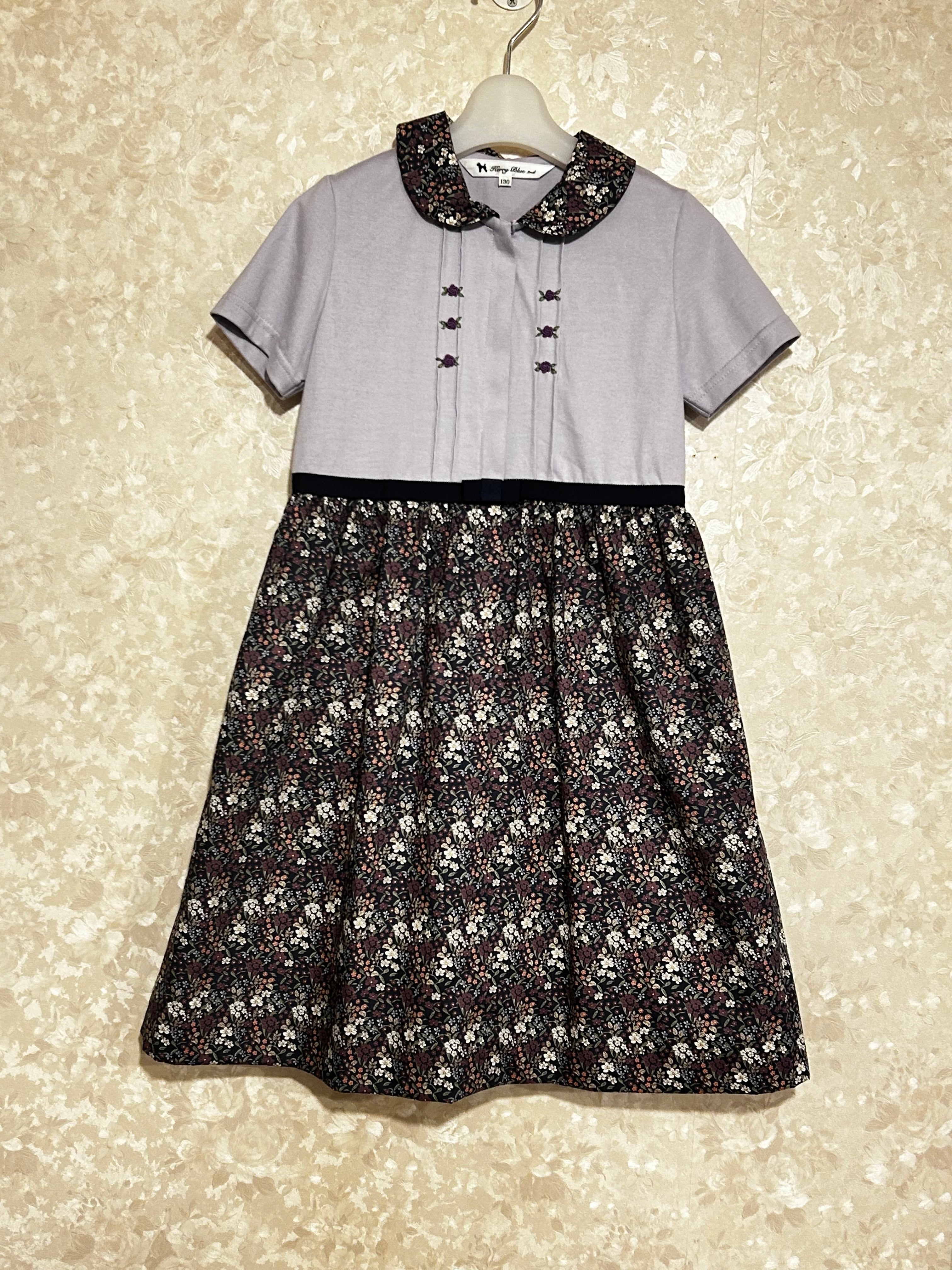 スカート部分は紺地に紫・白・ピンク等の小花柄のプリント生地を使用しています。シック可愛い生地は襟と共布になっています。カーディガンやタイツを合わせて頂きますとオールシーズンお召し頂ける素材感です。制服のない学校の通学用として、普段使いの通塾用として多用途にお使いいただけるワンピースです。