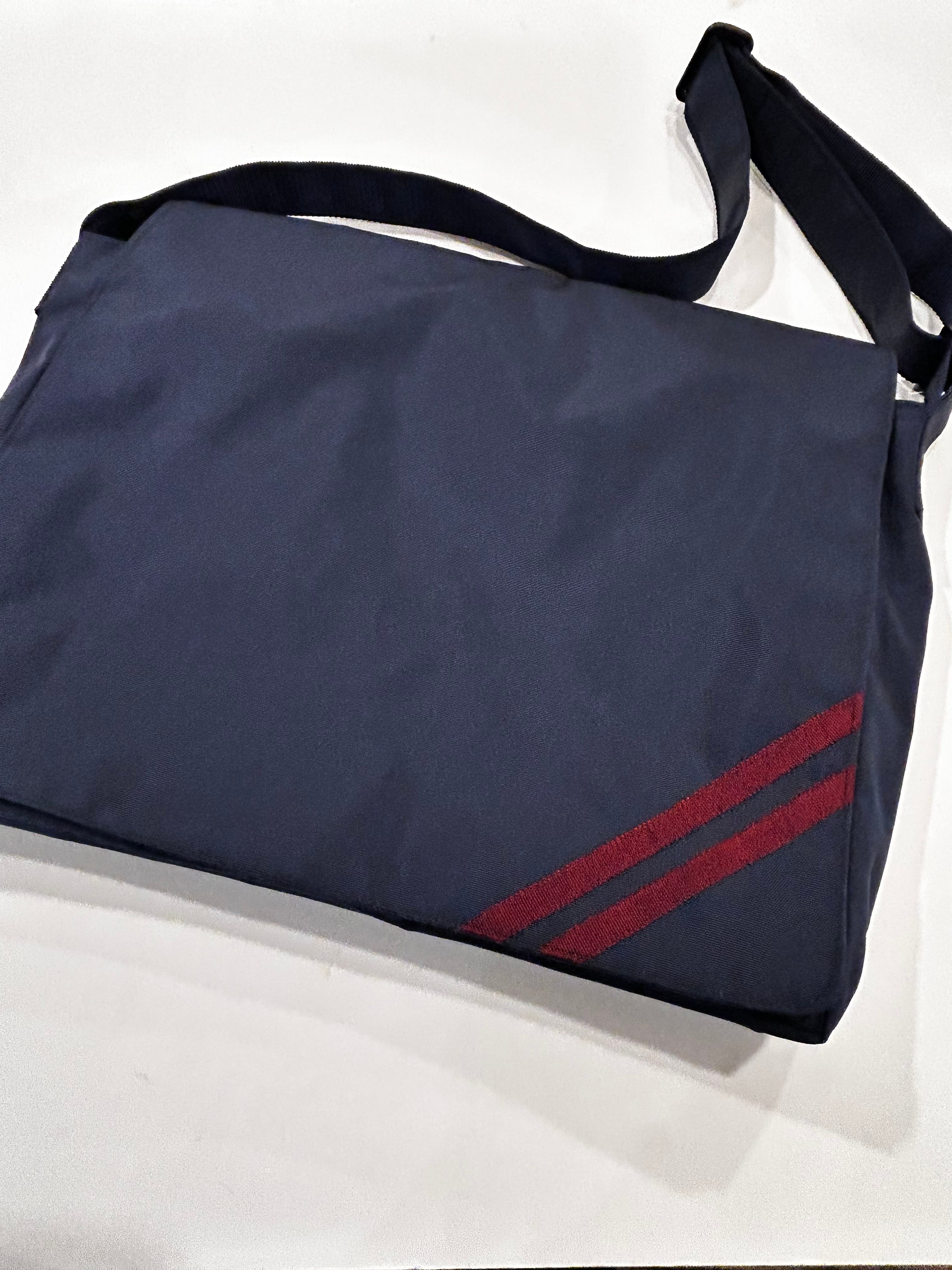 上質なナイロン素材にエンジのグログランテープを2本施したデザインのショルダーバッグです。少々の雨でも安心な素材です。