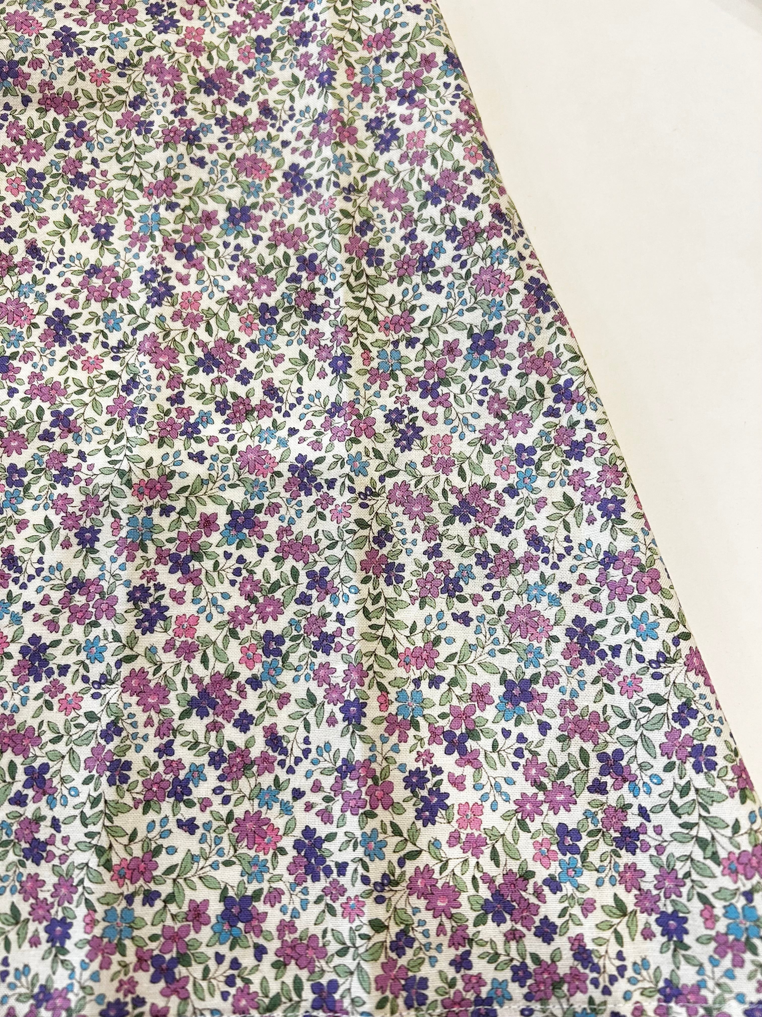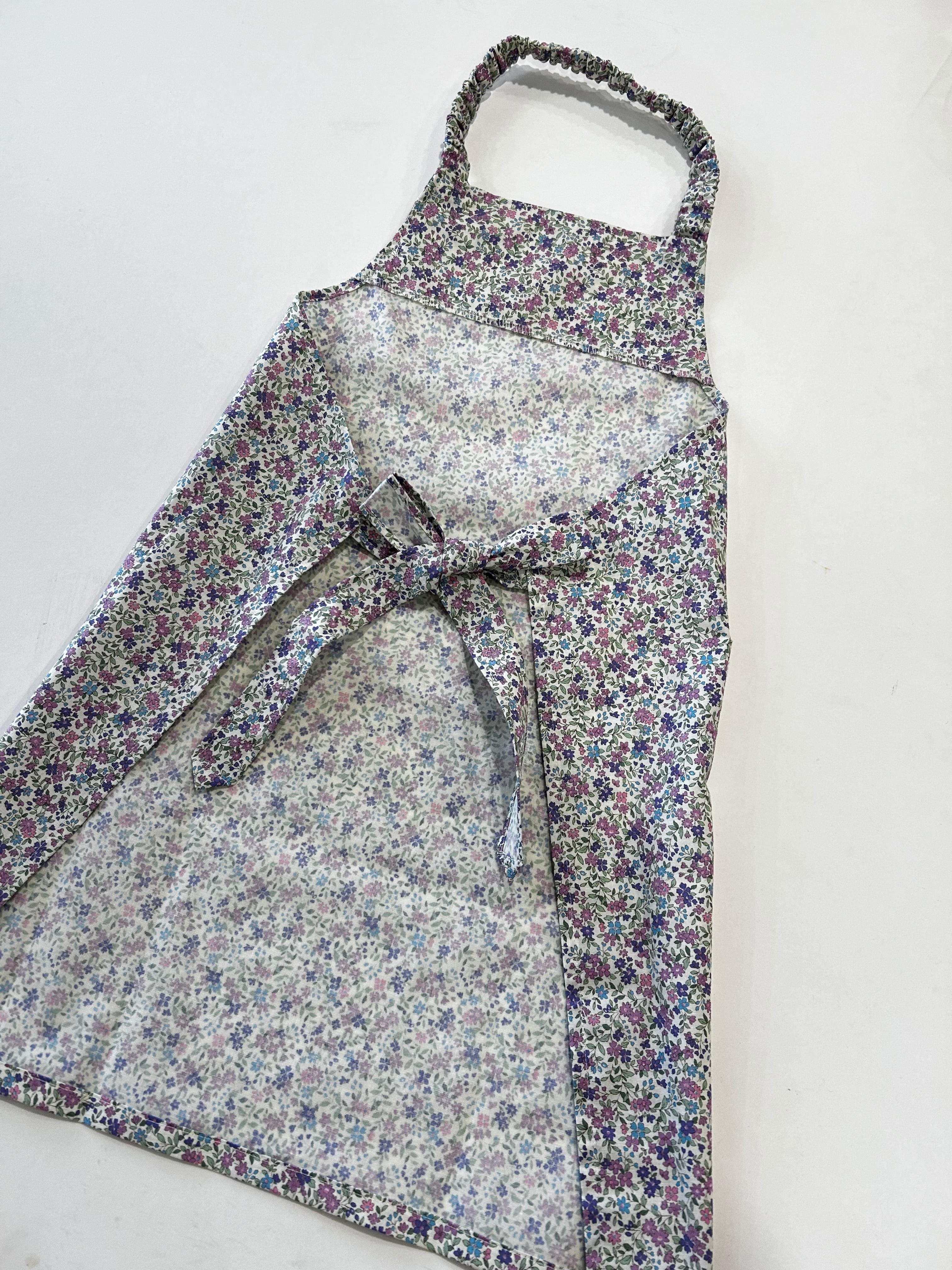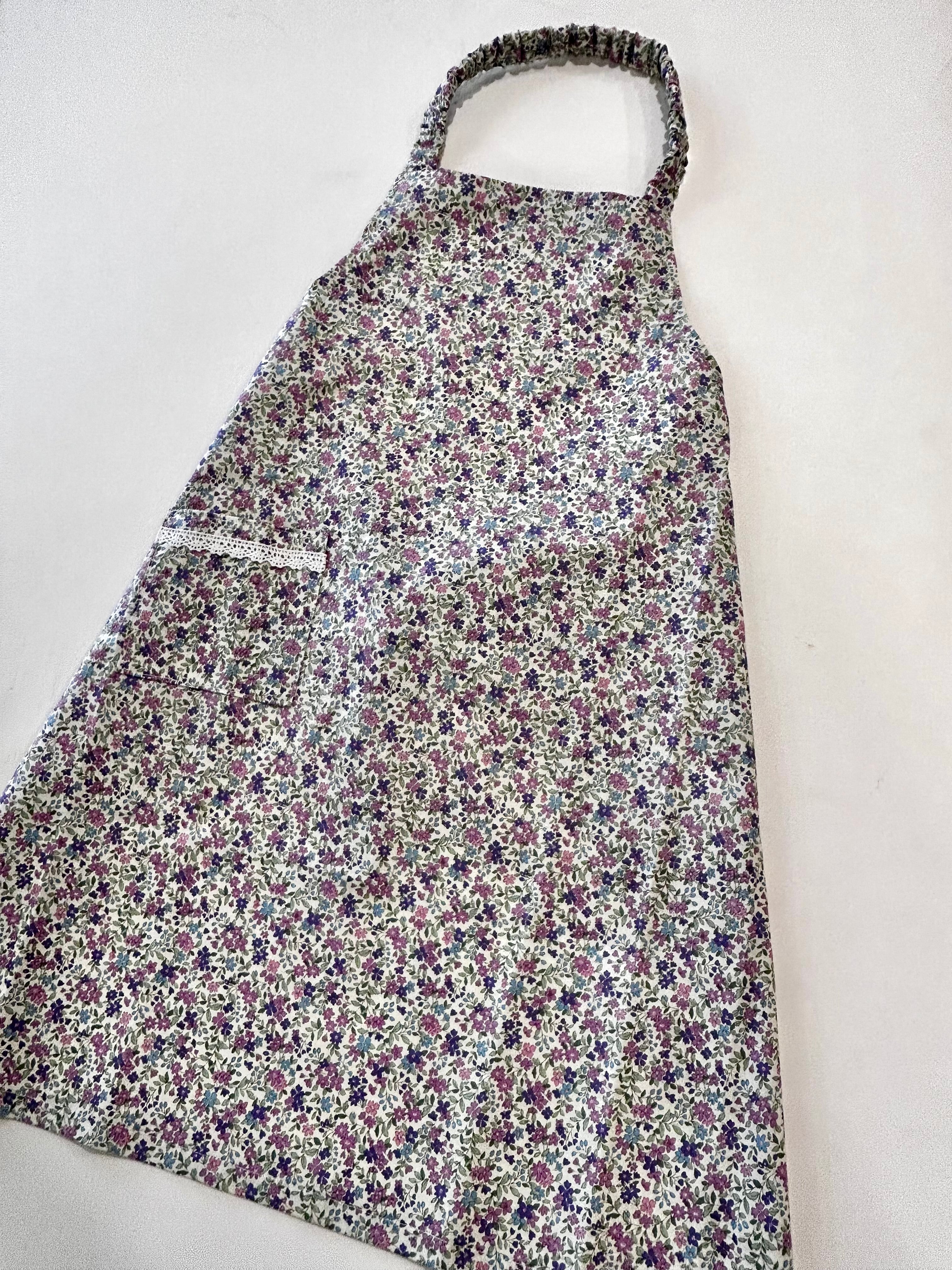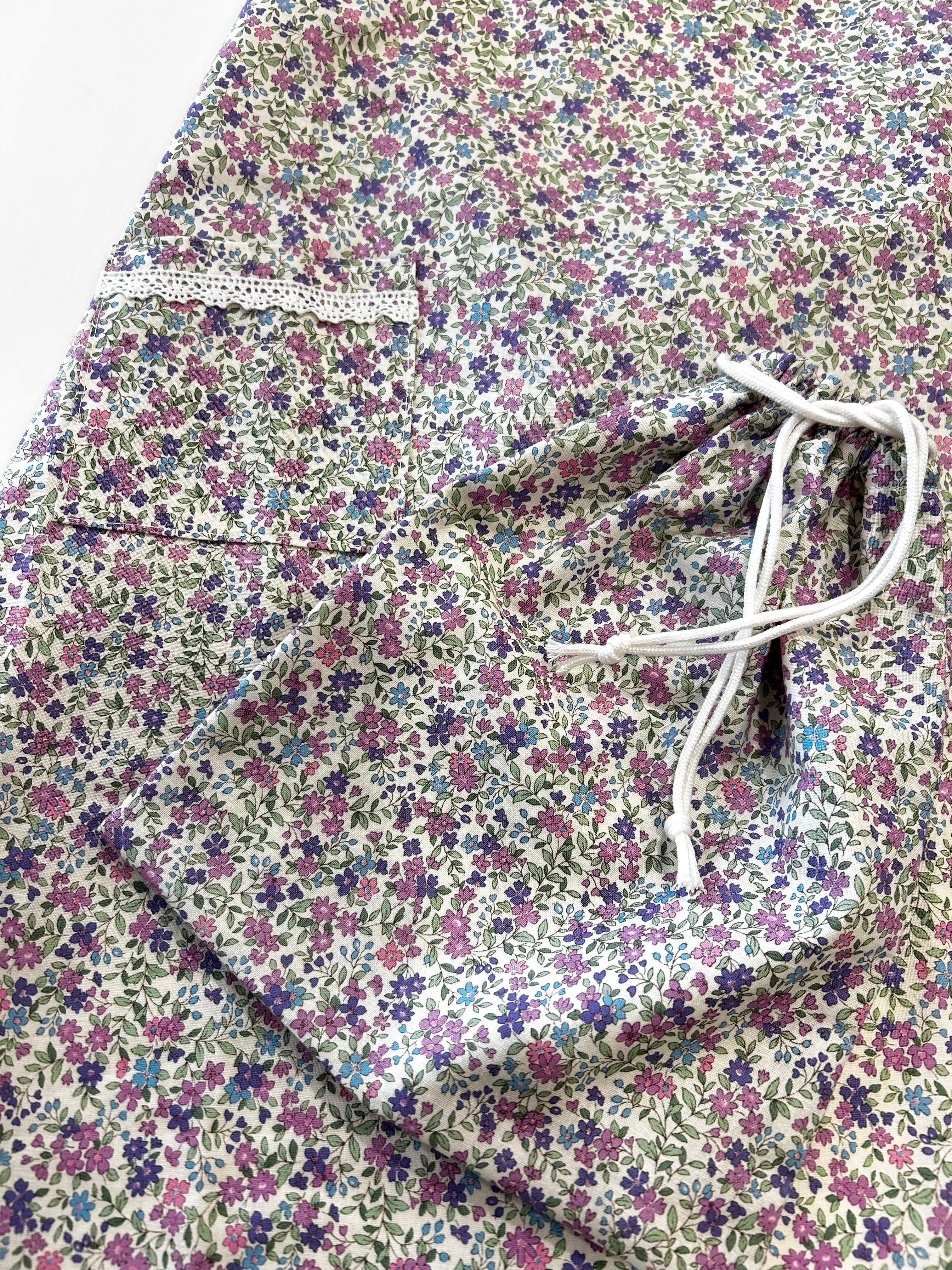 パープルの小花柄が可愛い巾着つきのエプロンです。
