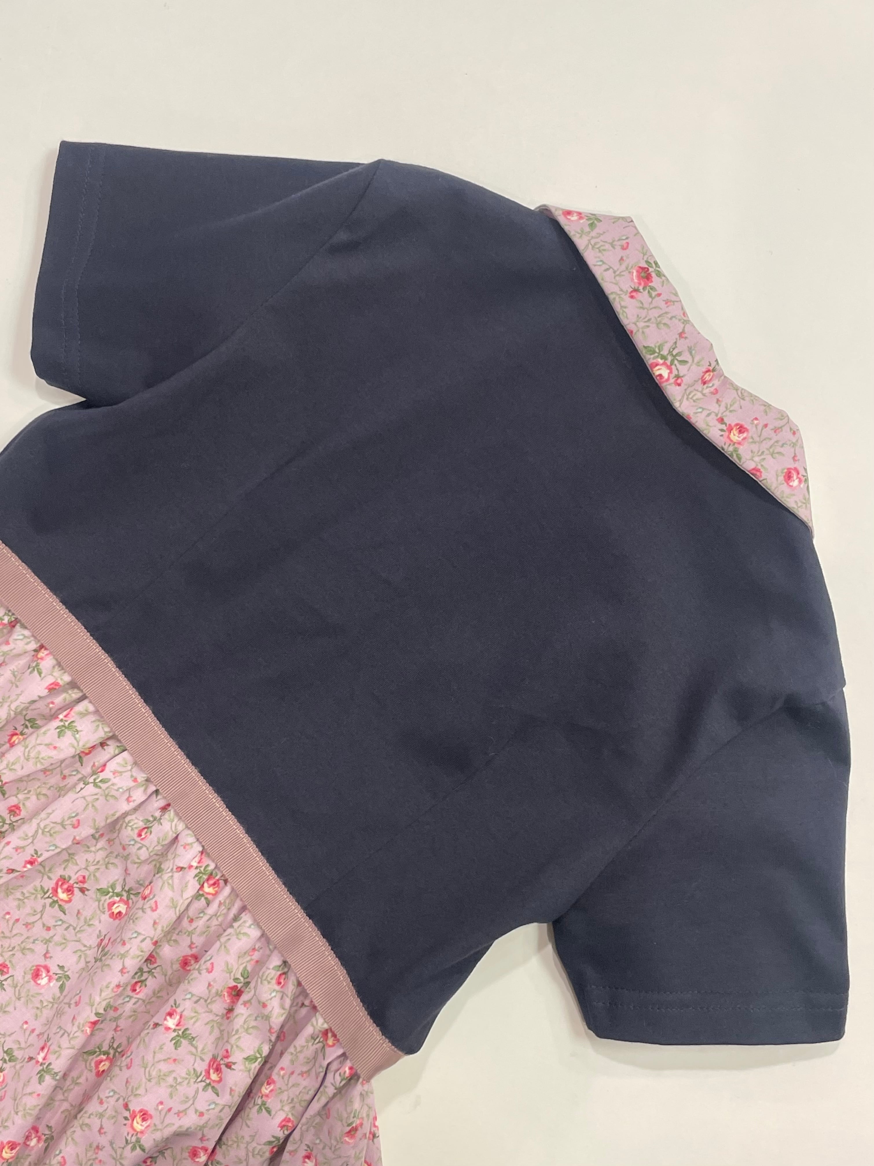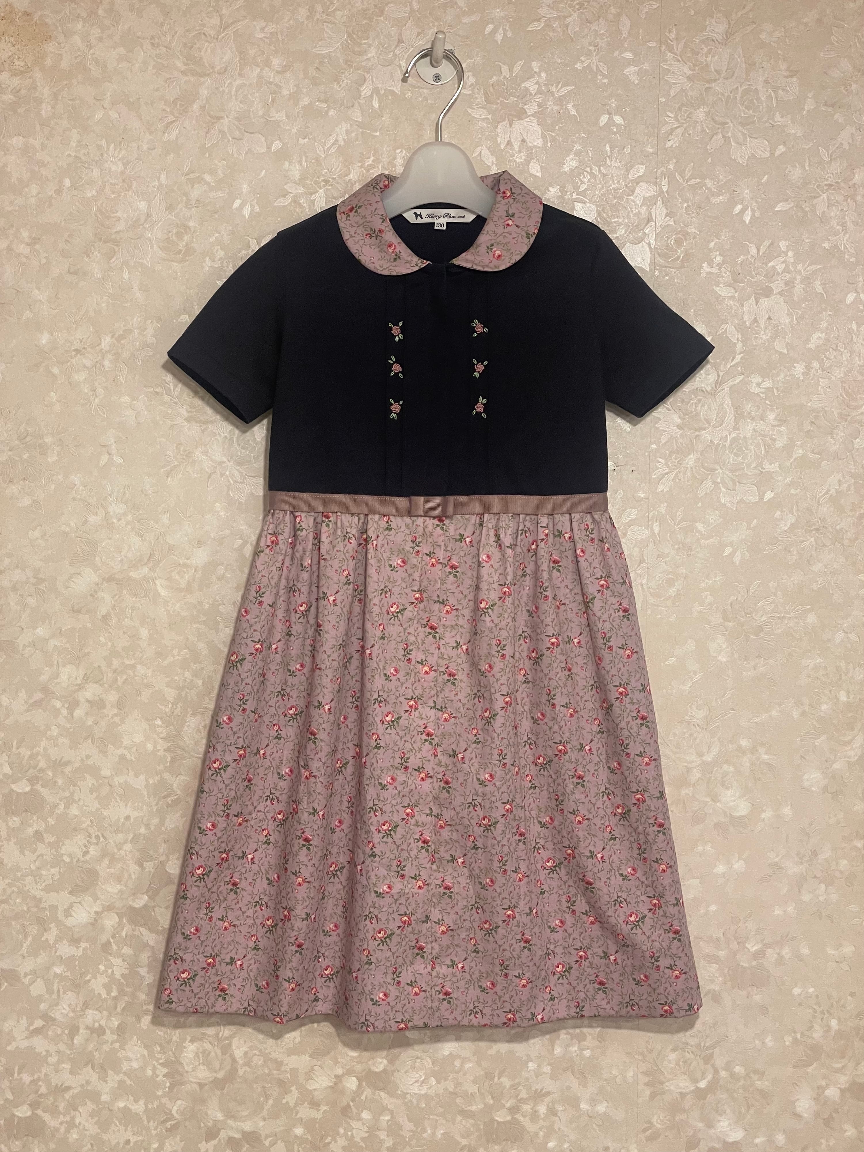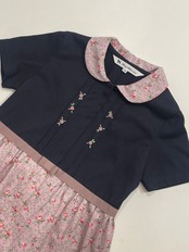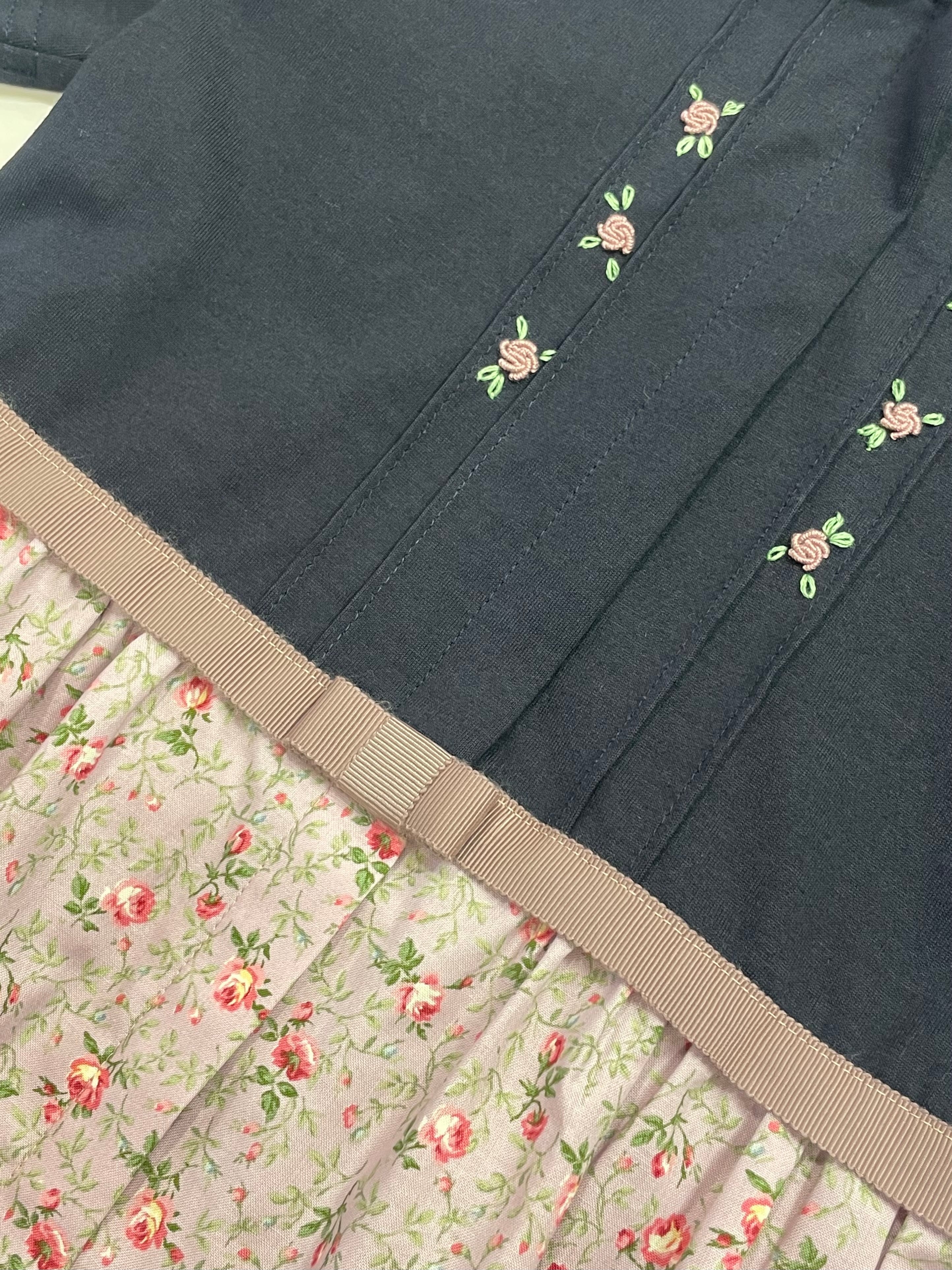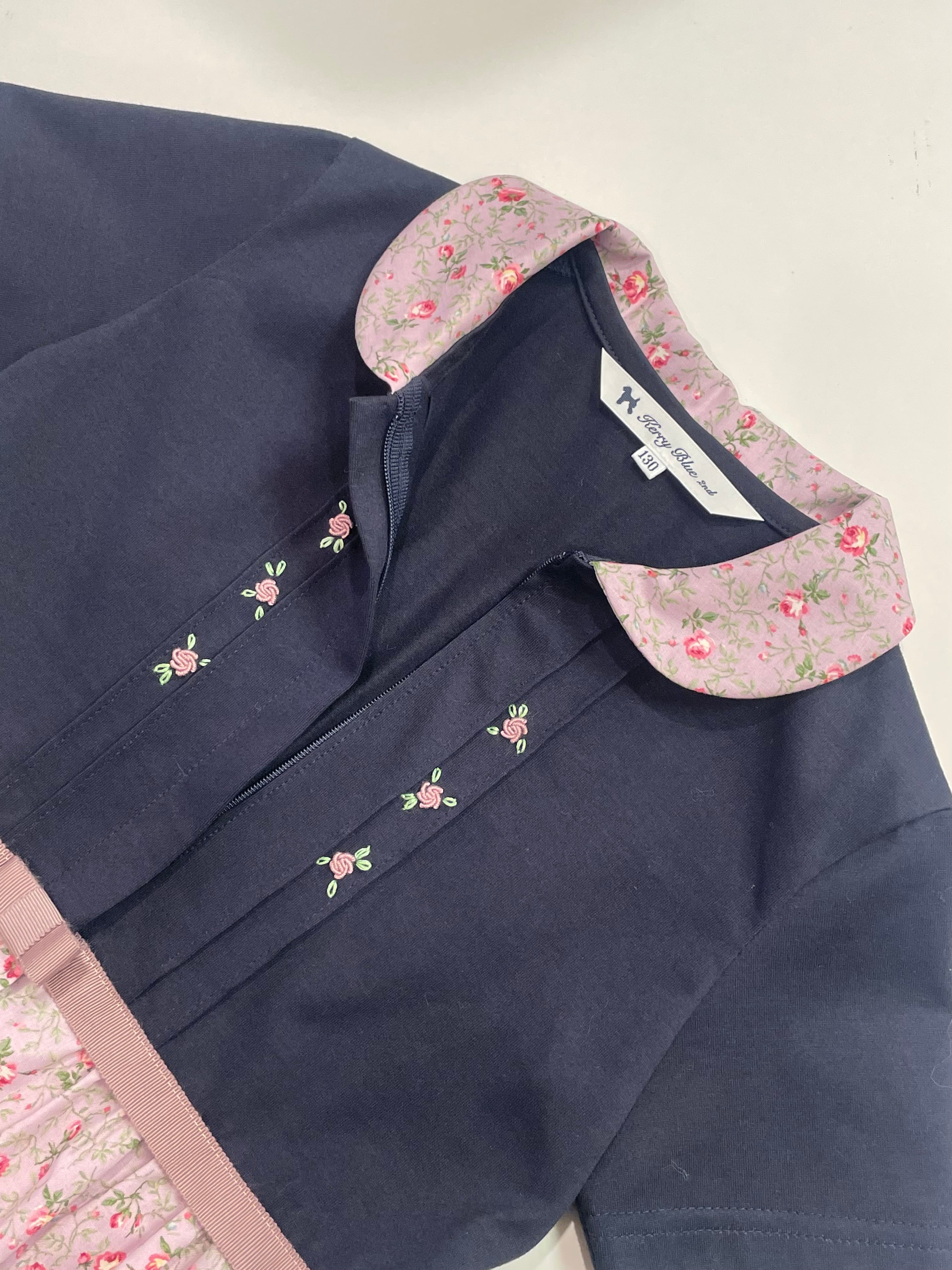 紺の前身頃にはピンタックを施しシックなピンクのバリオンローズ刺繍をおつけしました。両サイドにポケット付きです。