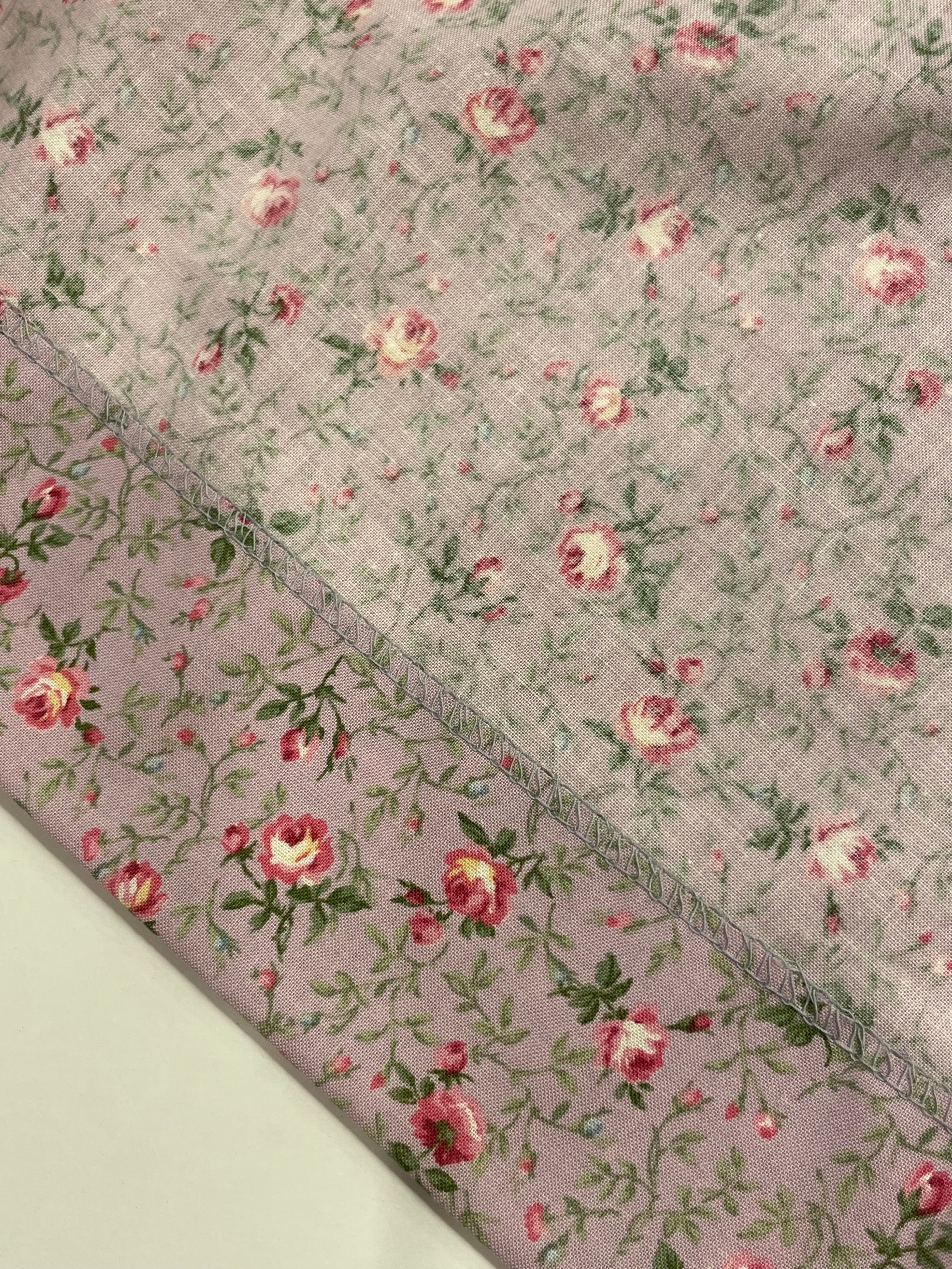 パープル系のピンク地にピンクの薔薇のような柄が可愛いプリント地を使用しています。襟も花柄の共布で仕上げています。春・夏・秋とお召し頂ける素材感です。