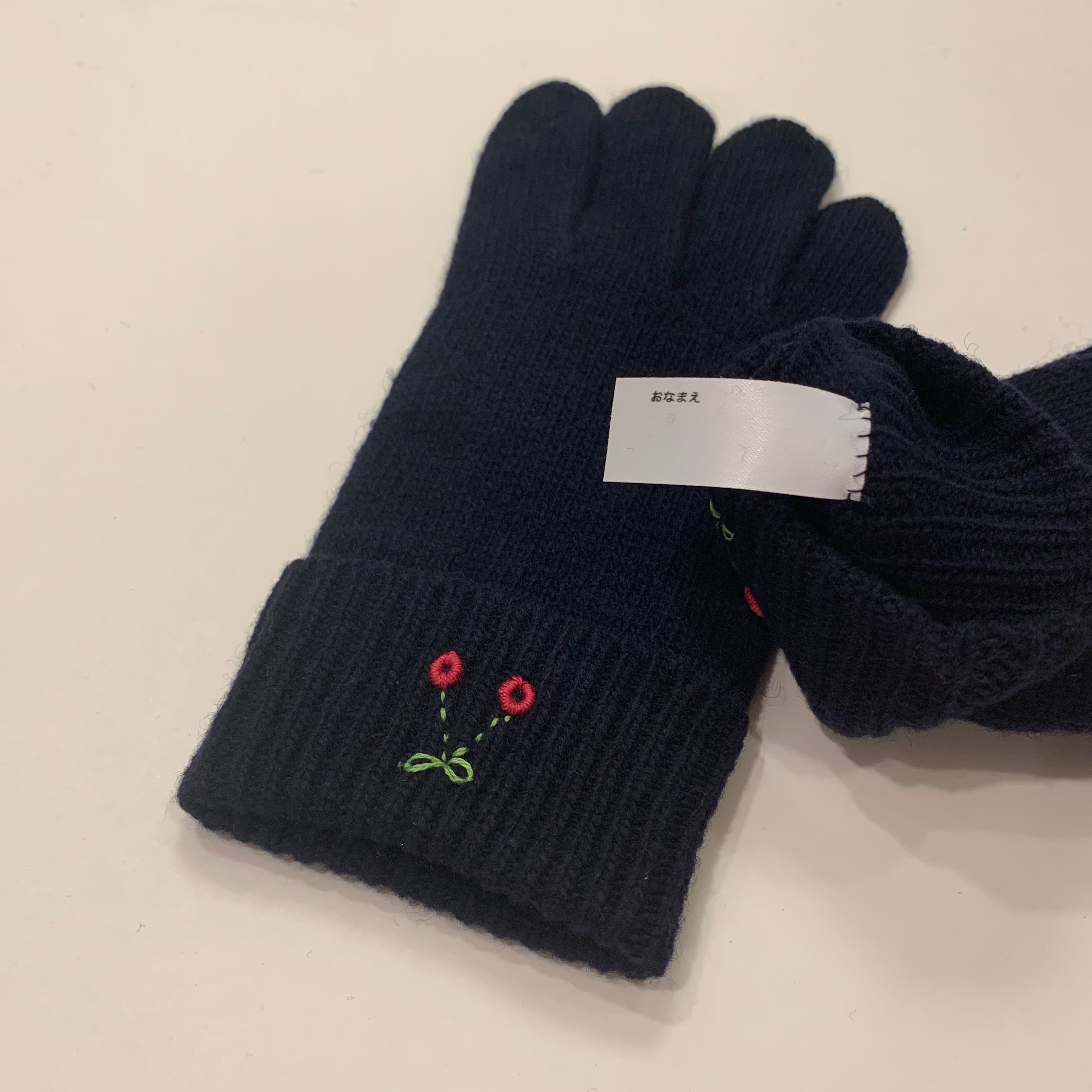 濃紺の五本指ニット手袋です。内側にはおなまえタグが付いています。