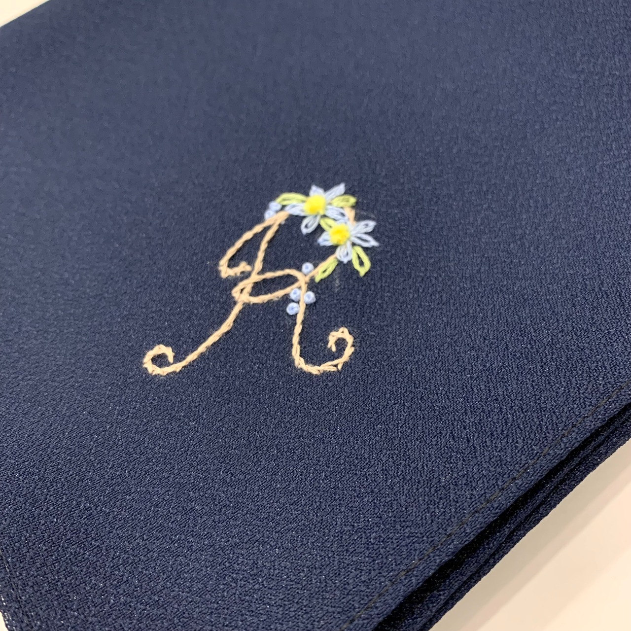 ワンポイントにイニシャルRに可愛らしいお花の刺繍をおつけしました。ポリエステルのシワになりにくい濃紺の生地を使用しています。