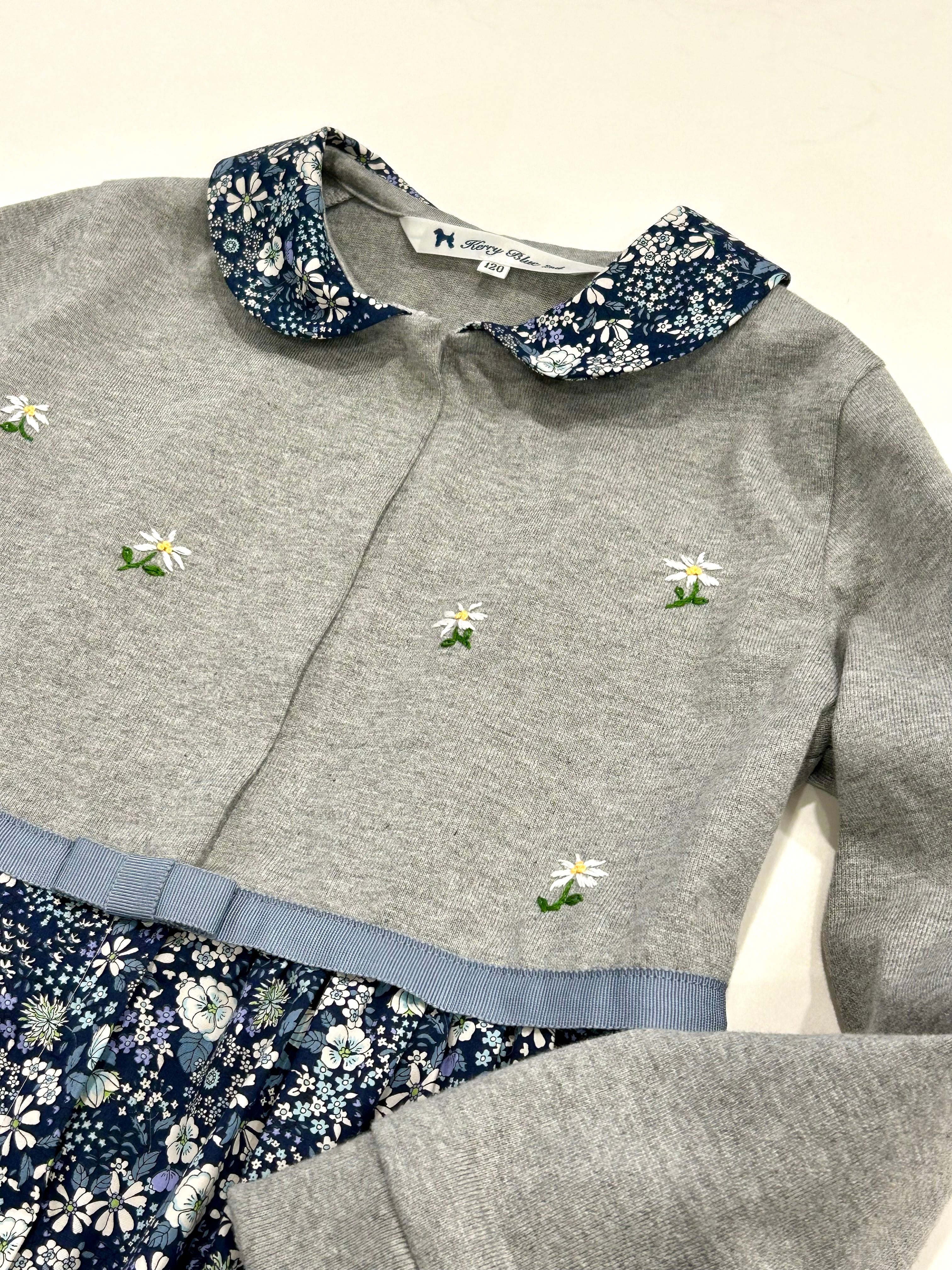 襟とスカート部分は紺地に白とブルーの花柄でキリリとした中に優しい雰囲気がある生地を使用しています。通年お召し頂ける素材感です。厚手の花柄ではないですが冬はグレーのタイツを合わせても可愛いと思います。袖口のリブ編みも人気です。