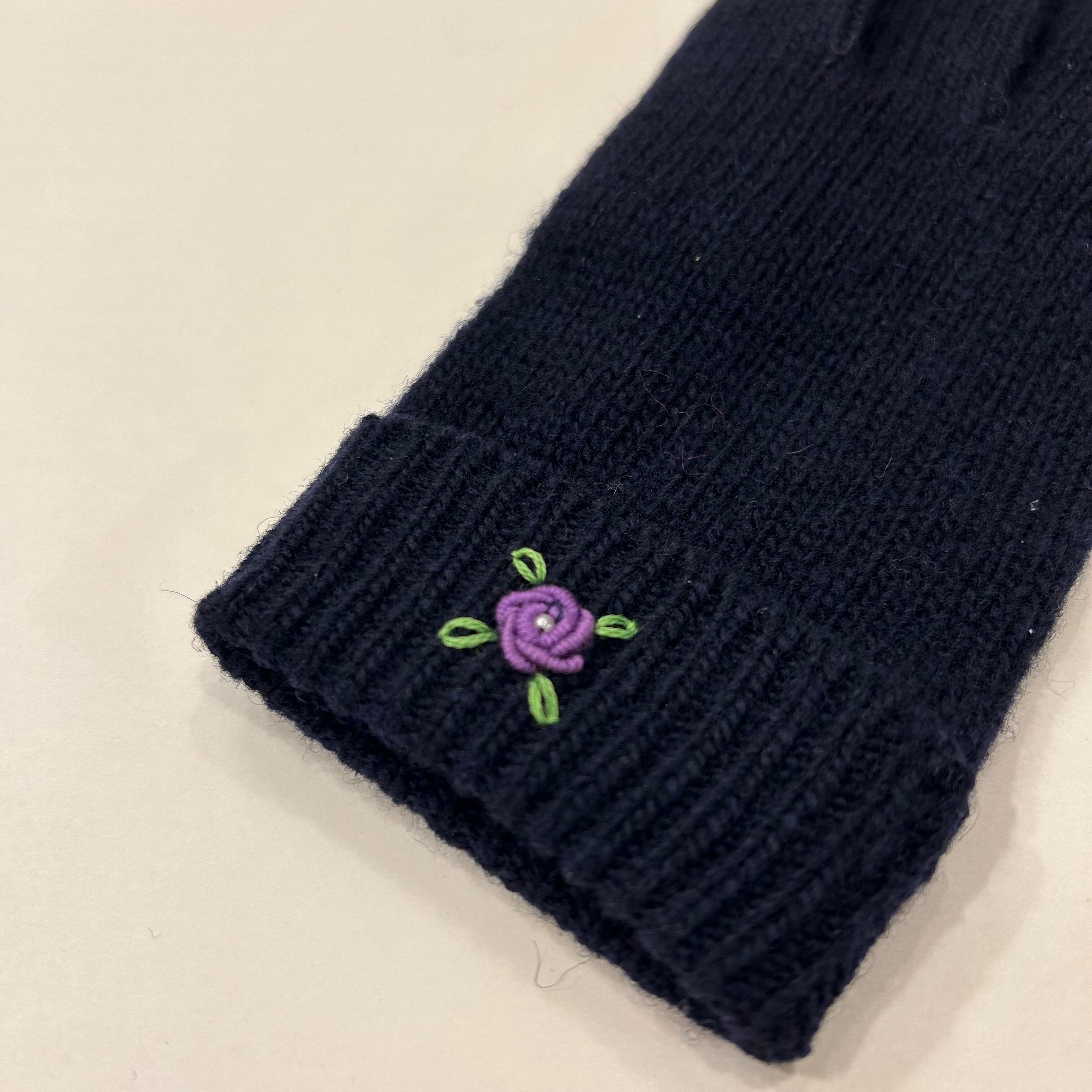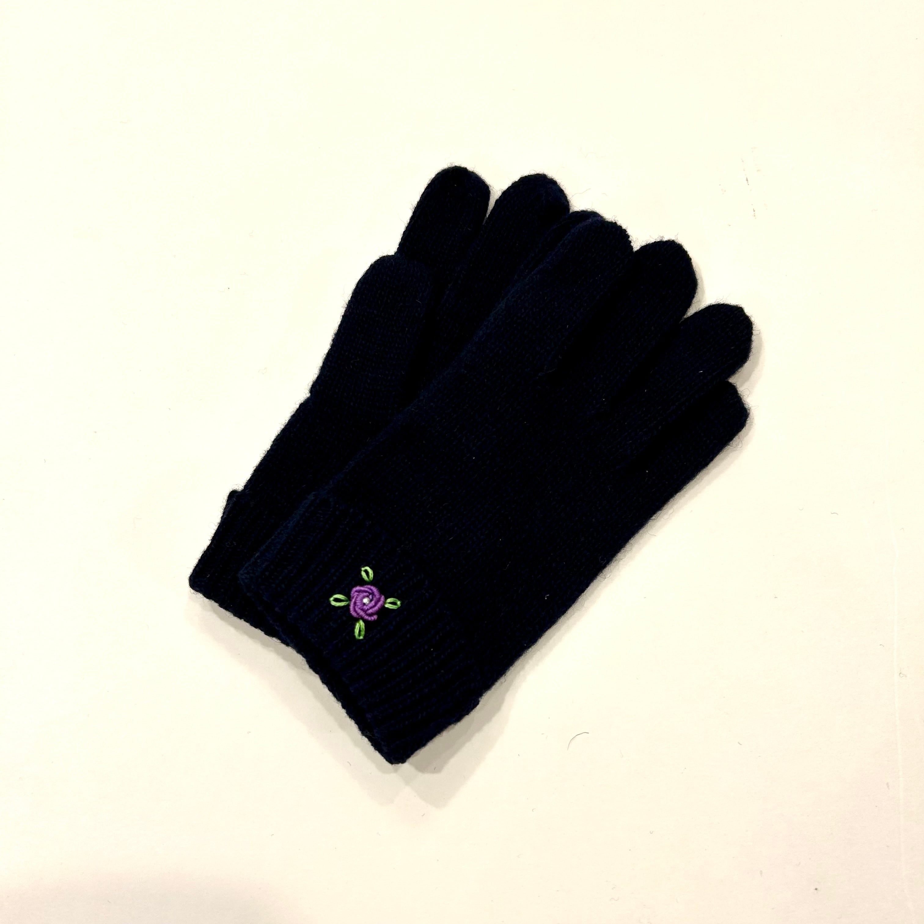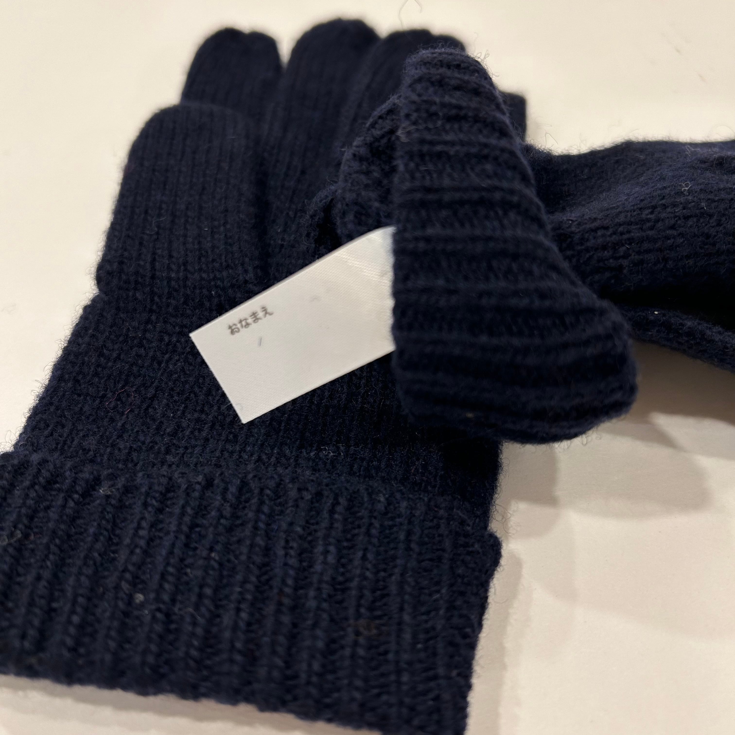 濃紺の五本指ニット手袋です。内側にはおなまえタグが付いています。